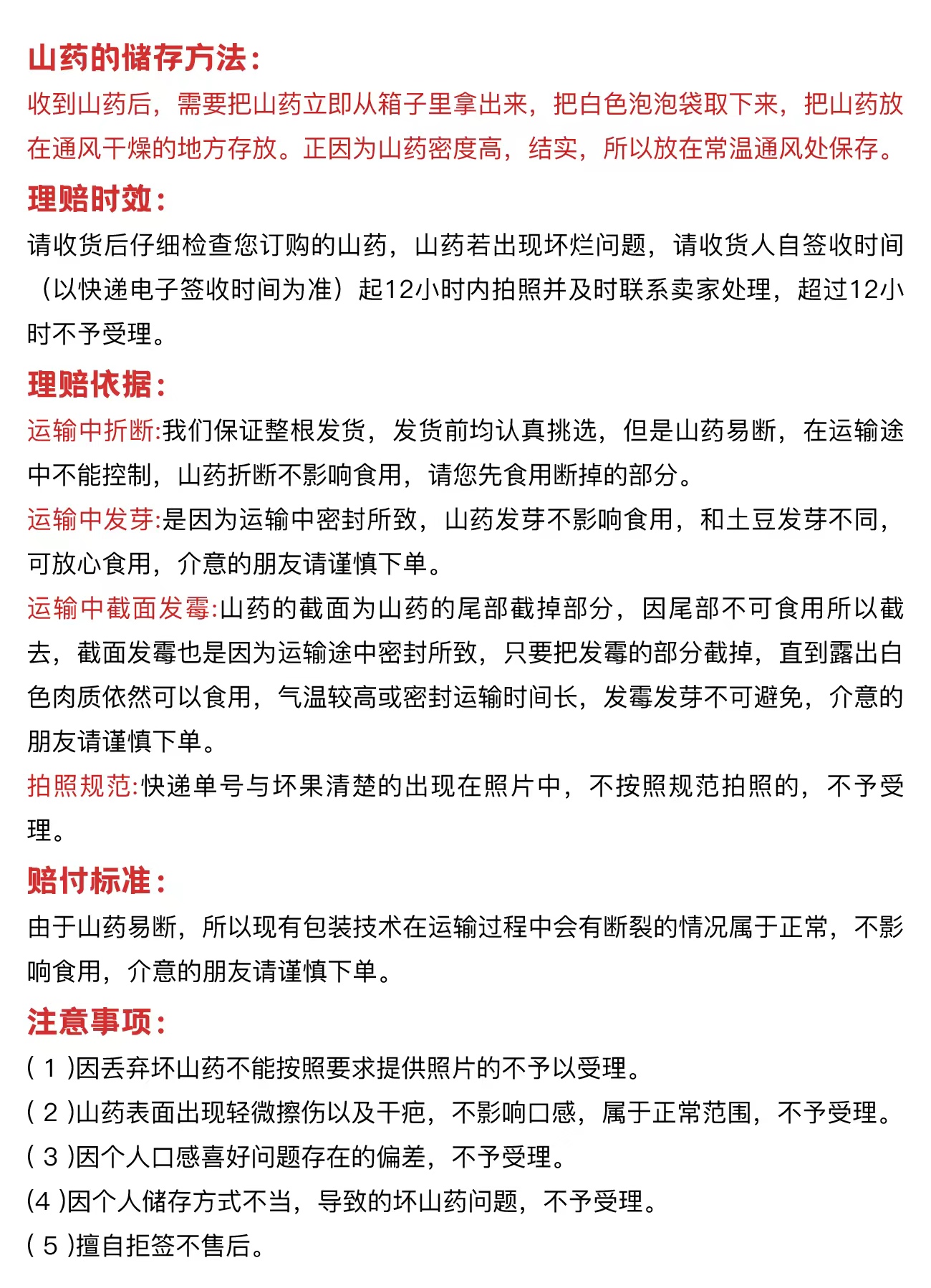 【赔付标准】:由于山药易断,运输过程中会有轻微断裂的情况属于正常,不影响食用,介意的朋友请谨慎下单