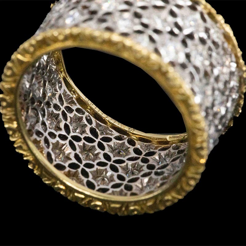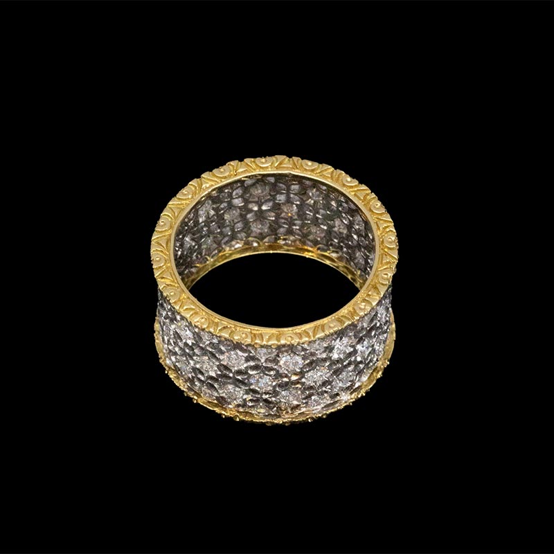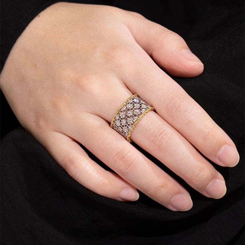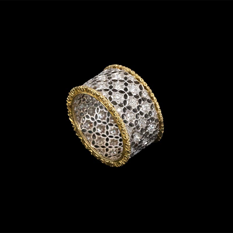 20世纪意大利珠宝工坊布契拉提出品Scacchi款式花叶造型18K黄金及白金镂雕镶嵌钻石戒指