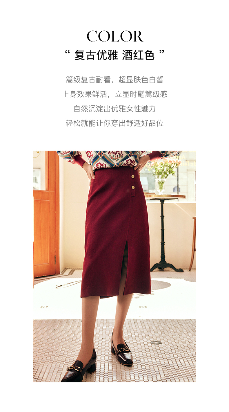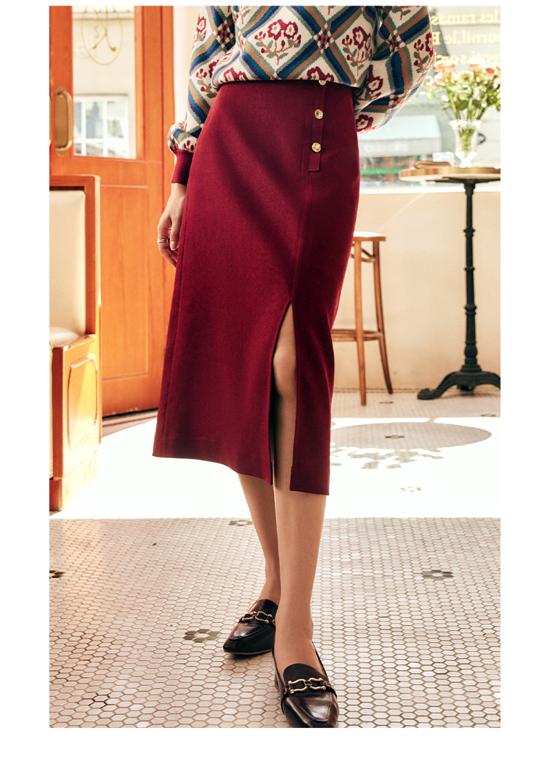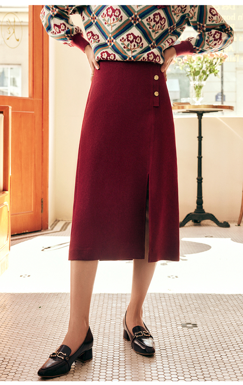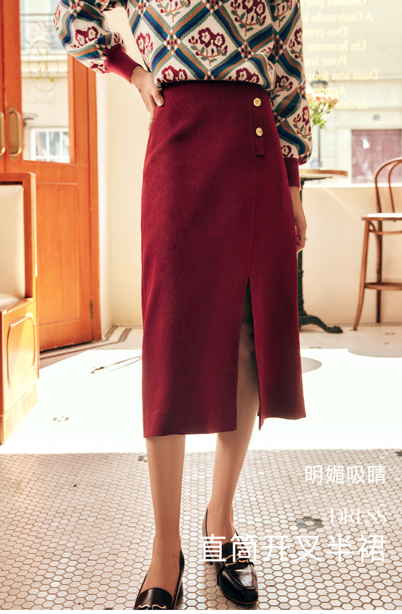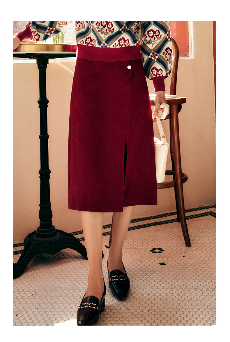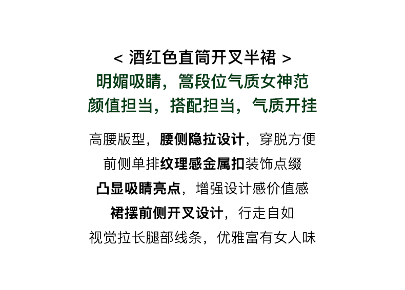 OLrain欧芮儿法式酒红色半身裙女秋季2022新款开叉直筒中长款裙子