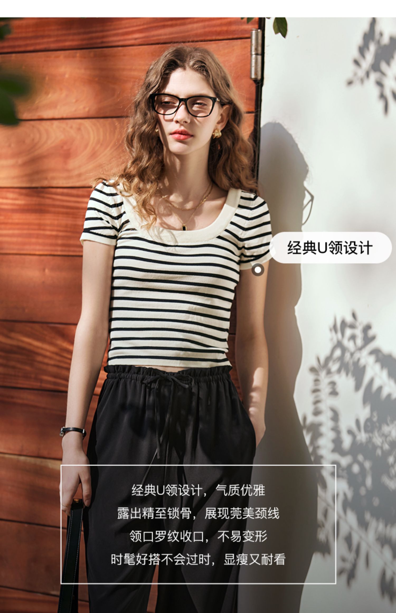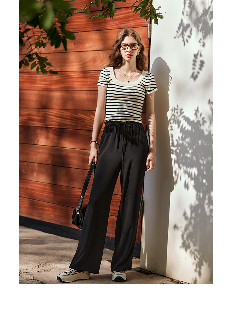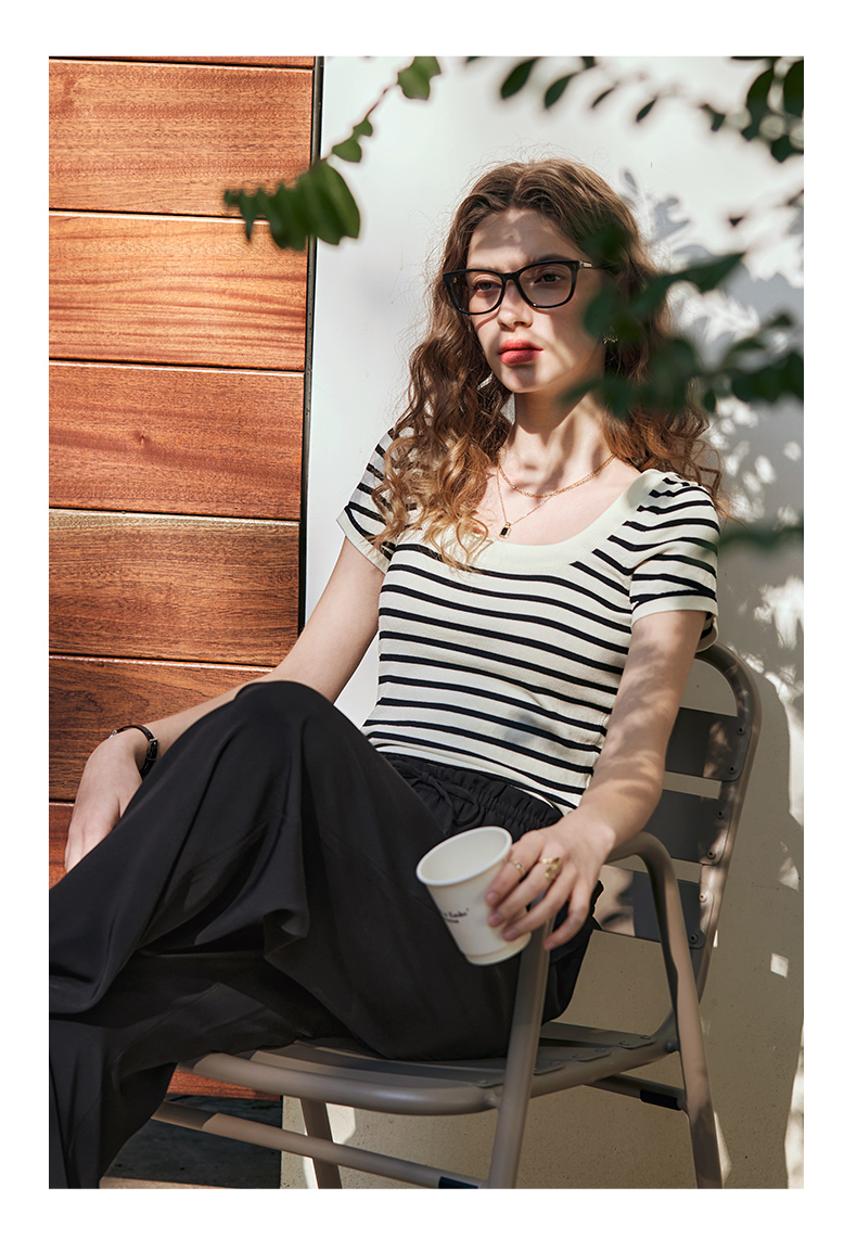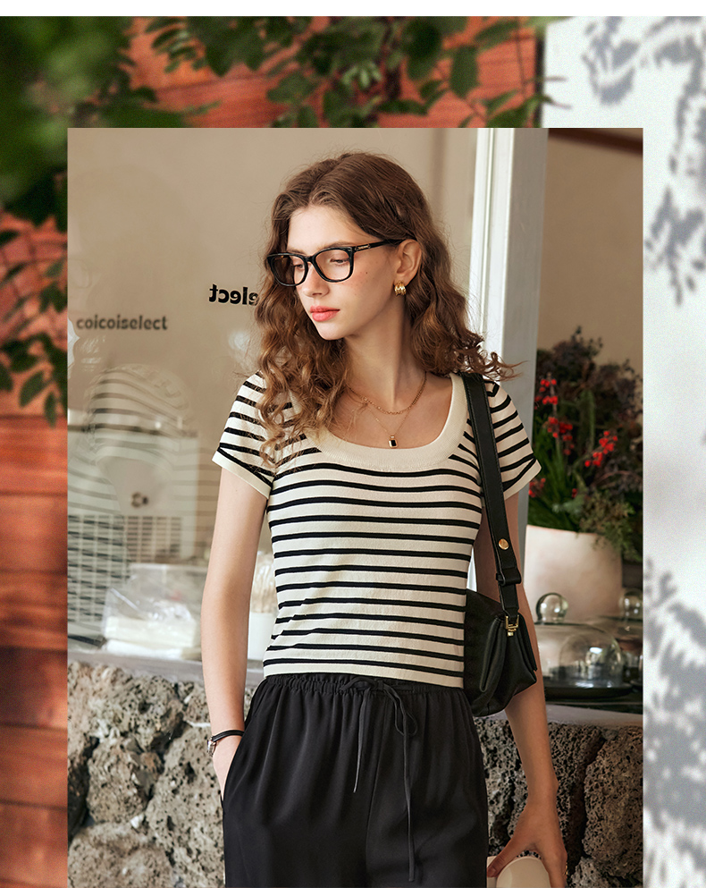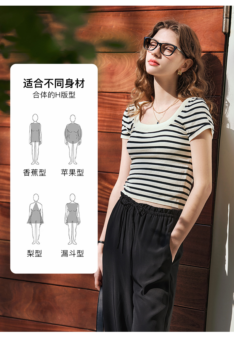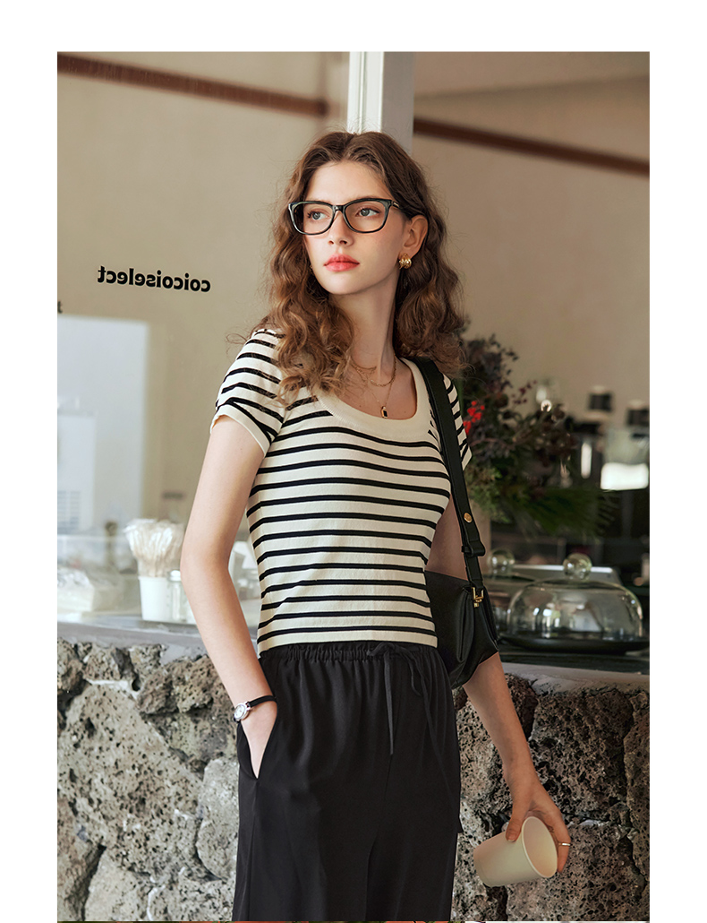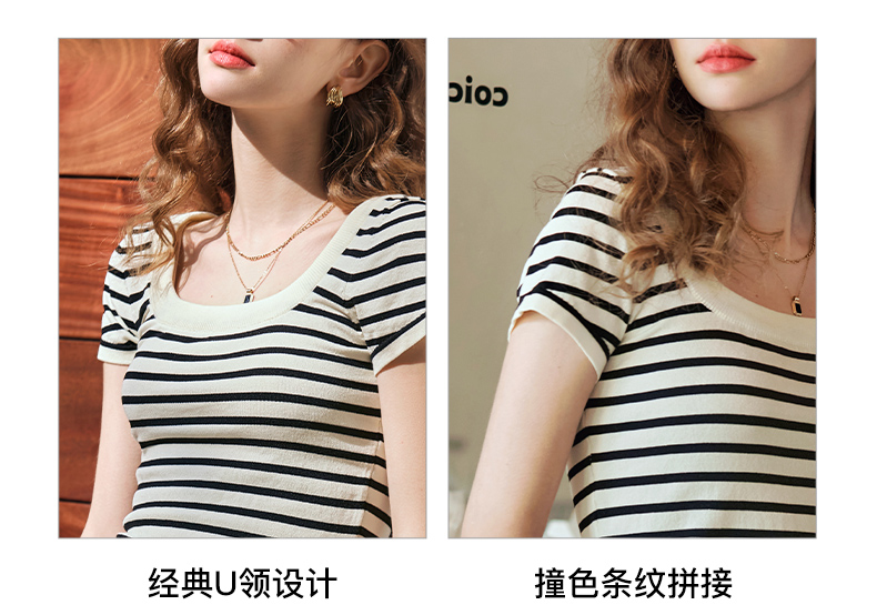 OLrain欧芮儿黑白条纹针织衫女早春2024年新款正肩冰丝短袖T恤