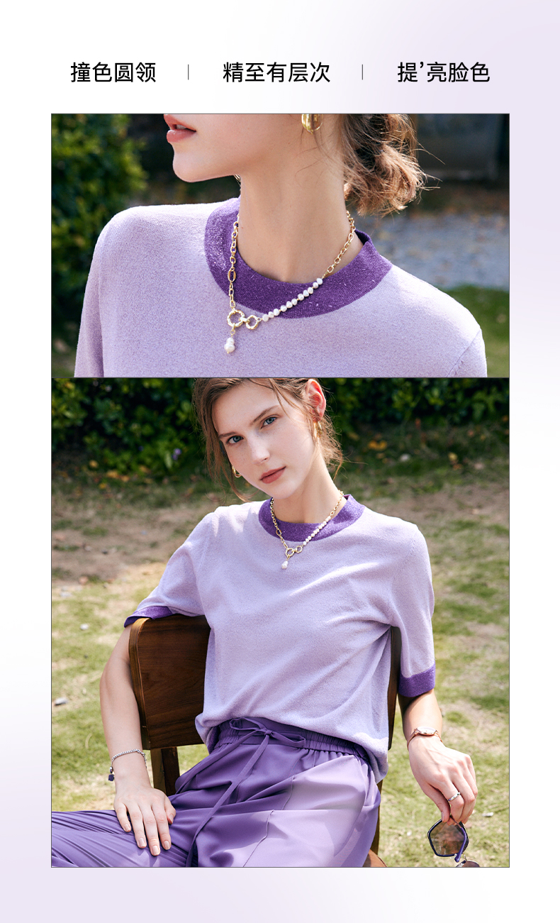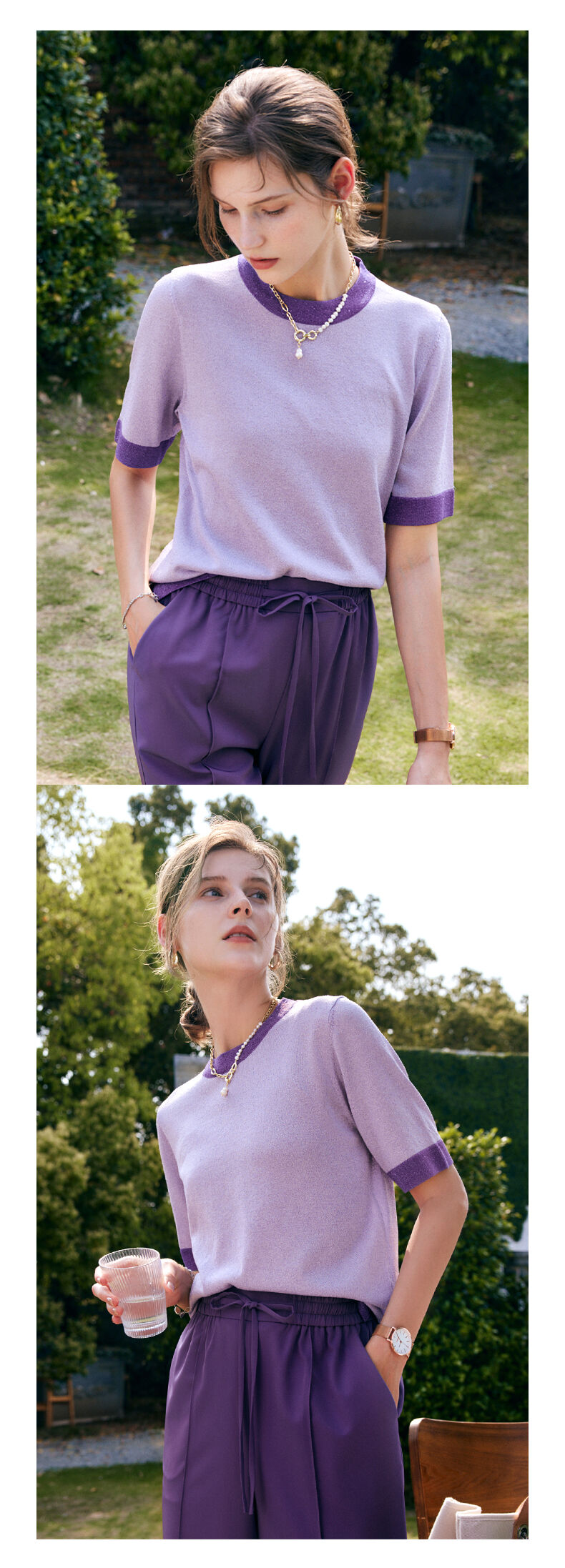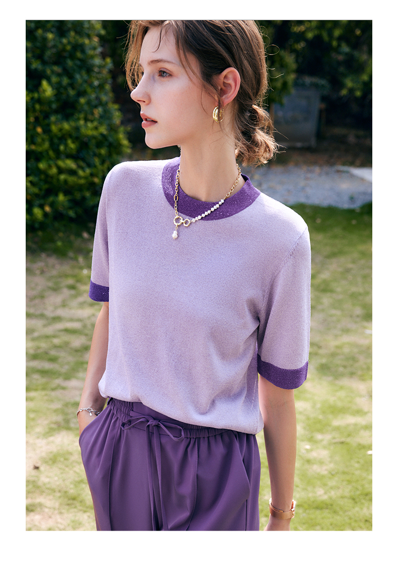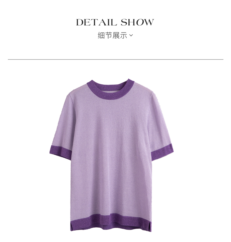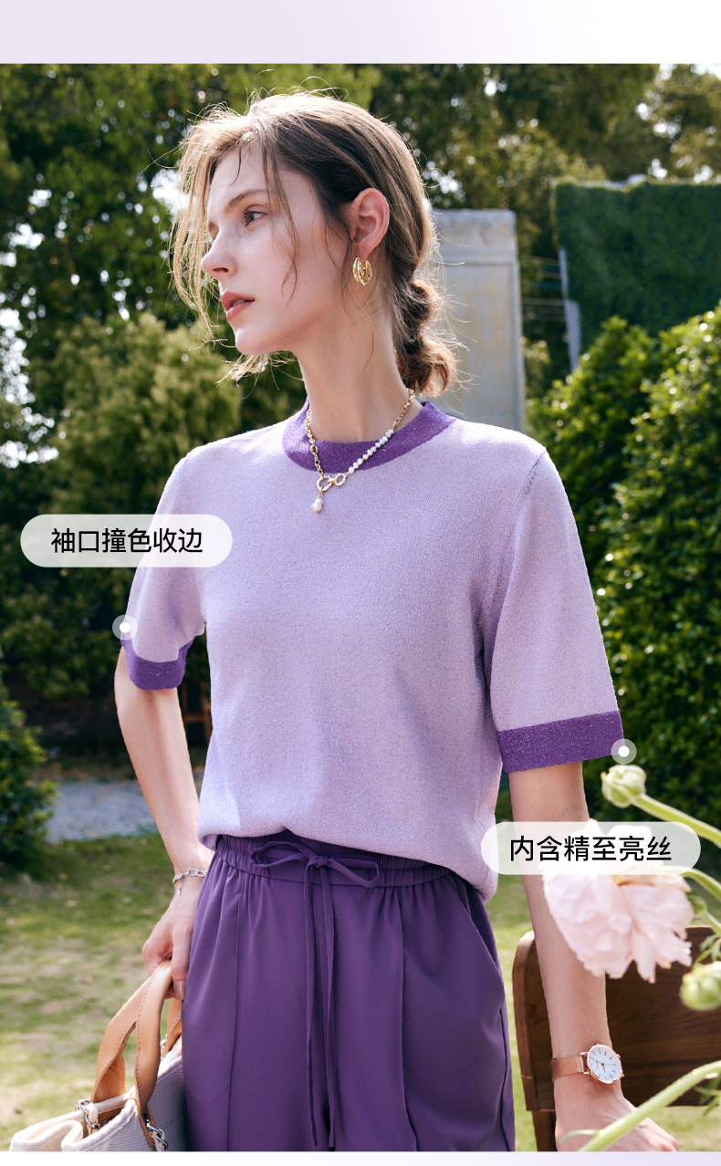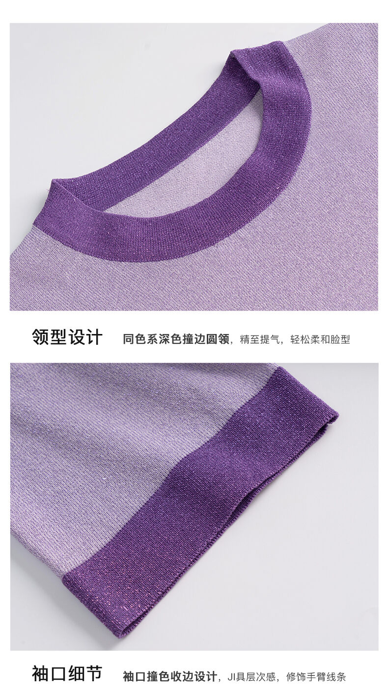欧芮儿OLrain法式高级紫色针织衫女夏季2022短袖高端冰丝薄款上衣