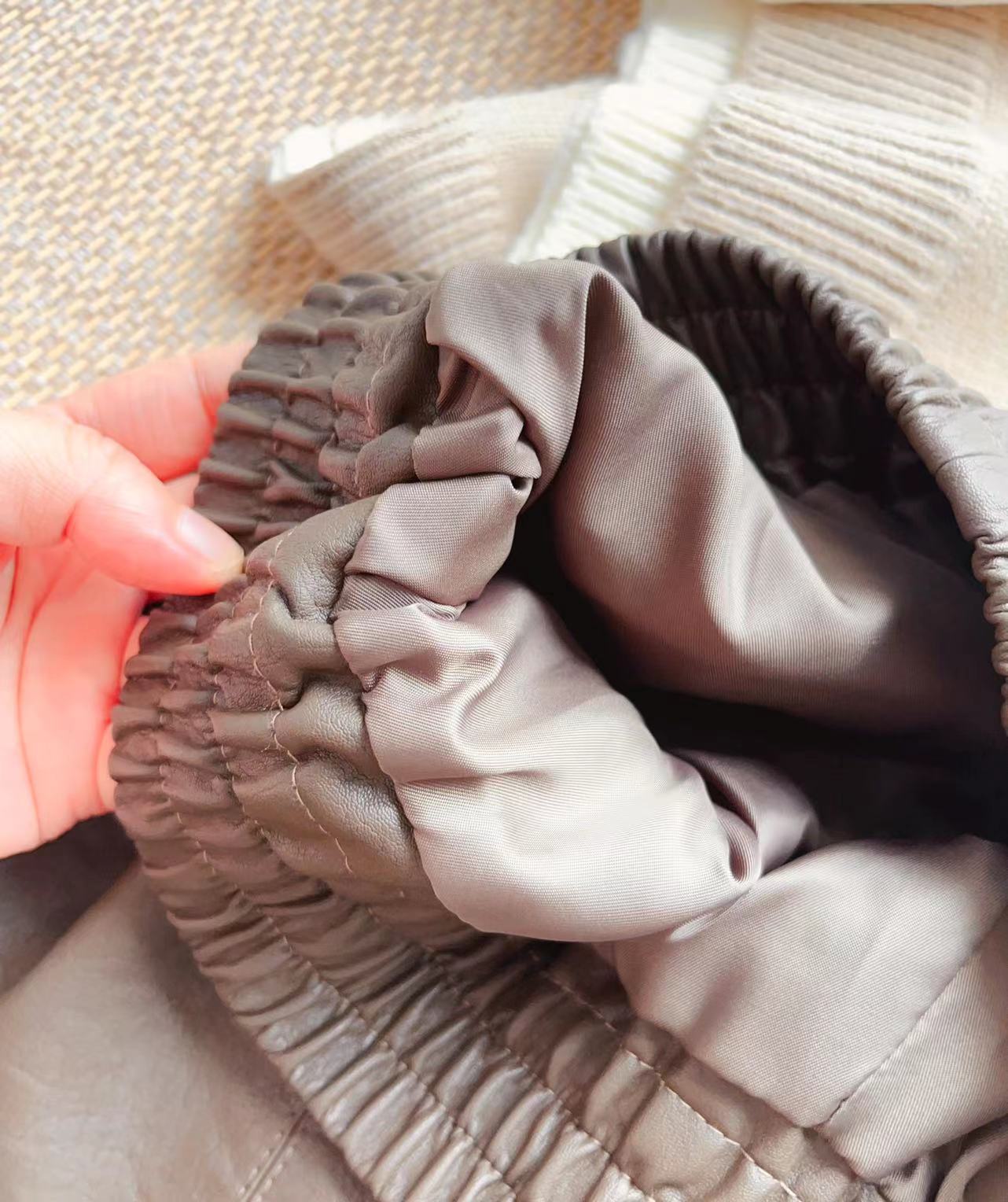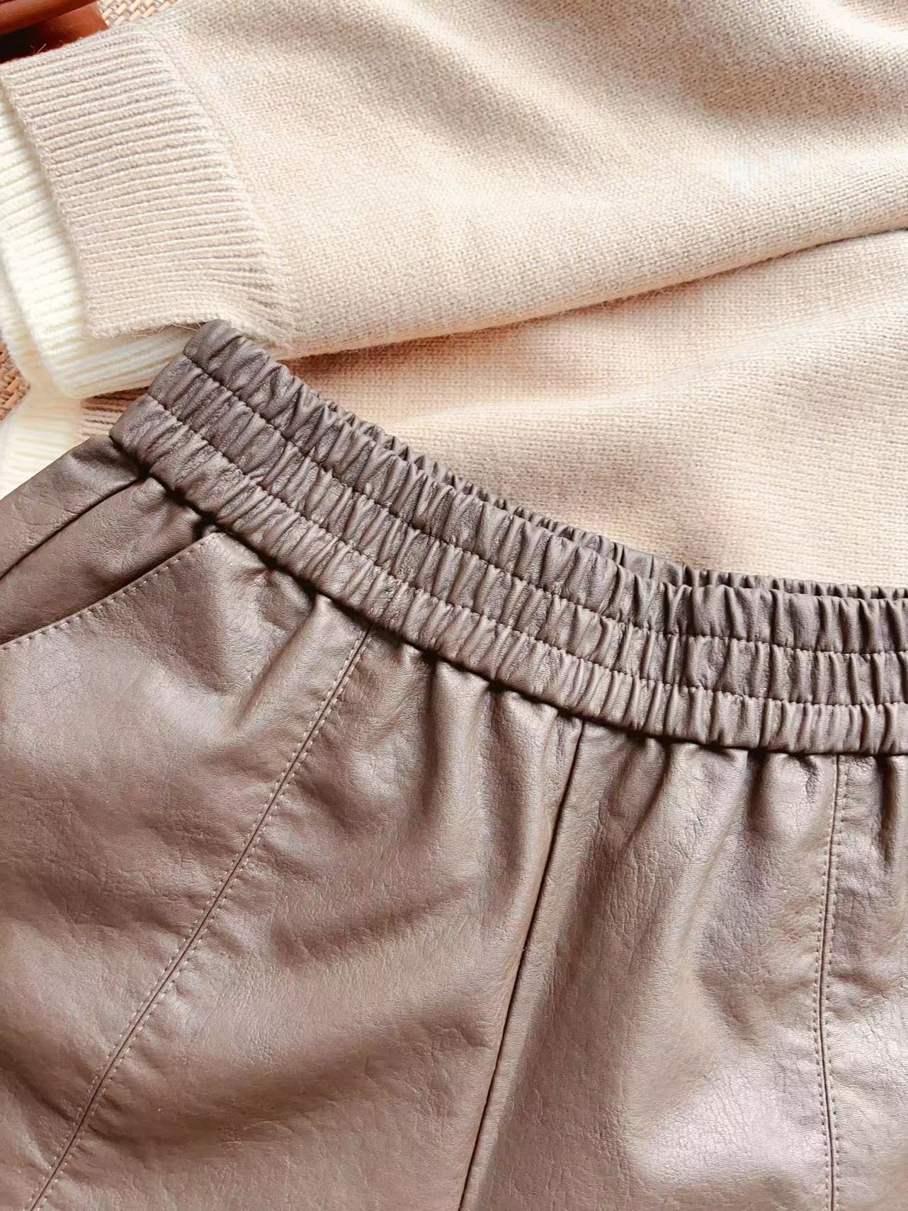 拿到手就可以感受到的皮质,皮质软糯糯的,带有自然的哑光皮质纹理,真的好走心,手感也好舒服!兼顾修身度和包容性的松紧腰,穿脱方便不挑身材!裤身切割设计,显腿部袖长笔直,宽松裤腿的版型进一步修饰腿部曲线,显瘦效果一级棒呀~~