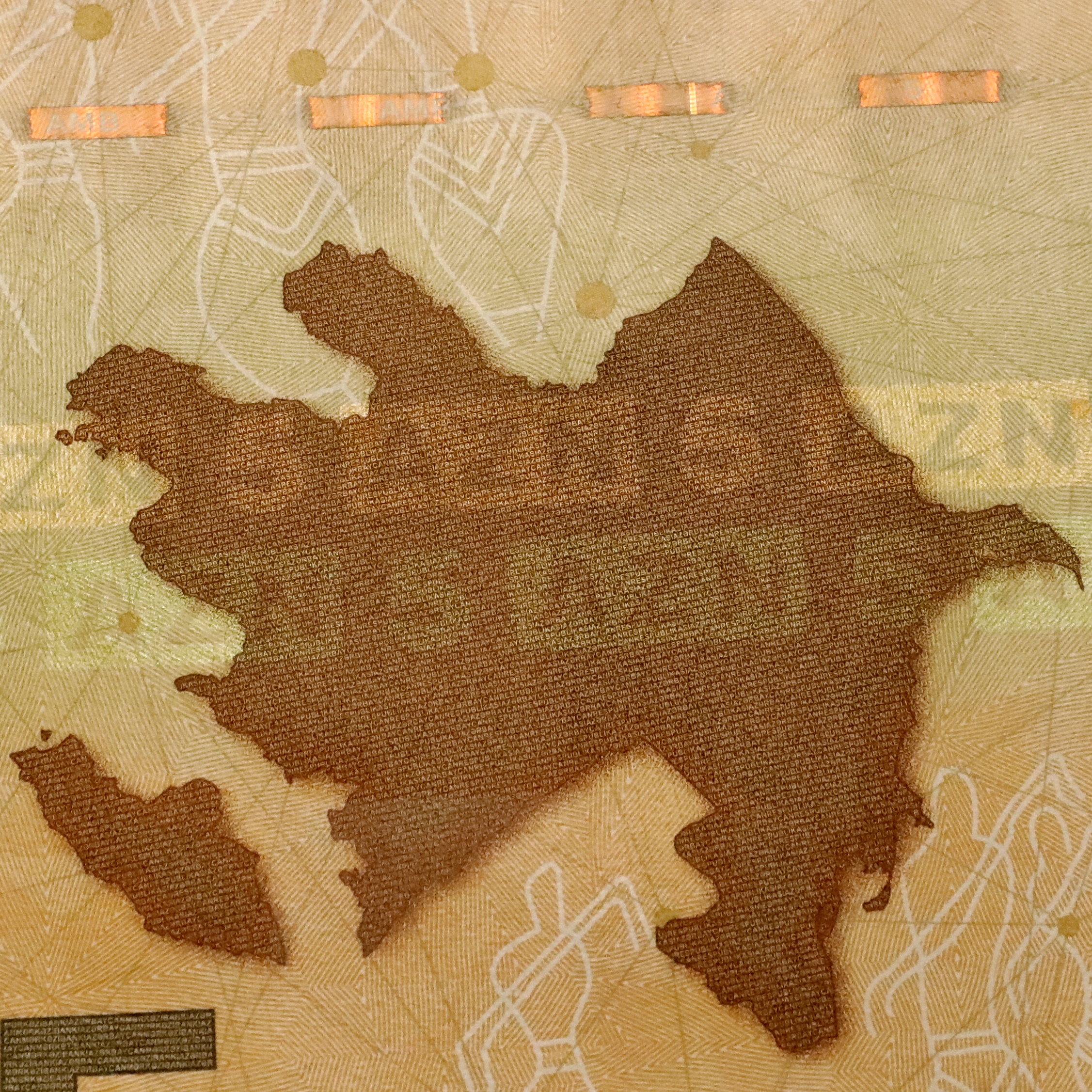 正面为其文化的象征——笔墨纸;背面是阿塞拜疆及欧洲版图的轮廓,背景图案取自世界文化遗产戈布斯坦岩石画。
