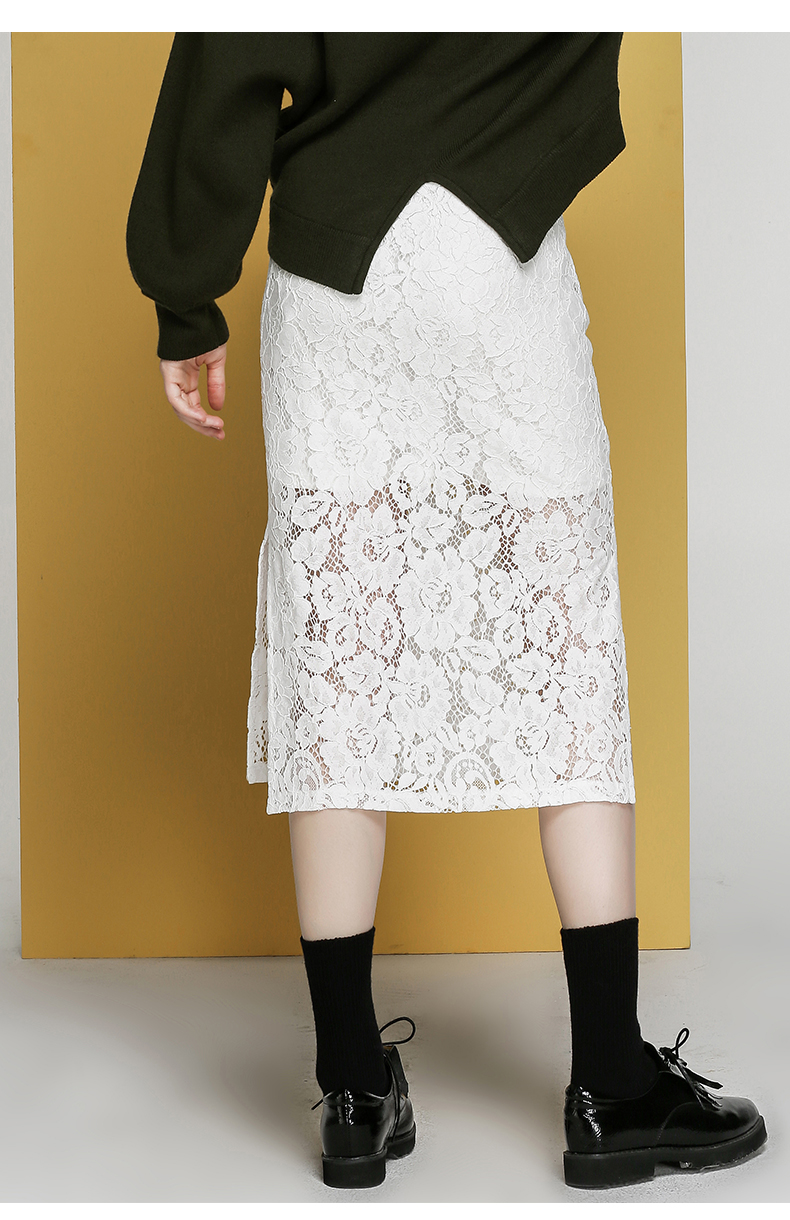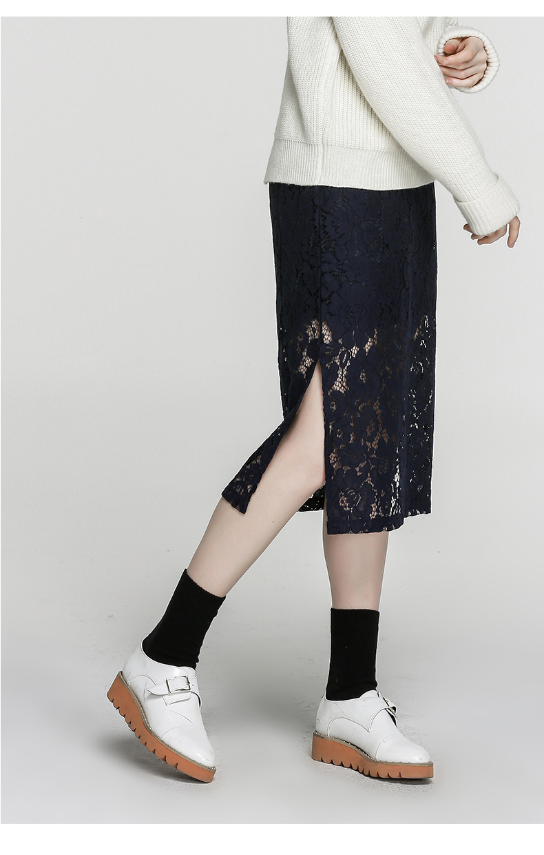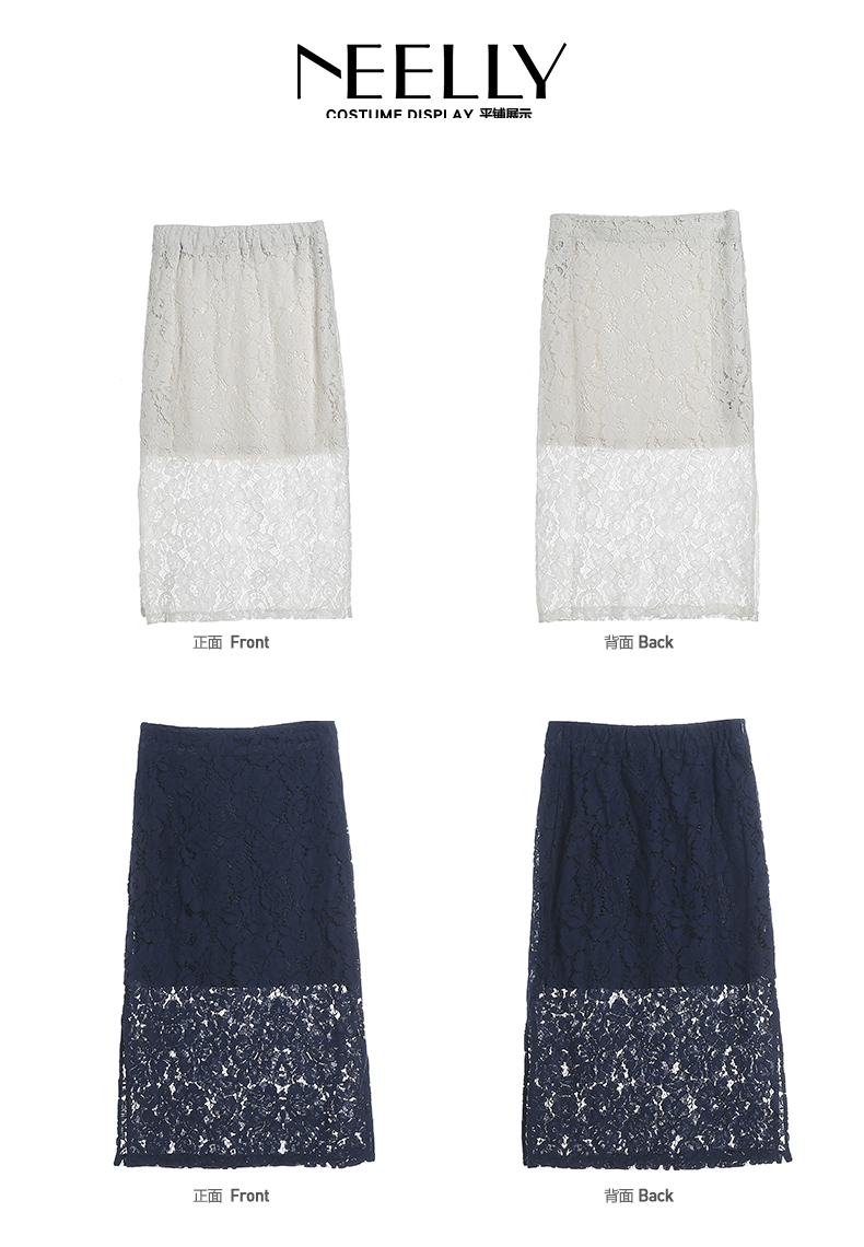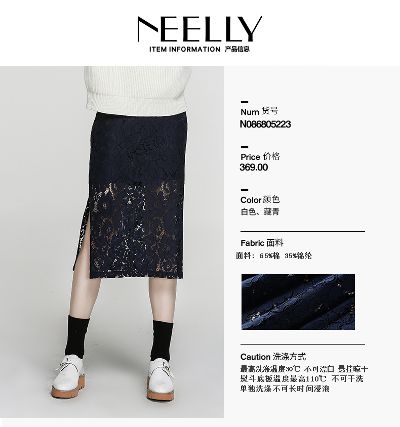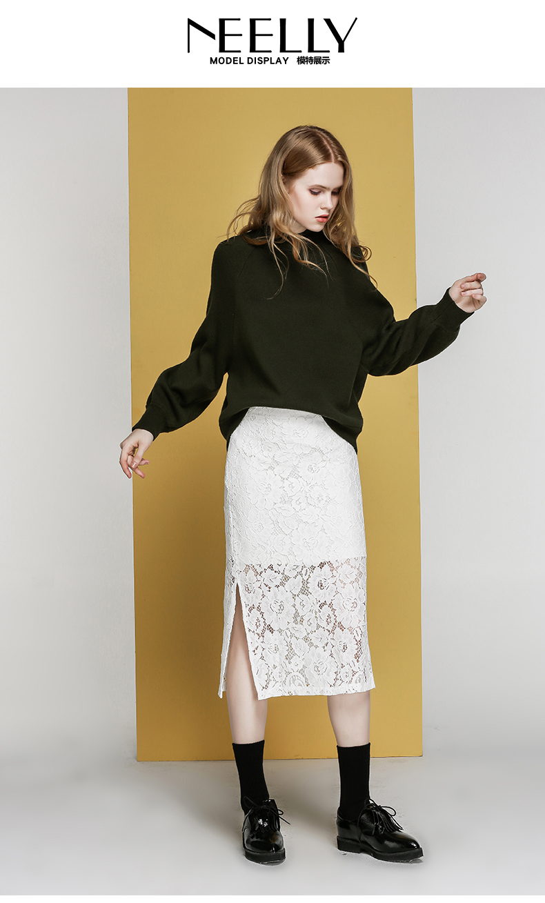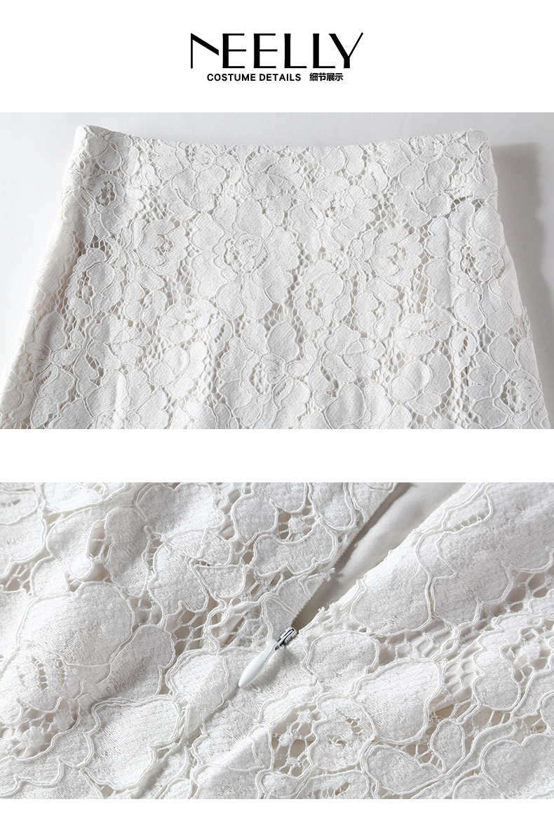 NEELLY纳俪冬装新款中长款女裙显瘦防走光水溶蕾丝包臀半身裙