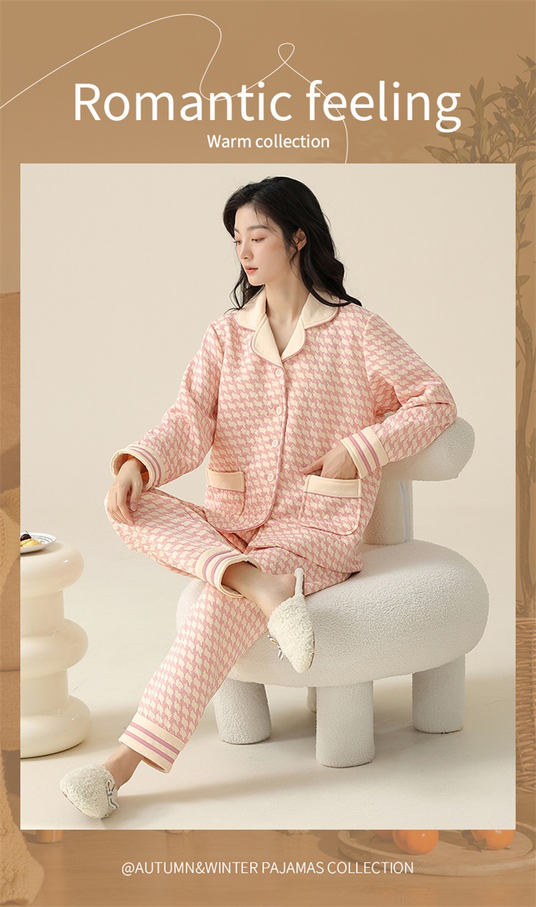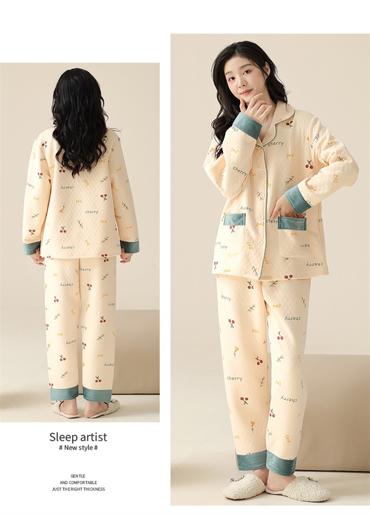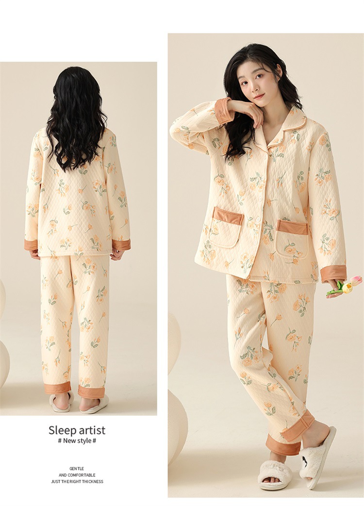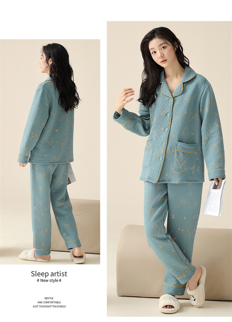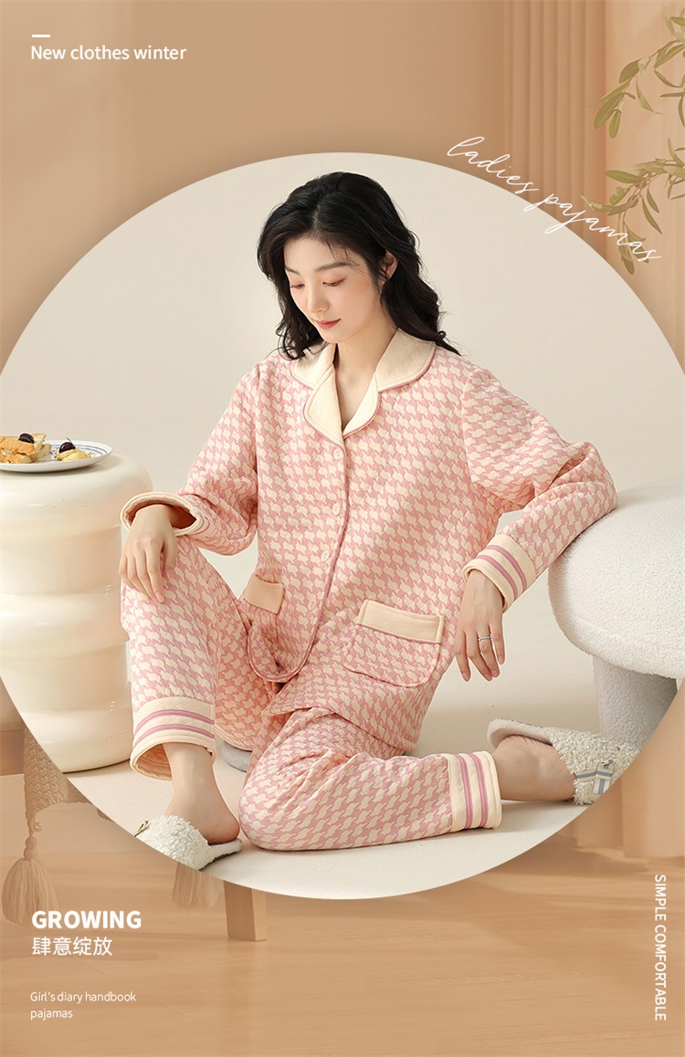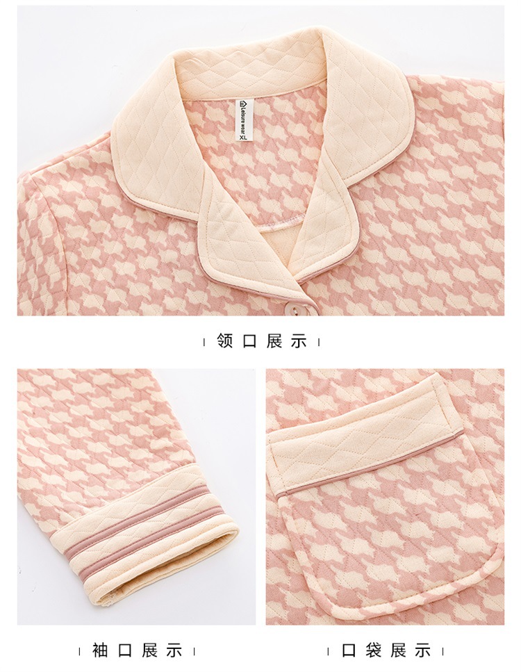 空气棉夹层睡衣女秋冬季纯棉长袖加厚保暖翻领大码家居服夹棉套装