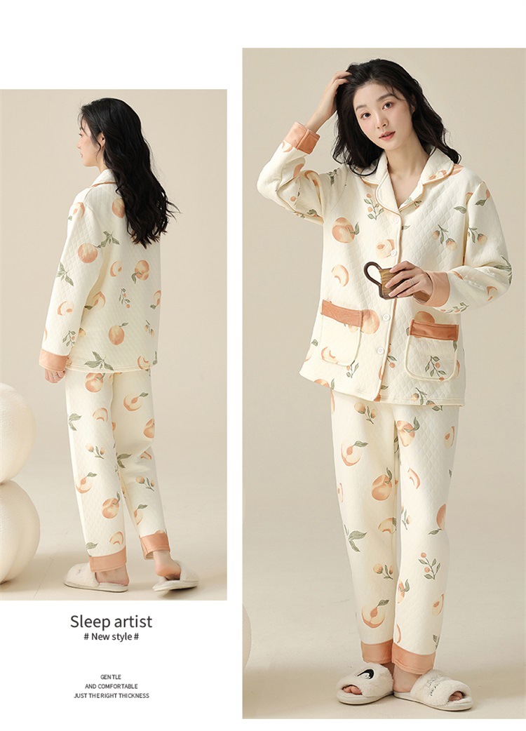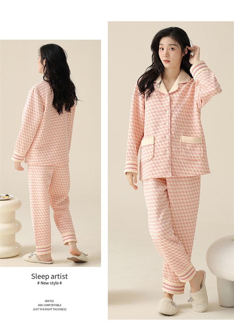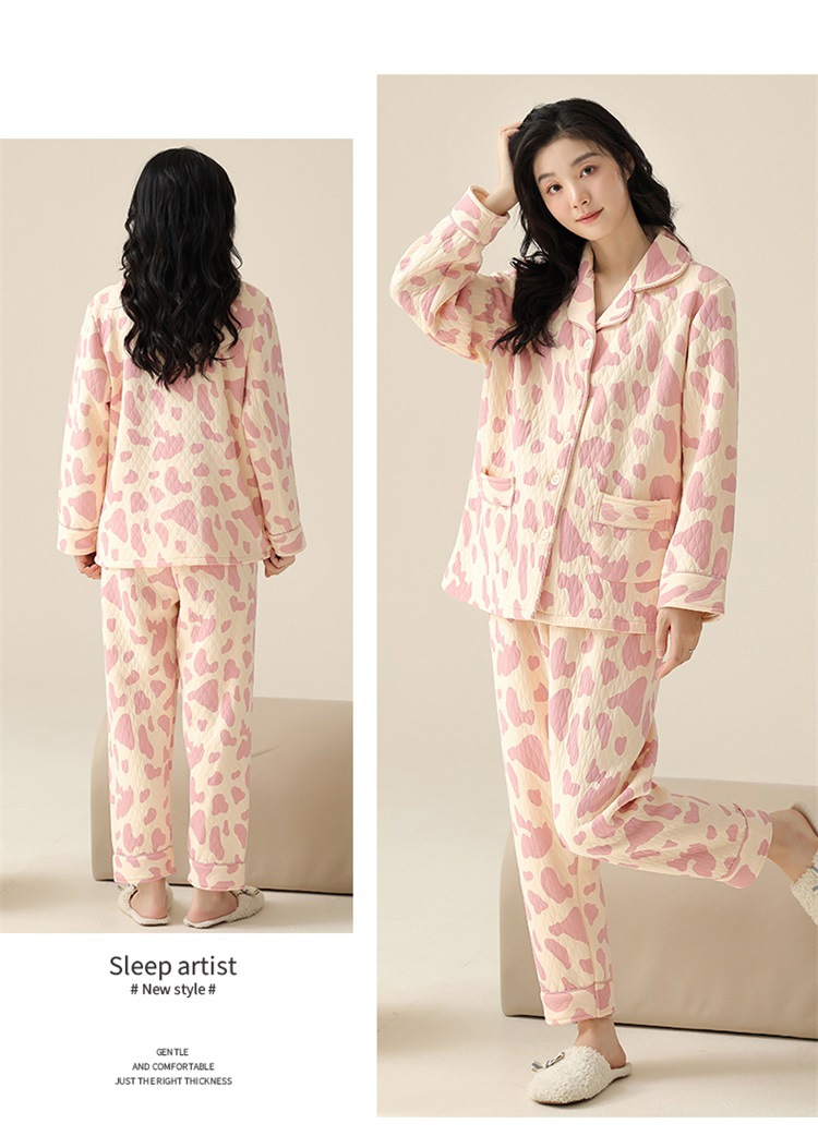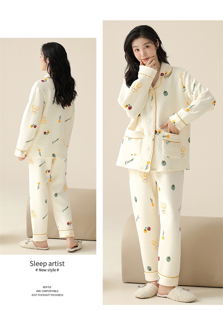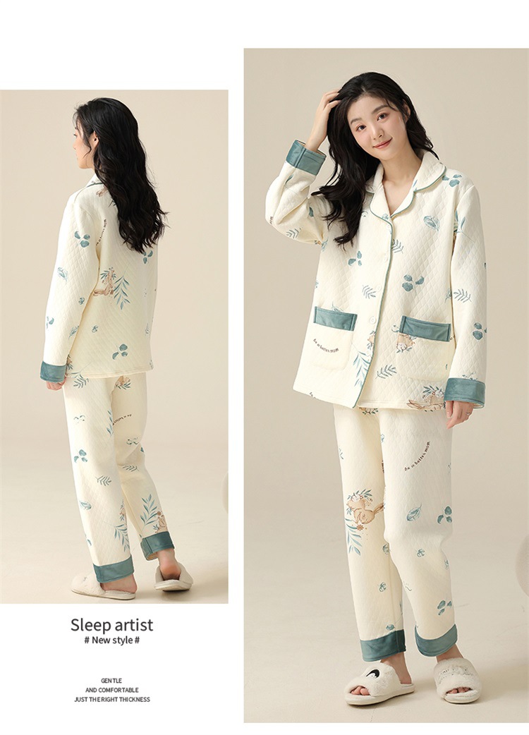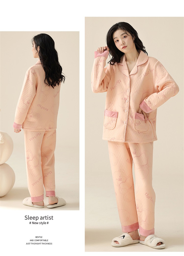 空气棉夹层睡衣女秋冬季纯棉长袖加厚保暖翻领大码家居服夹棉套装