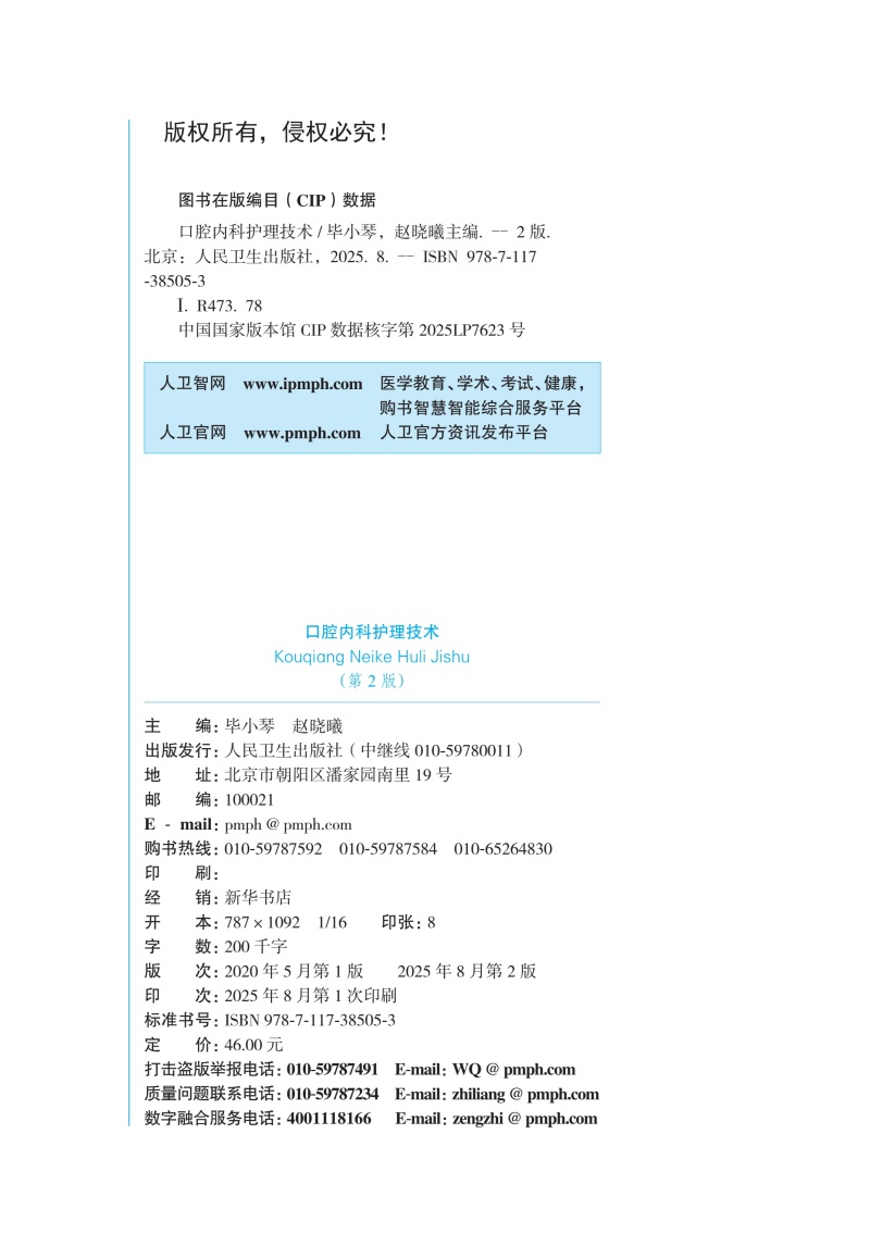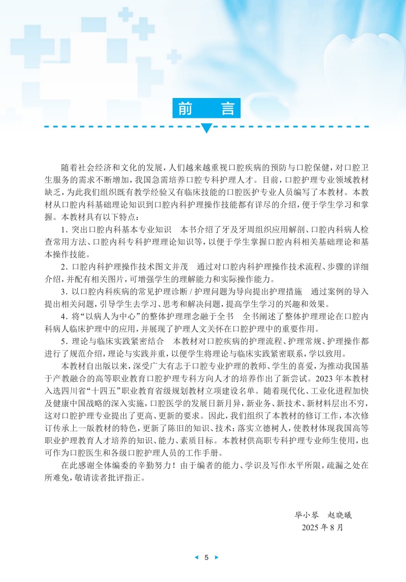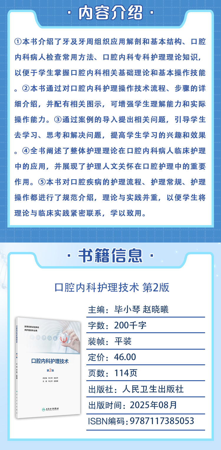 口腔内科护理技术 第2二版 改革创新试验教材 毕小琴 赵晓曦 主编 供护理类专业用 创新教材 专科高职9787117385053人民卫生出版社