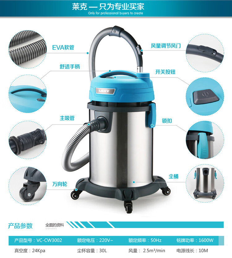 莱克(LEXY)商用办公室吸尘器干湿两用工业工厂桶式宾馆酒店1600W大功率车间清洁机CW3002(1600W、30L)