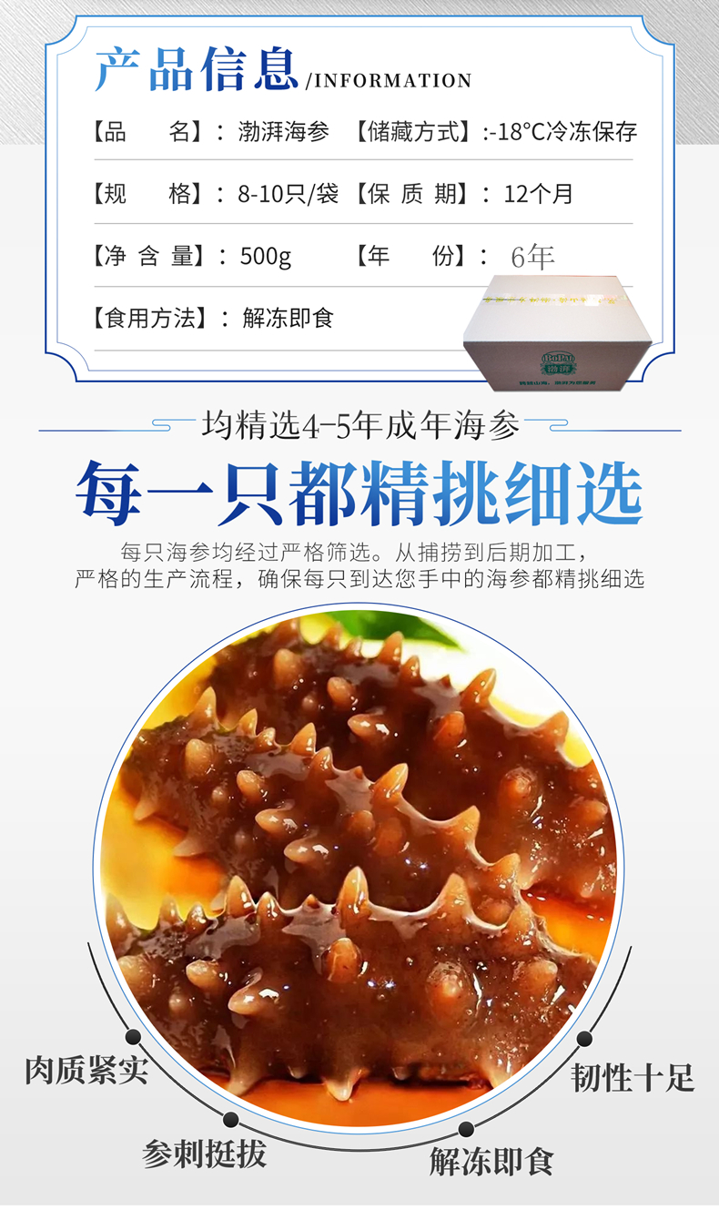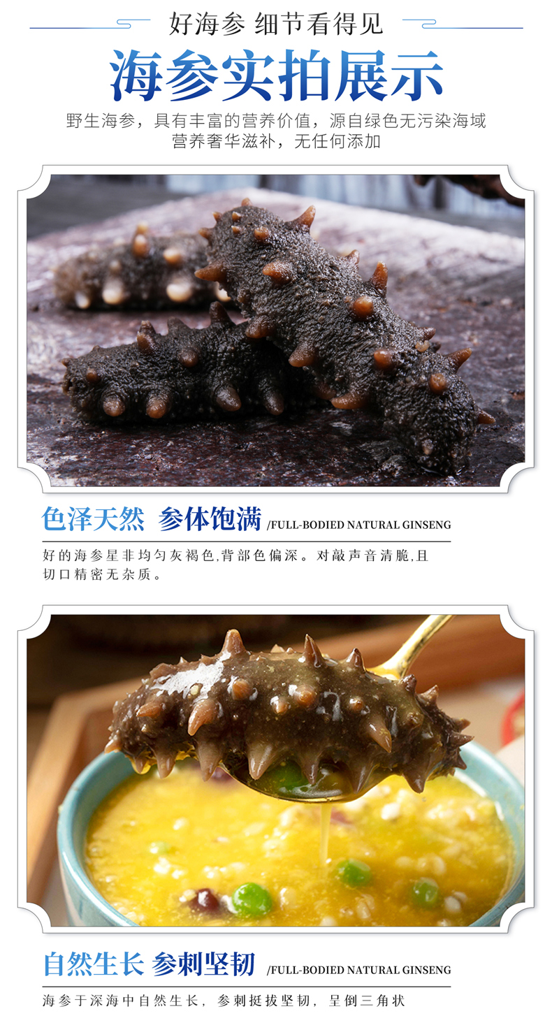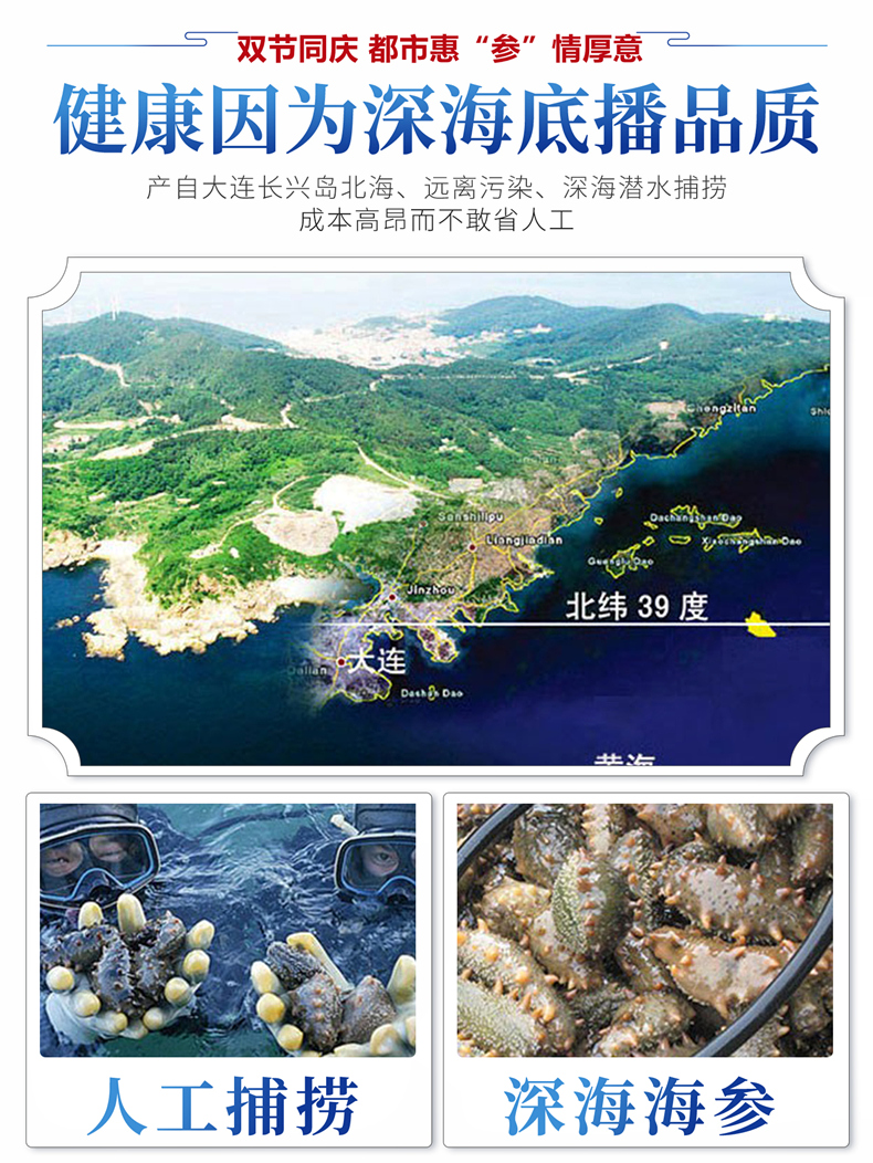 都市惠定制高标准大连海参:深海野生播种,肉厚,六年慢生长,多刺,坚硬,韧性好。