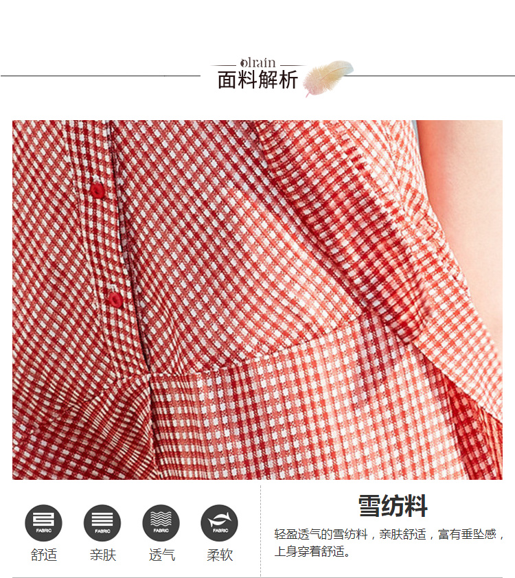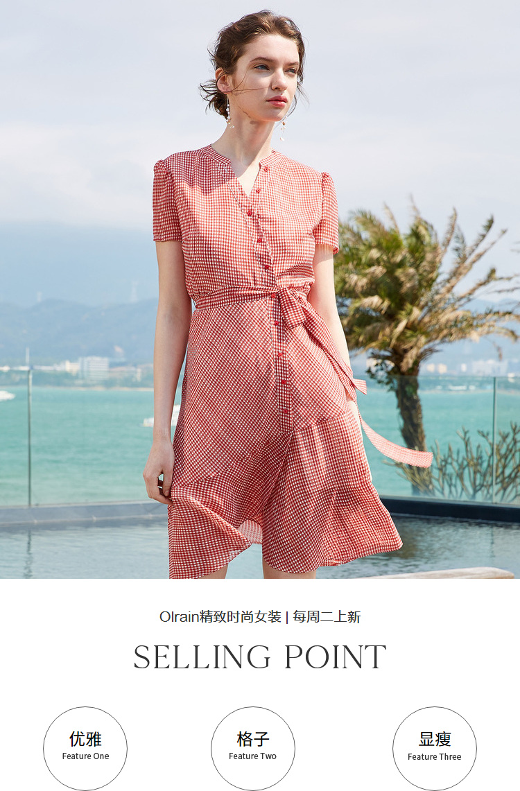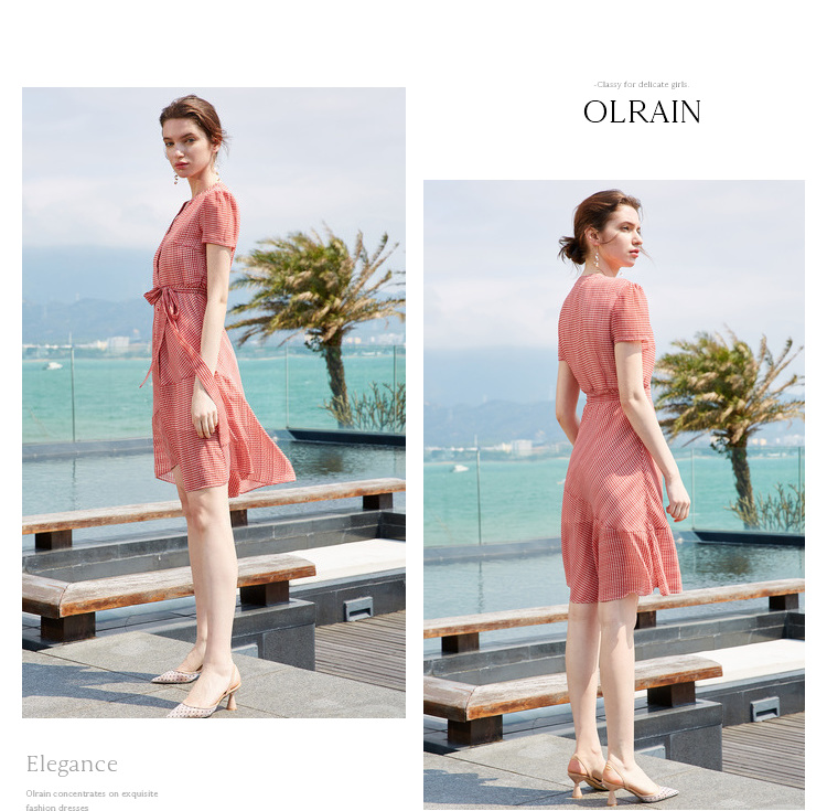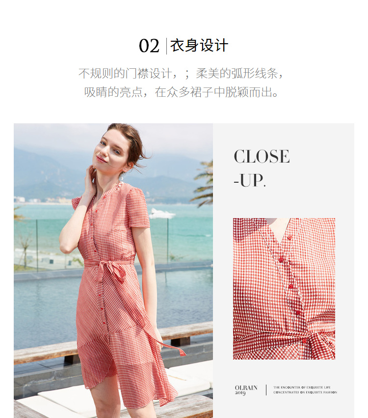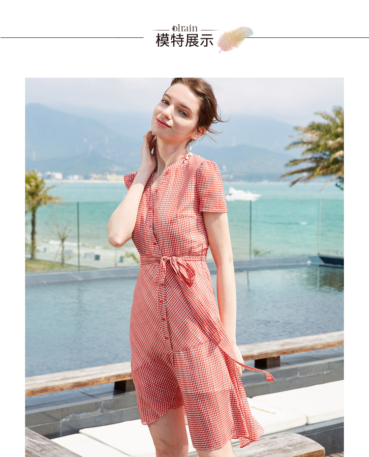 欧芮儿夏装2019新款女装系带收腰显瘦红色格子连衣裙女中长款女裙