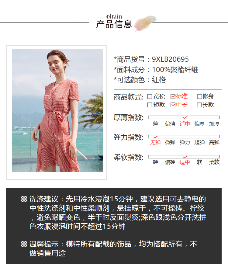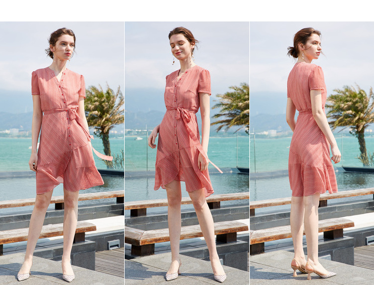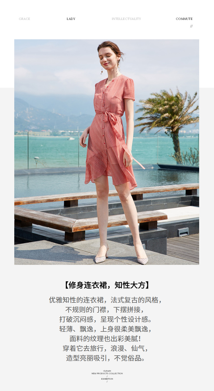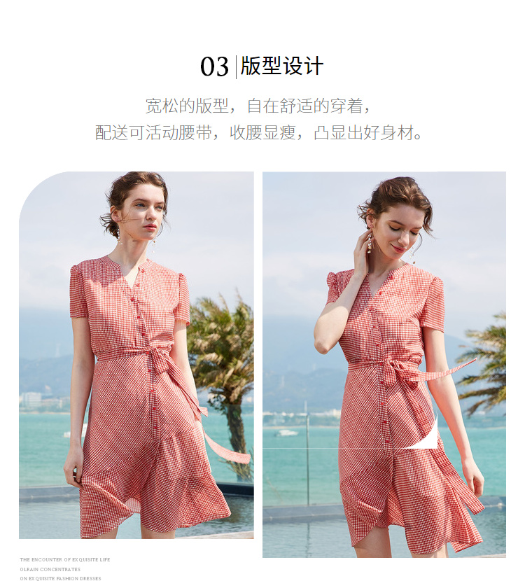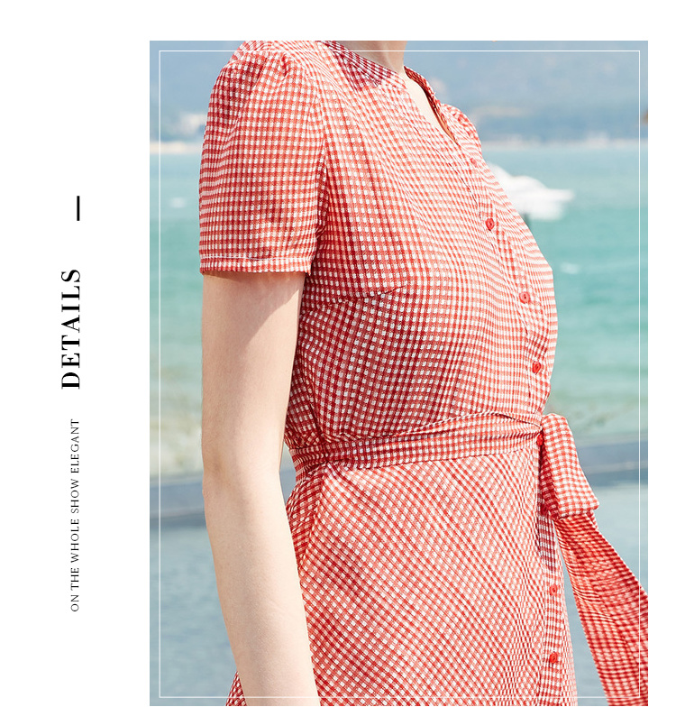欧芮儿夏装2019新款女装系带收腰显瘦红色格子连衣裙女中长款女裙