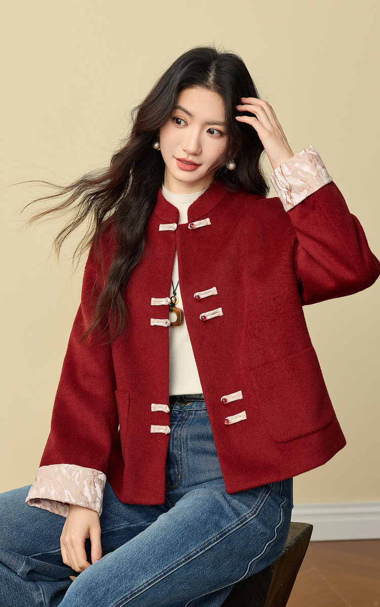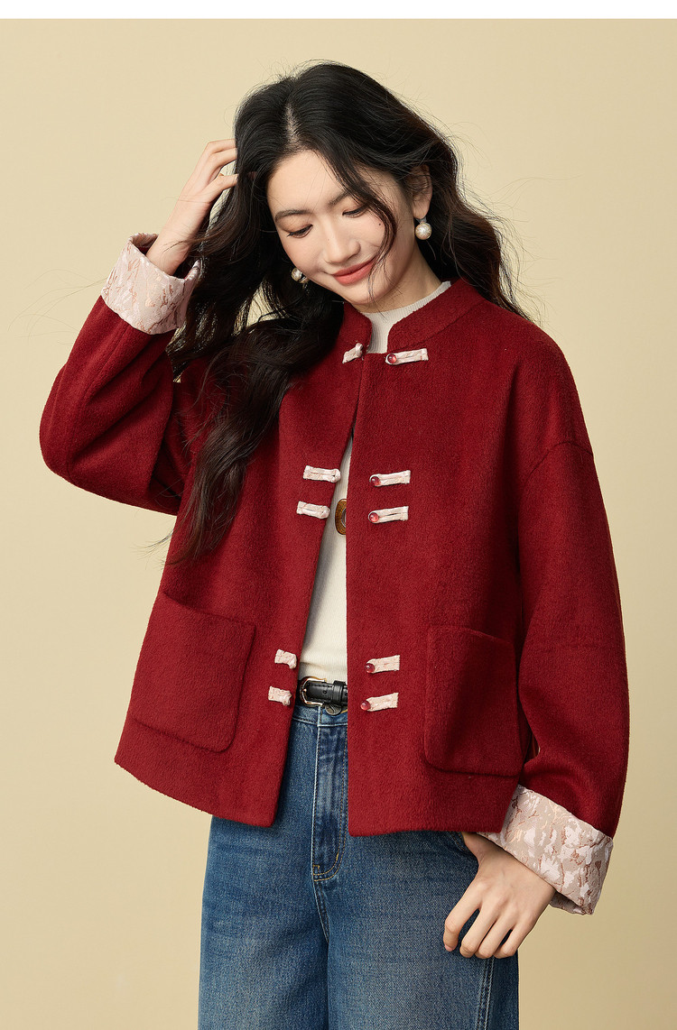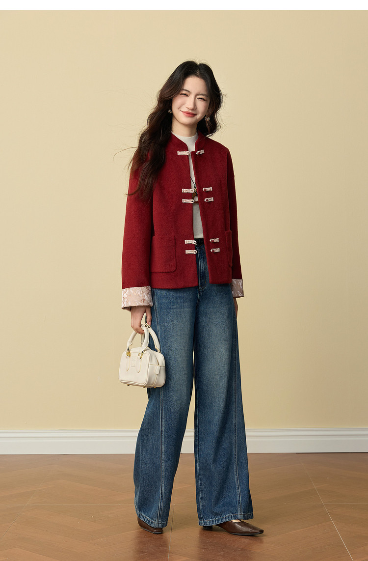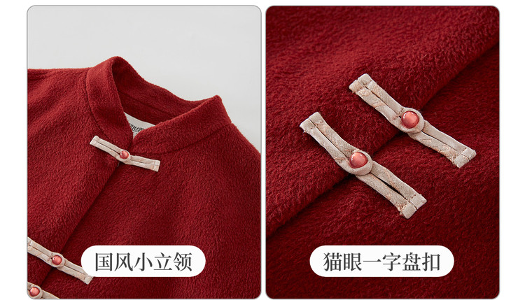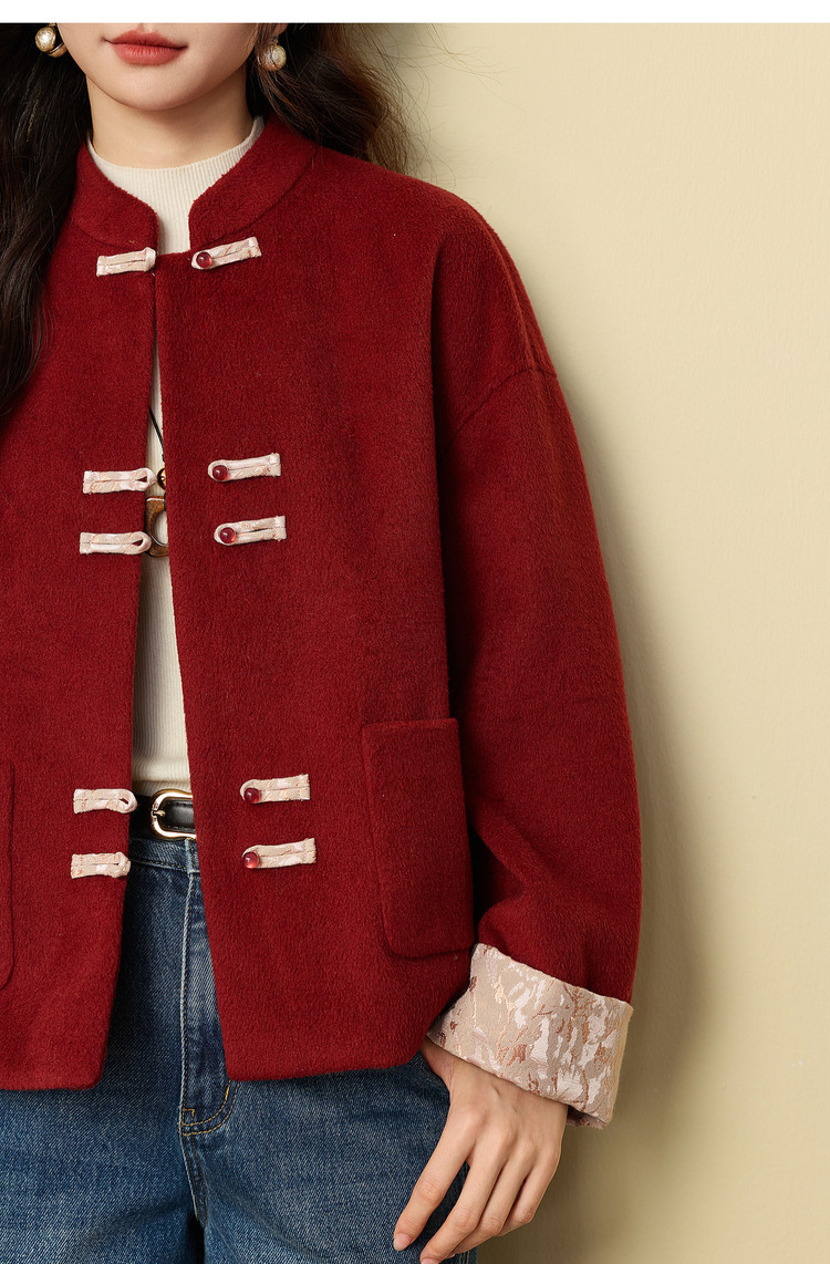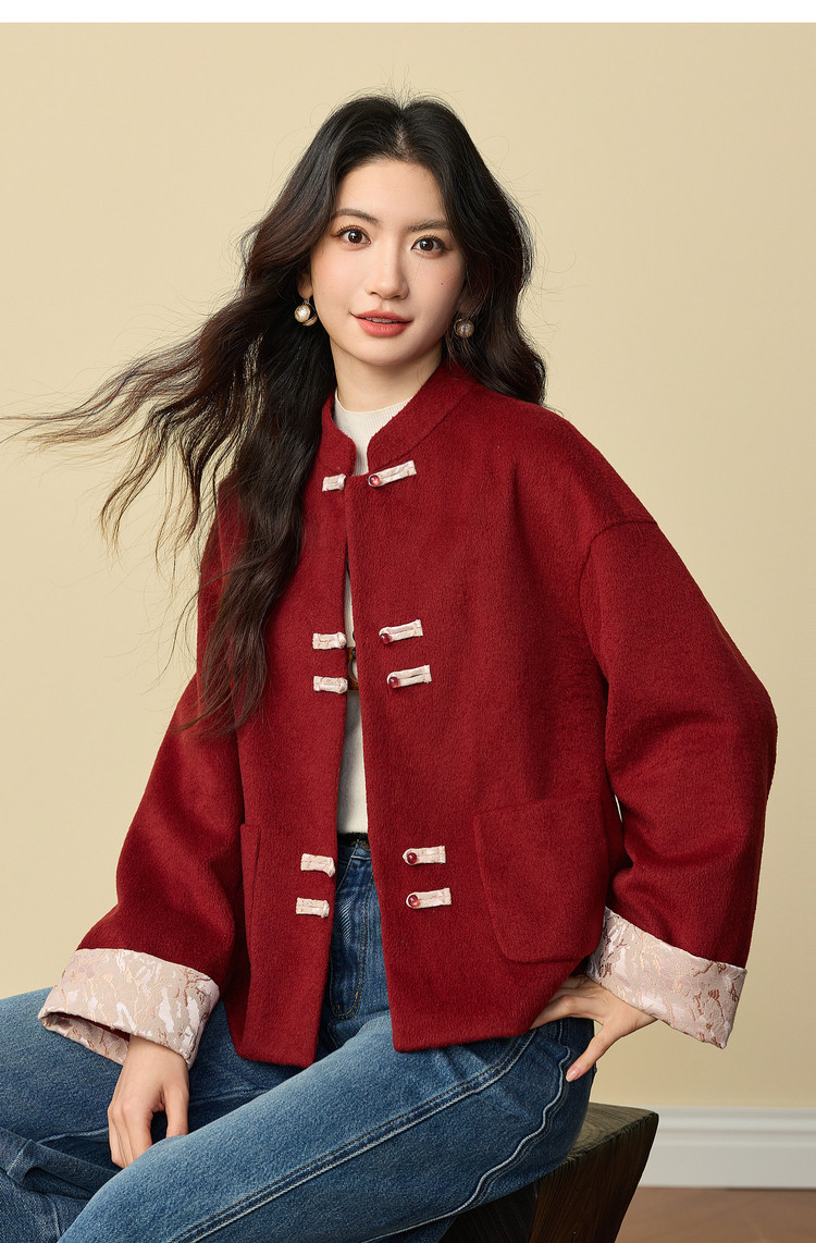 【12/24新品6.5折】熙世界新中式红色毛呢外套女冬季高级感气质国风盘扣短款呢子大衣