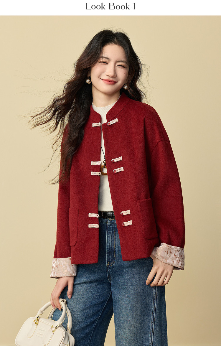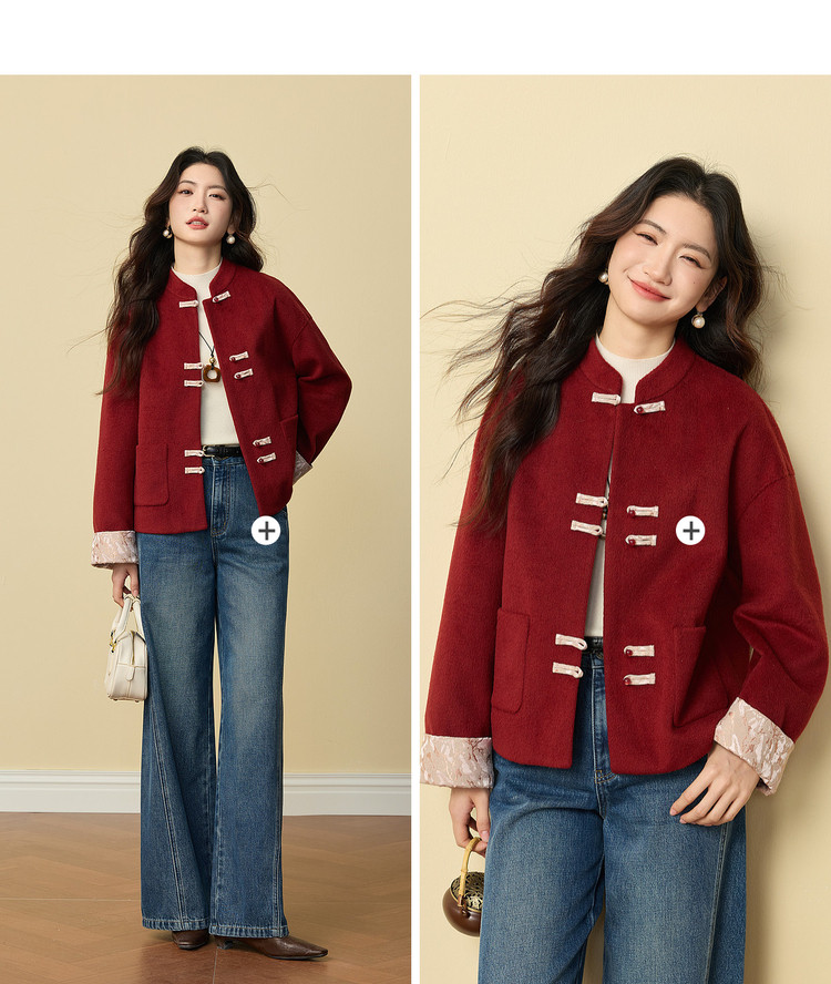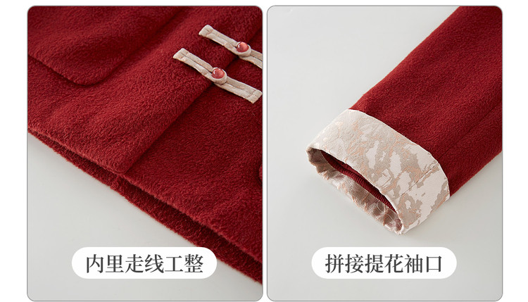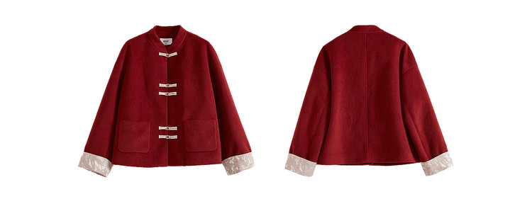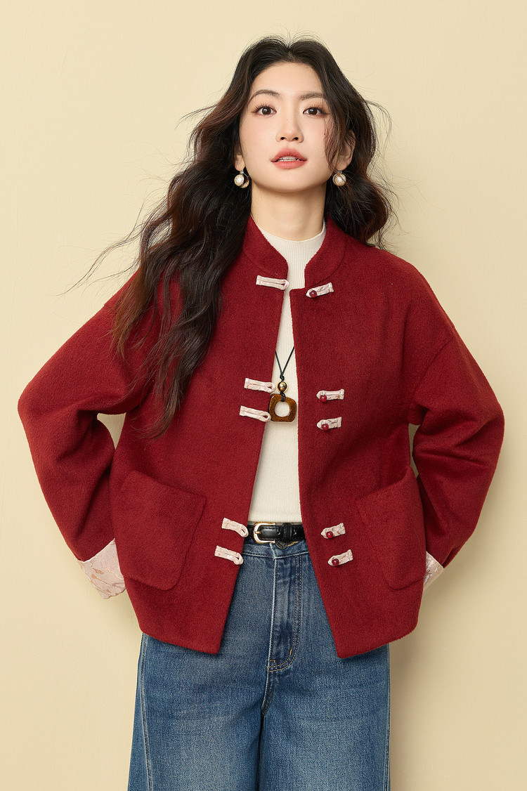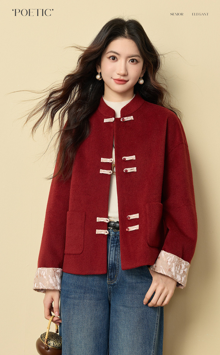 【12/24新品6.5折】熙世界新中式红色毛呢外套女冬季高级感气质国风盘扣短款呢子大衣