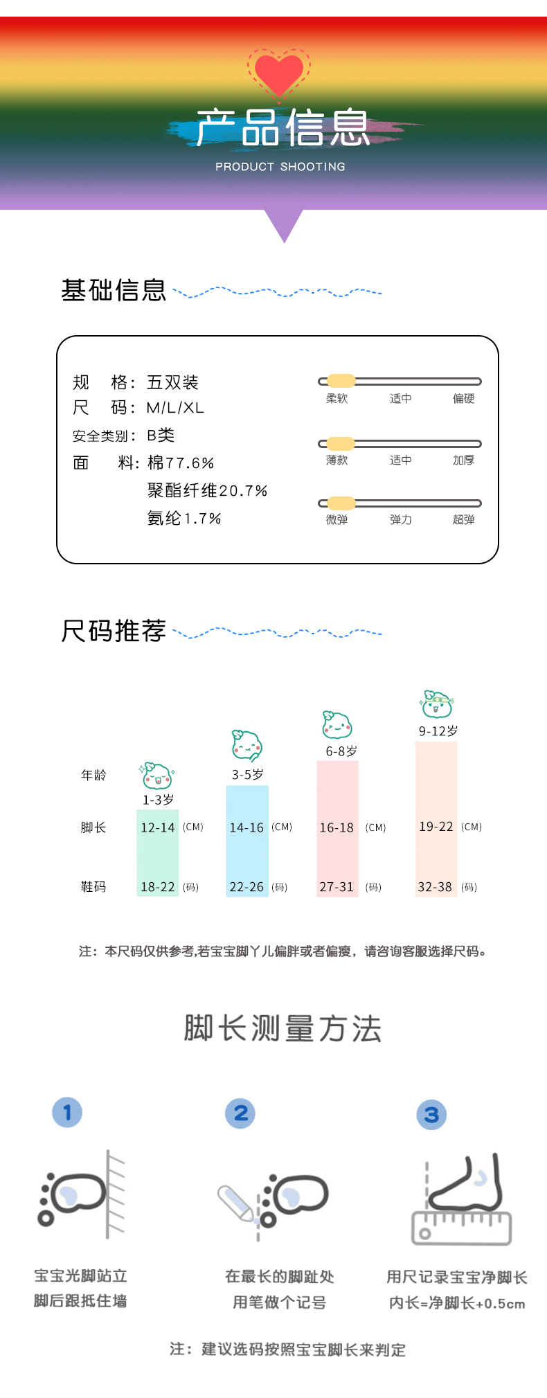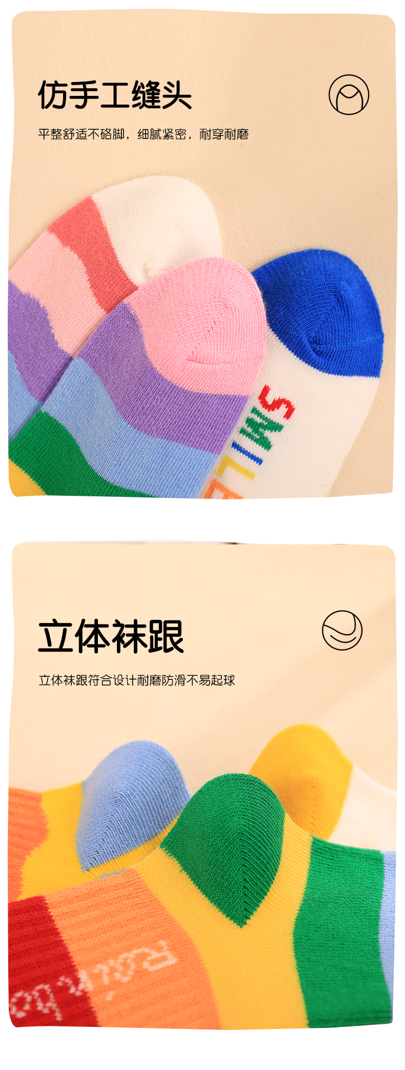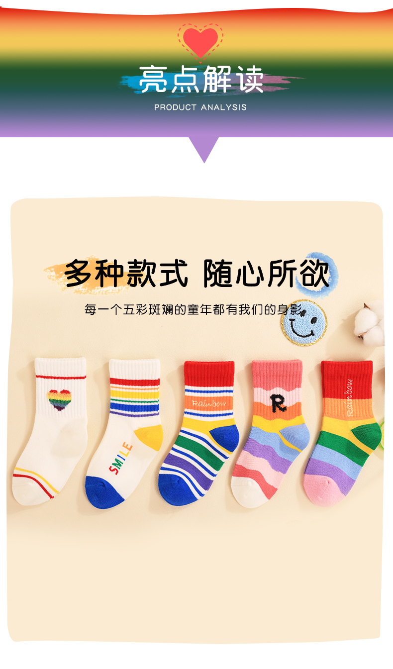 洁丽雅5双装儿童卡通袜子可爱超萌彩虹袜儿童袜子中筒袜子童袜