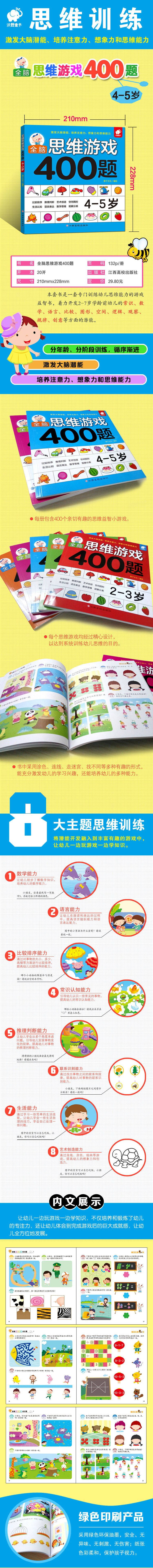 孩子的早期教育中,锻炼起思维能力要远比生搬硬套的交会孩子1+1=2这样的问题意义要深远的多。在这套书中,作者依照不同年龄段儿童的心理特点,总共设计了400道思维训练题目。让孩子利用已有的信息,独自面对新问题,并用独创的方法来解决它,培养宝宝分析问题与解决问题的能力,将潜能开发融入到丰富有趣的游戏中,从而达到智力开发的最终目的。整套图书题型多样,插图趣味性强,用色丰富。非常适合小朋友使用。