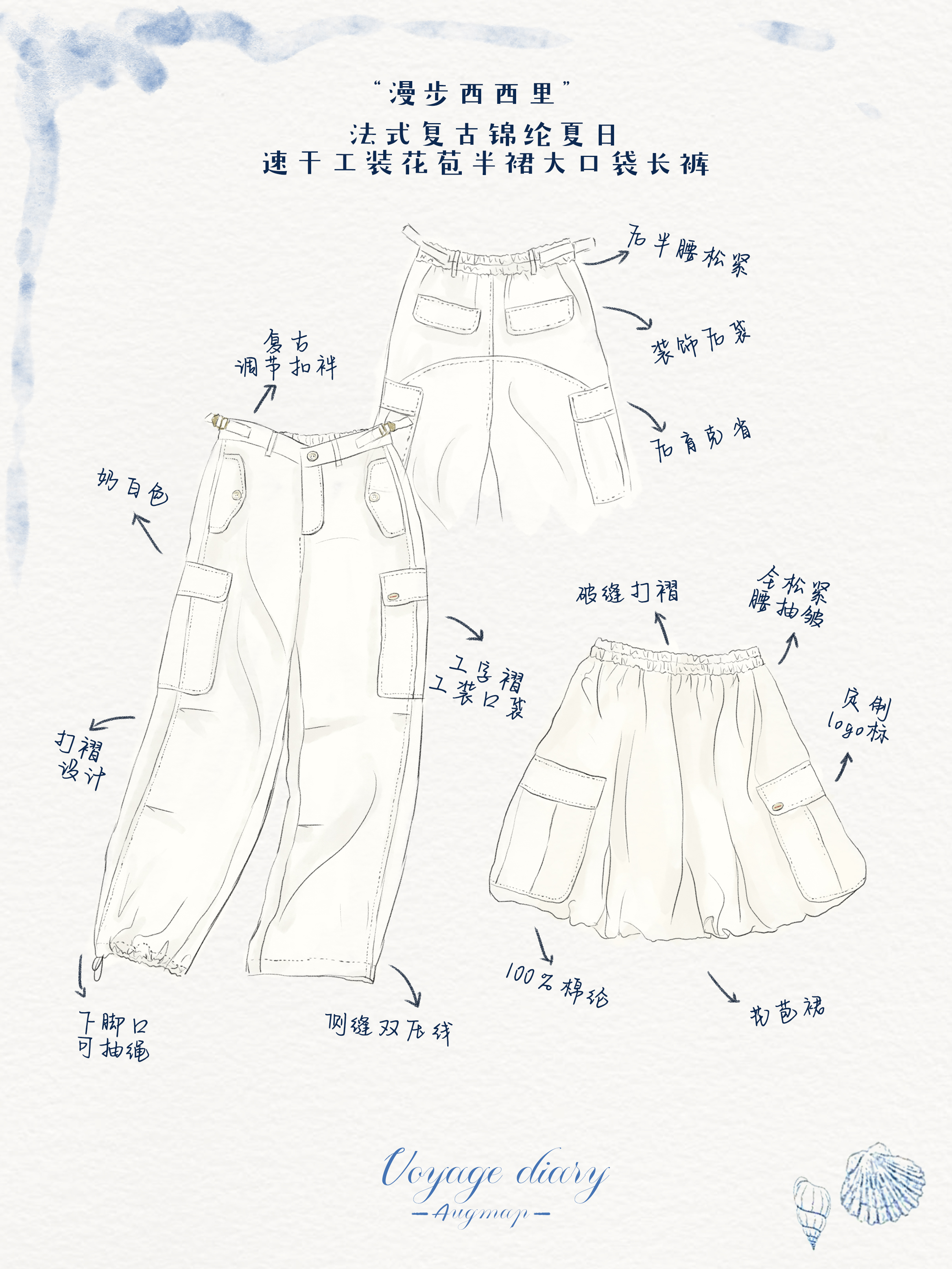 浮生八记/25A067/25A010/工装花苞半裙大口袋长裤