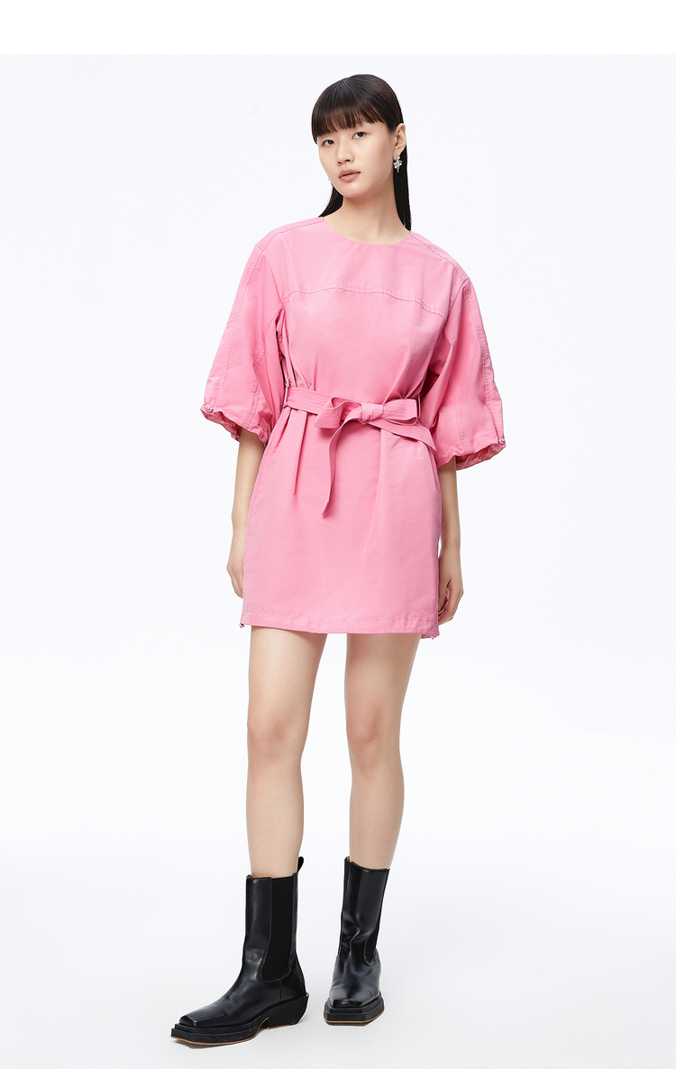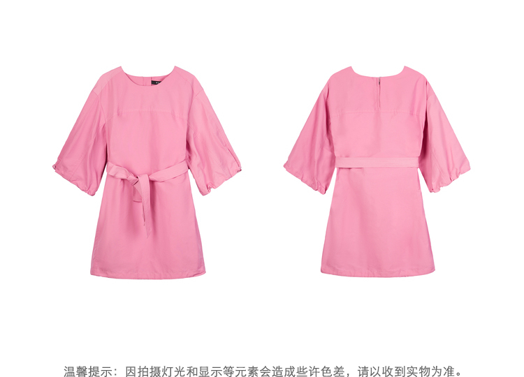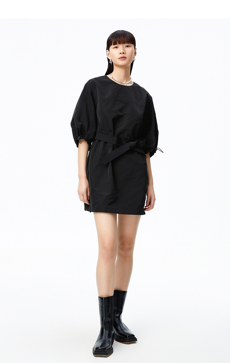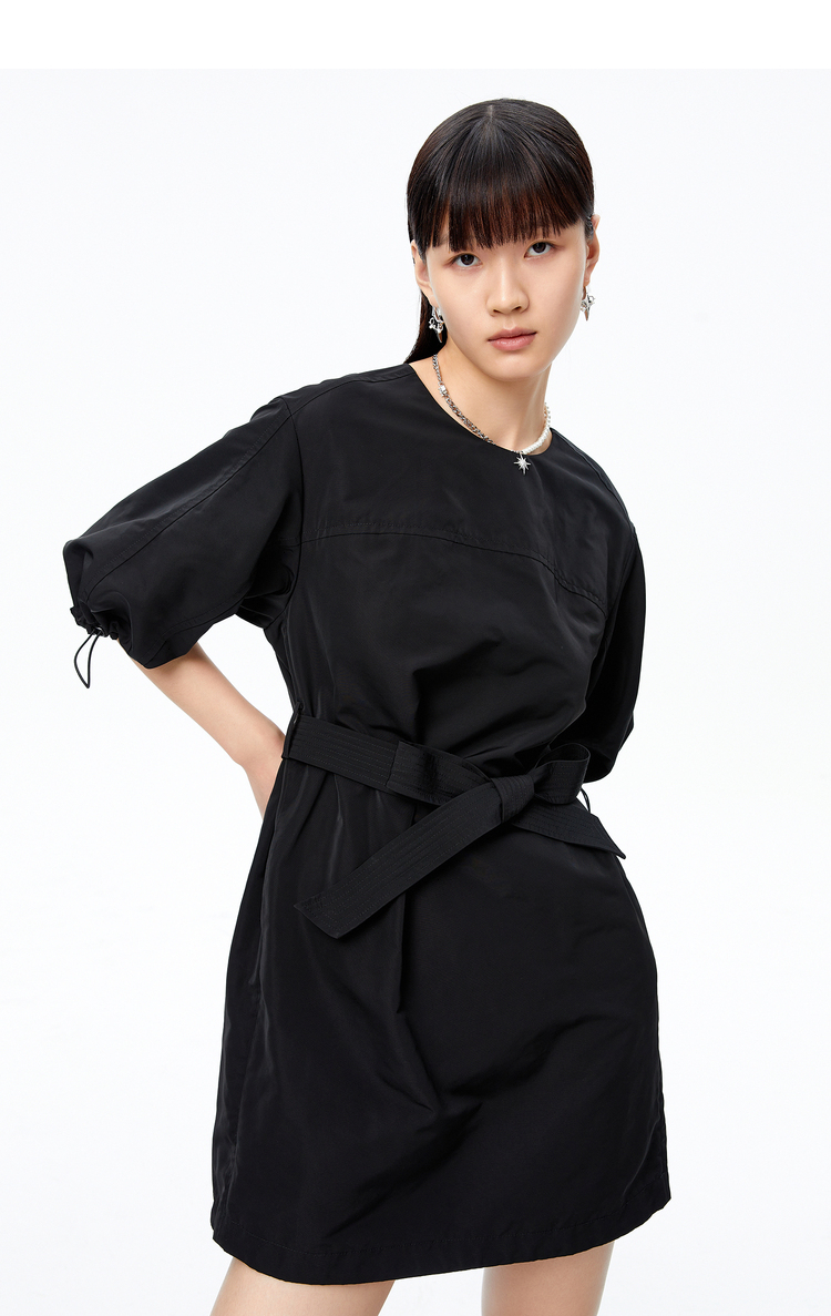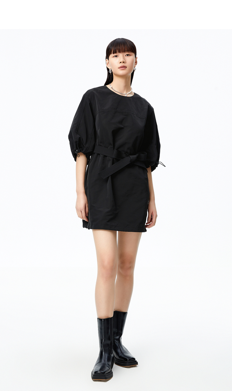 NEELLY纳俪2022秋季新品圆领连衣裙女休闲收腰系带七分袖A字裙N22081Y01065