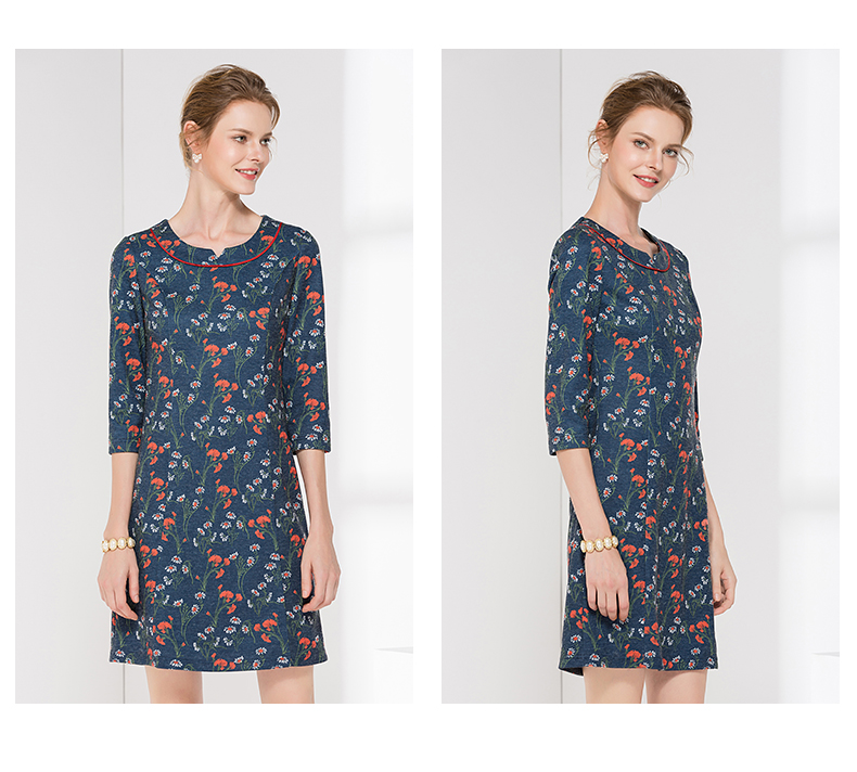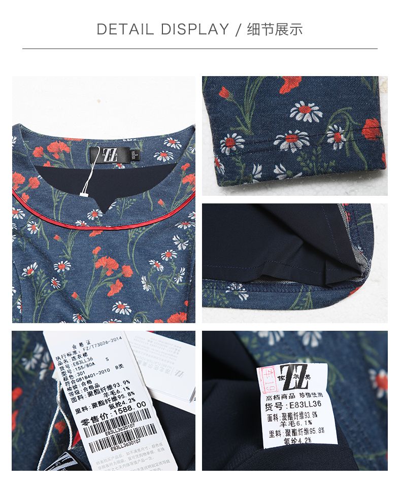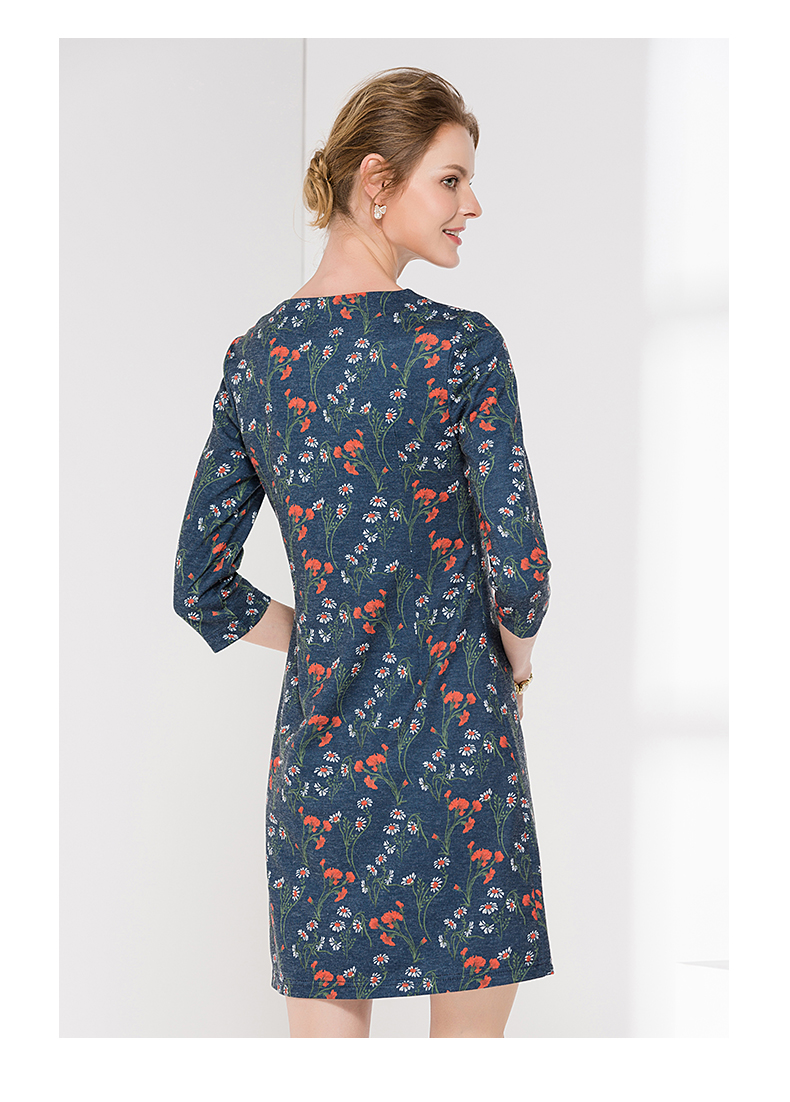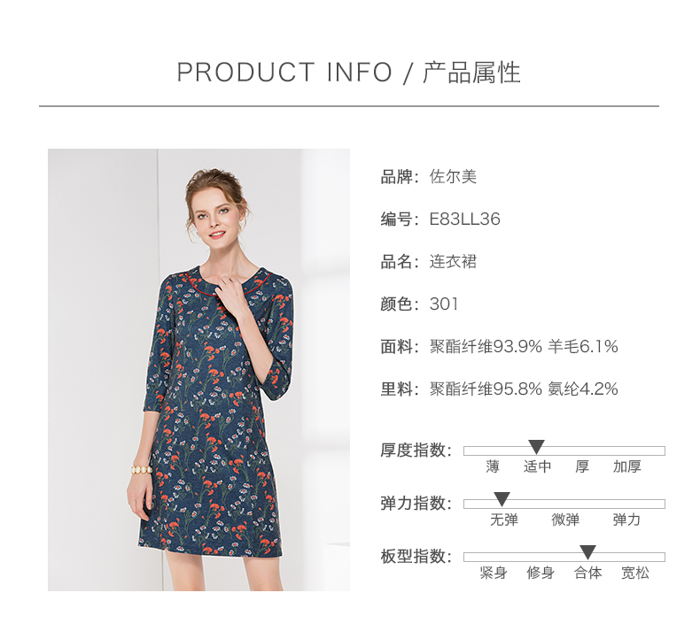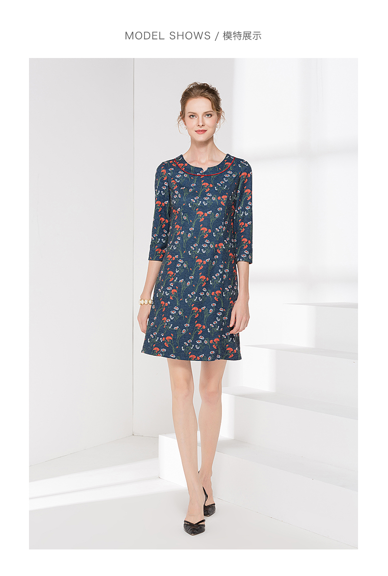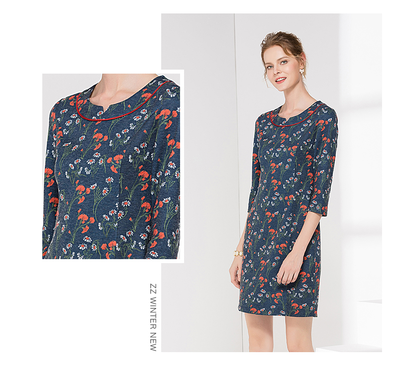 佐尔美新品秋季秋时尚圆领中袖中长款女士修身印花连衣裙E83LL36
