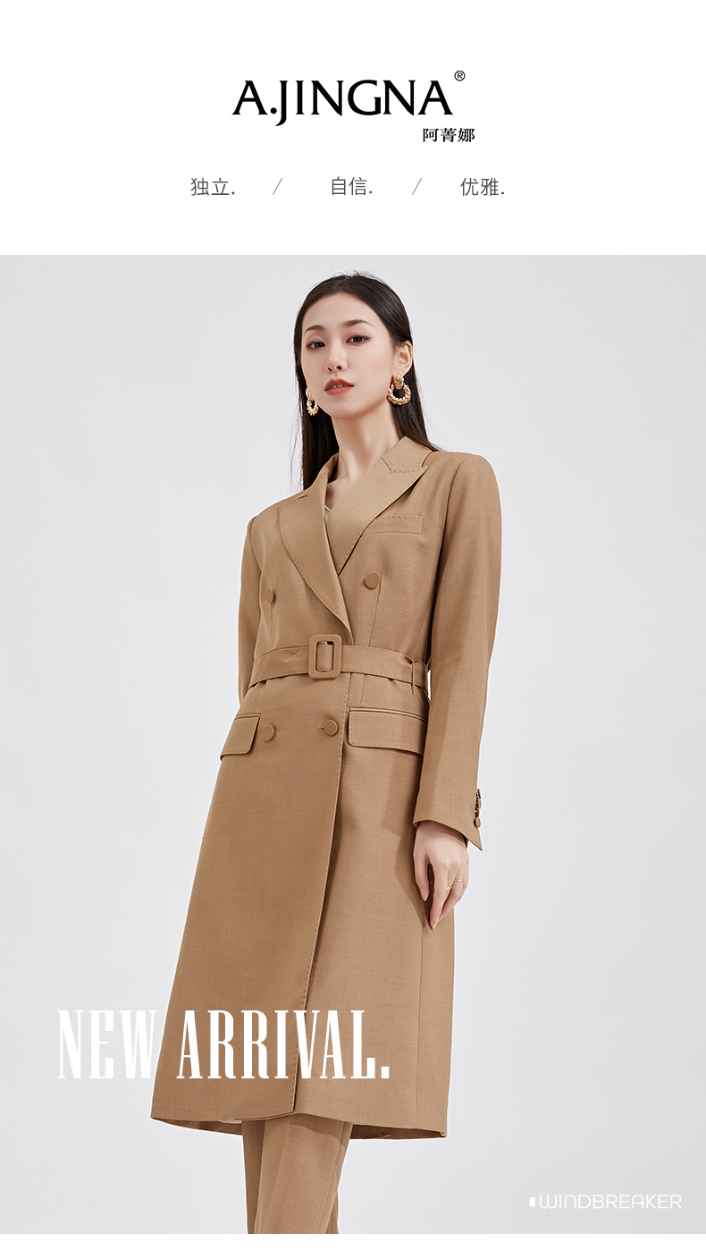 【特价不退换】阿菁娜经典平驳领西装式风衣修身优雅简约中长款大衣A27C205019