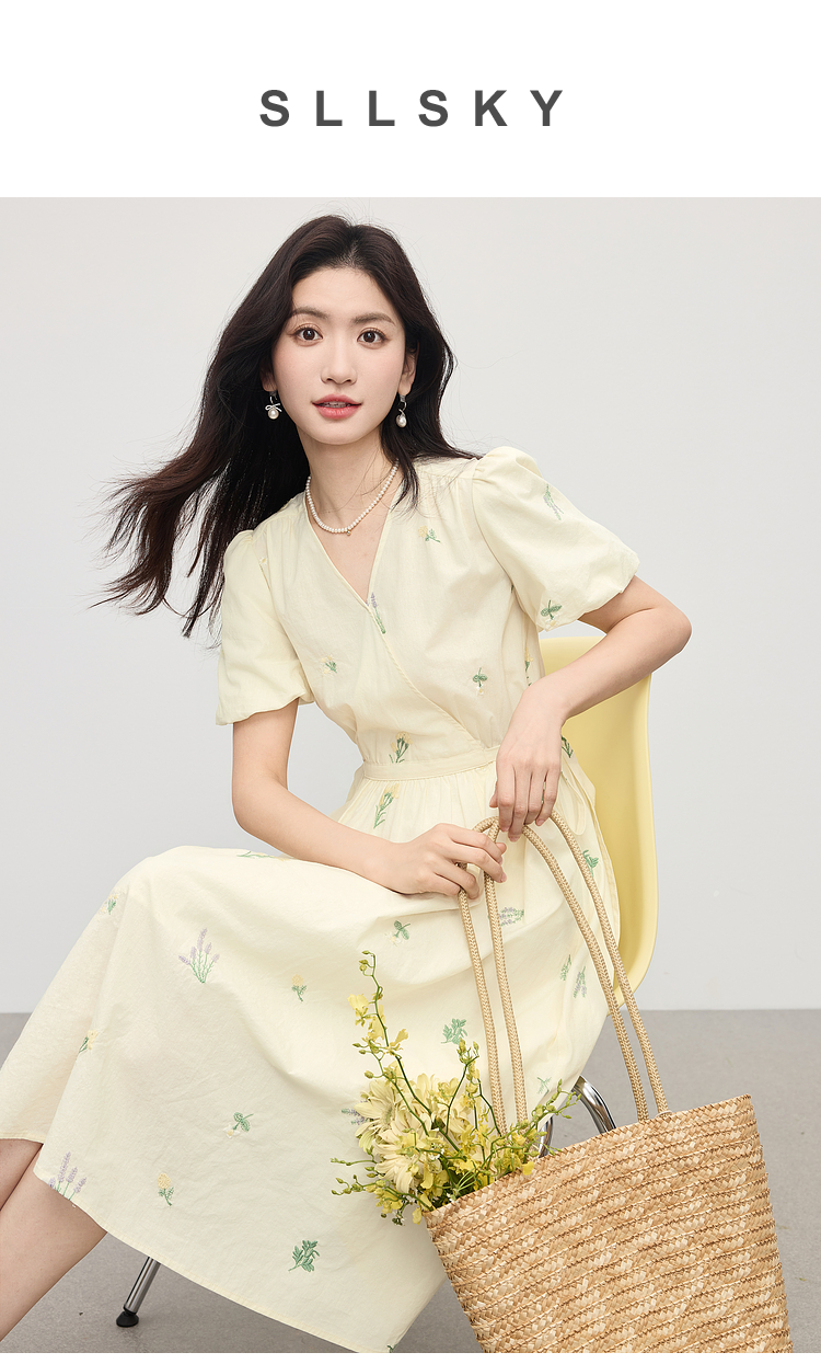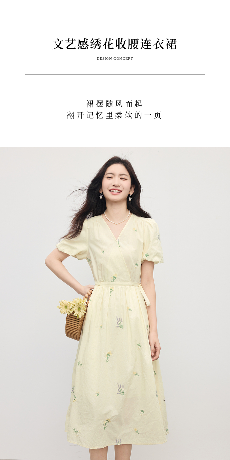 【专属特价】熙世界绣花V领连衣裙女收腰显瘦淡人穿搭法式茶歇裙2025夏季新款