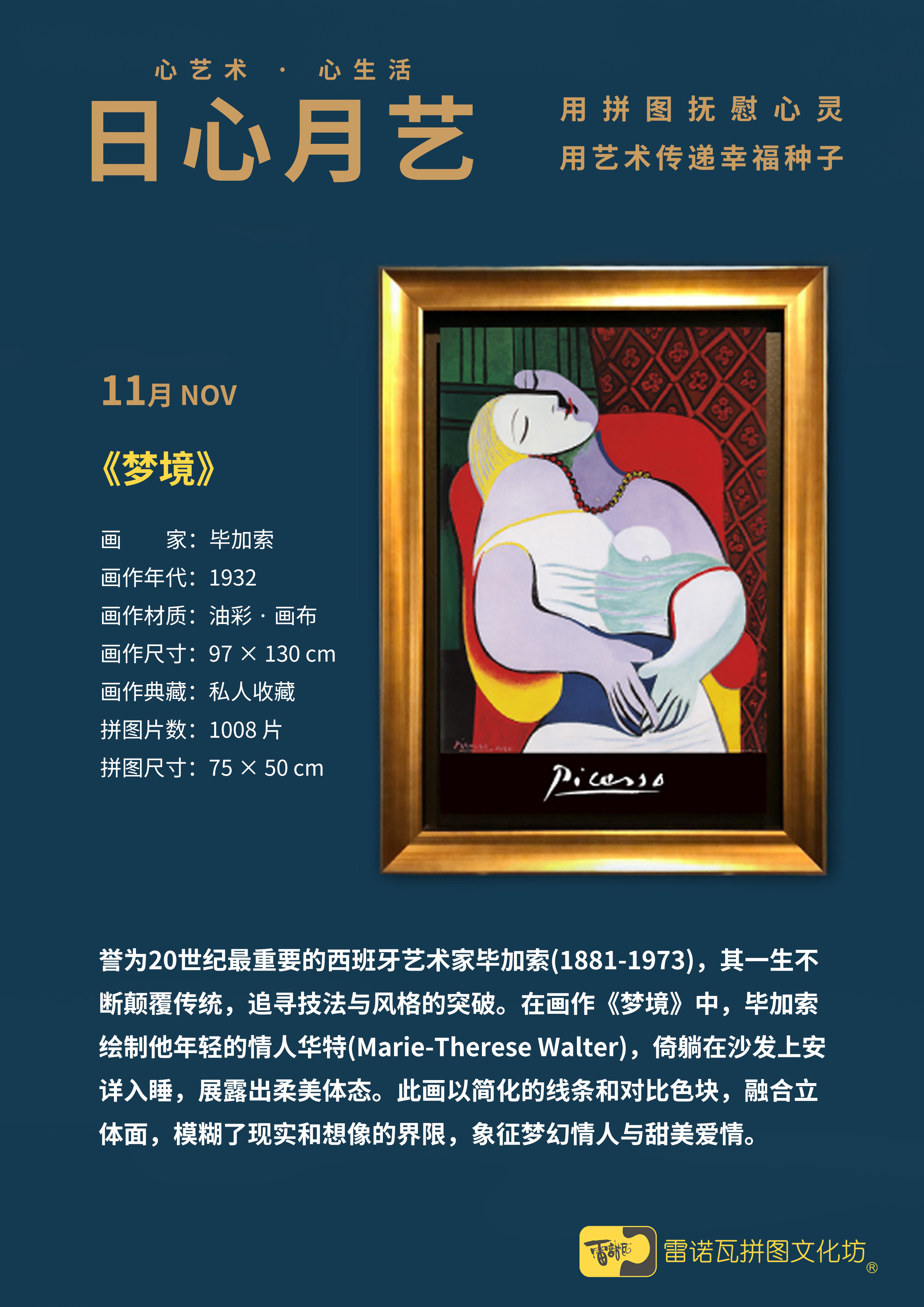 这幅画创作于1932年,画中主角为毕卡索的情人华特,倚在沙发上安祥入睡,展露出柔美体态。此画以简化的线条和对比色块表现,融合立体与平面,模糊了现实和想像的界限,象征梦幻情人与甜美爱情。