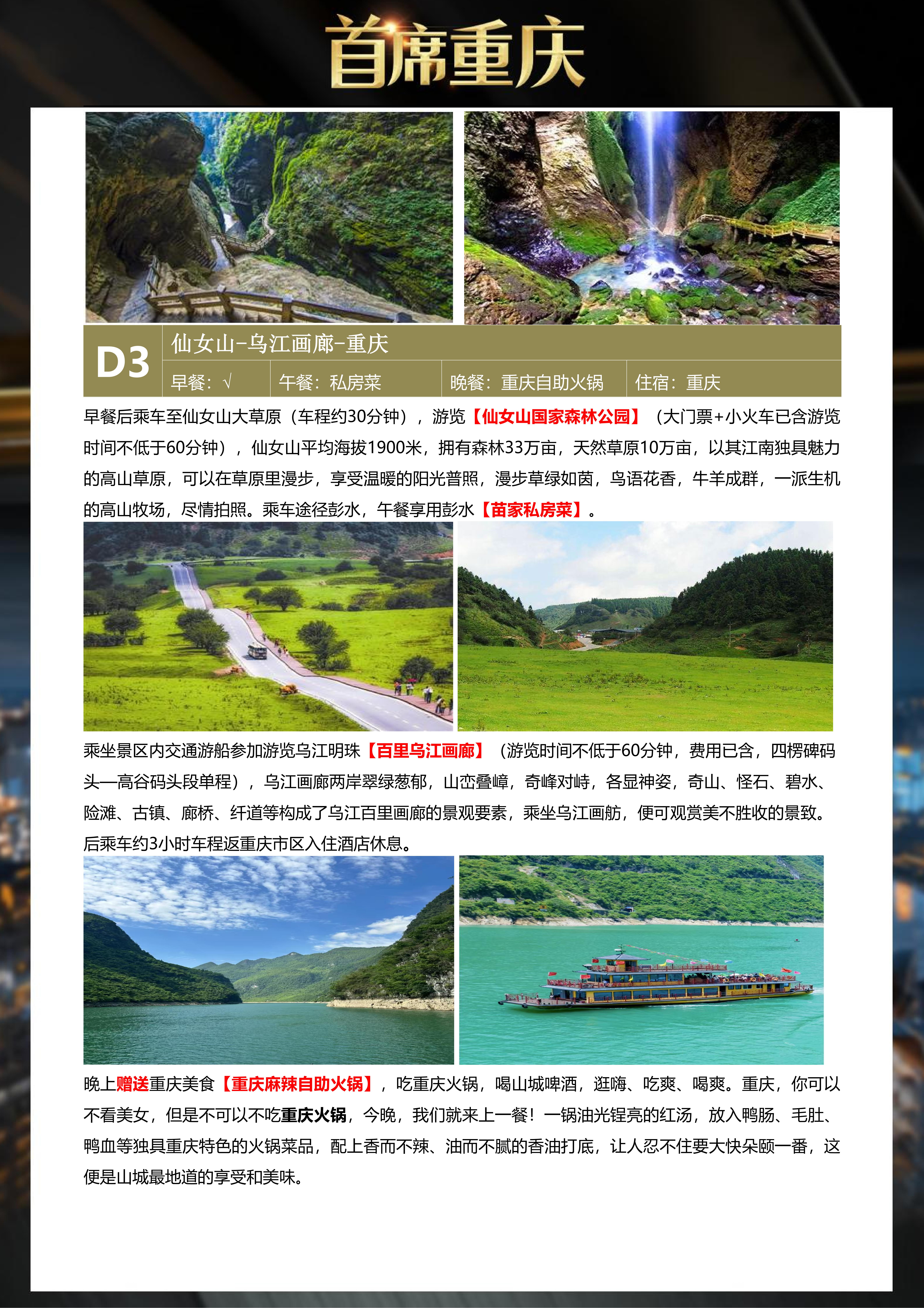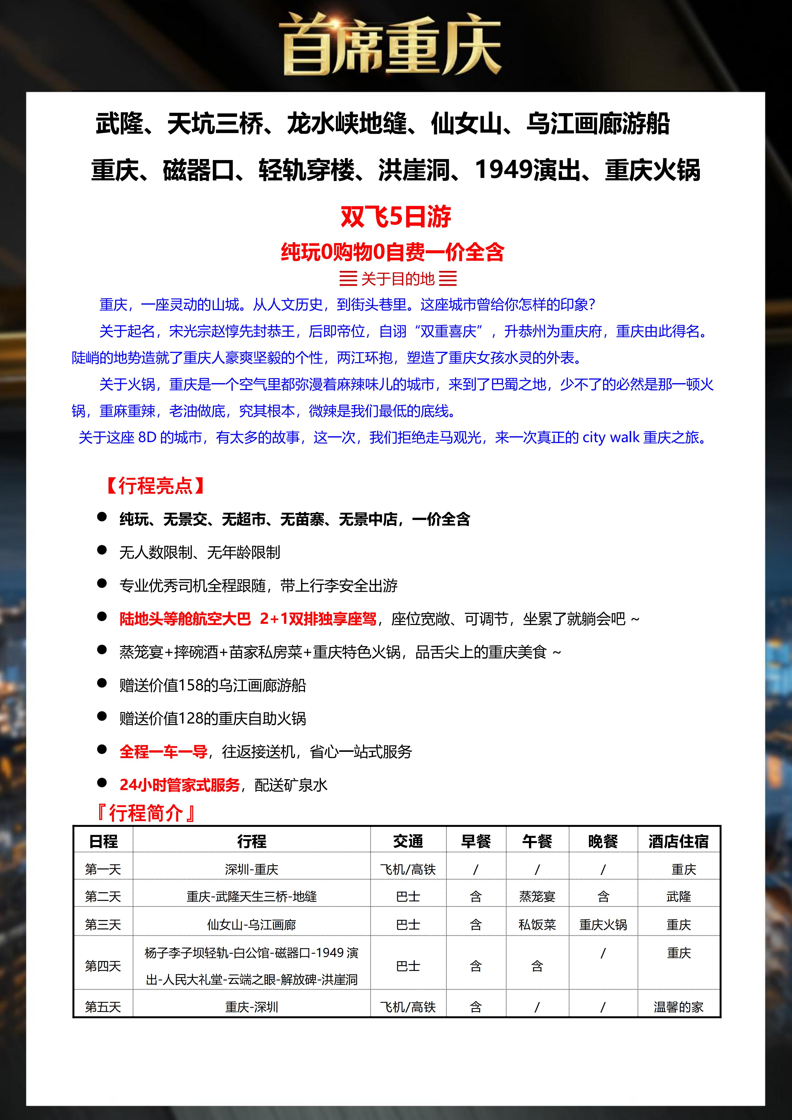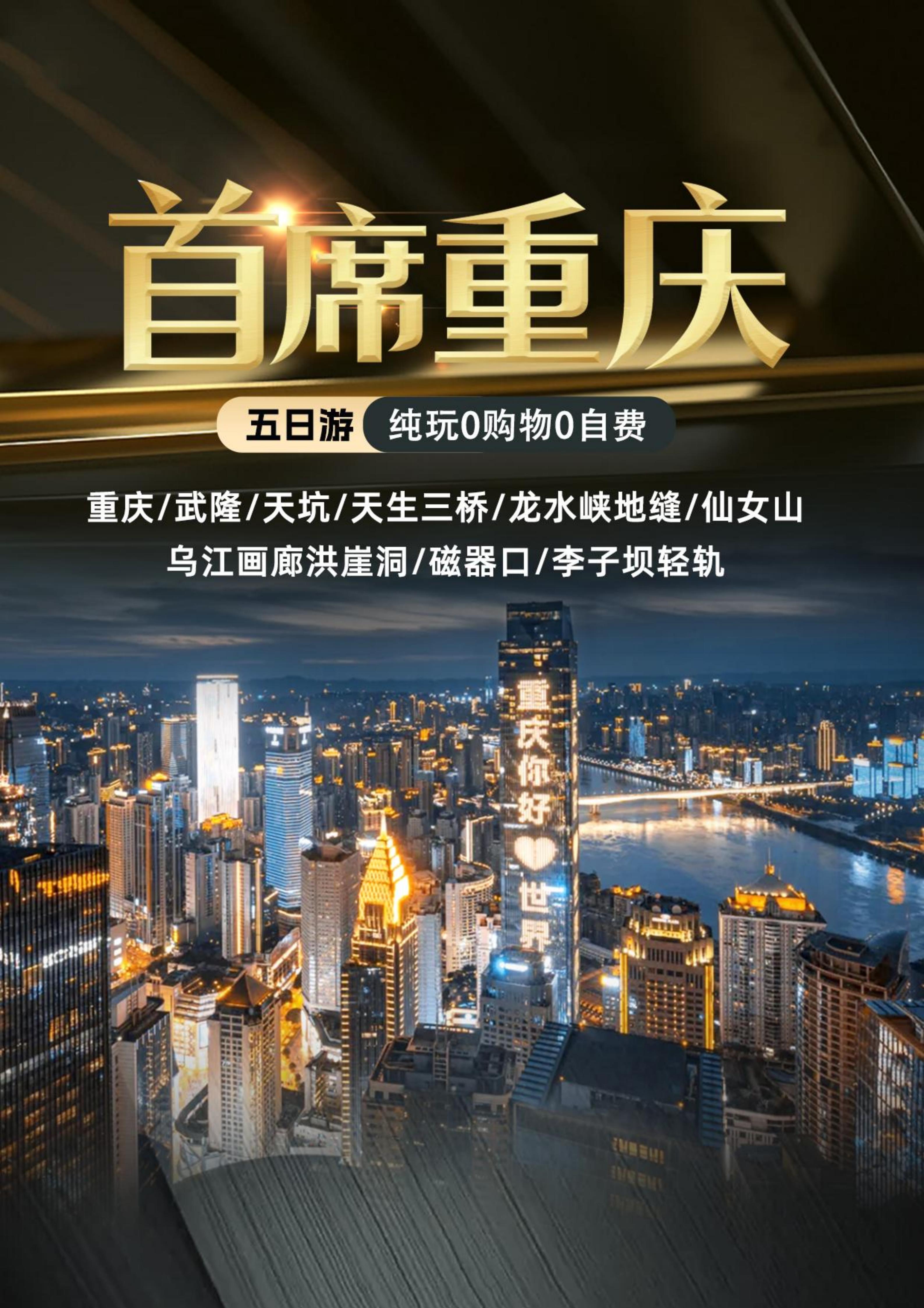 <重庆5天双飞纯玩团>武隆、天坑三桥、龙水峡地缝、仙女山、乌江画廊游船 重庆、磁器口、轻轨穿楼、洪崖洞、1949演出、重庆火锅