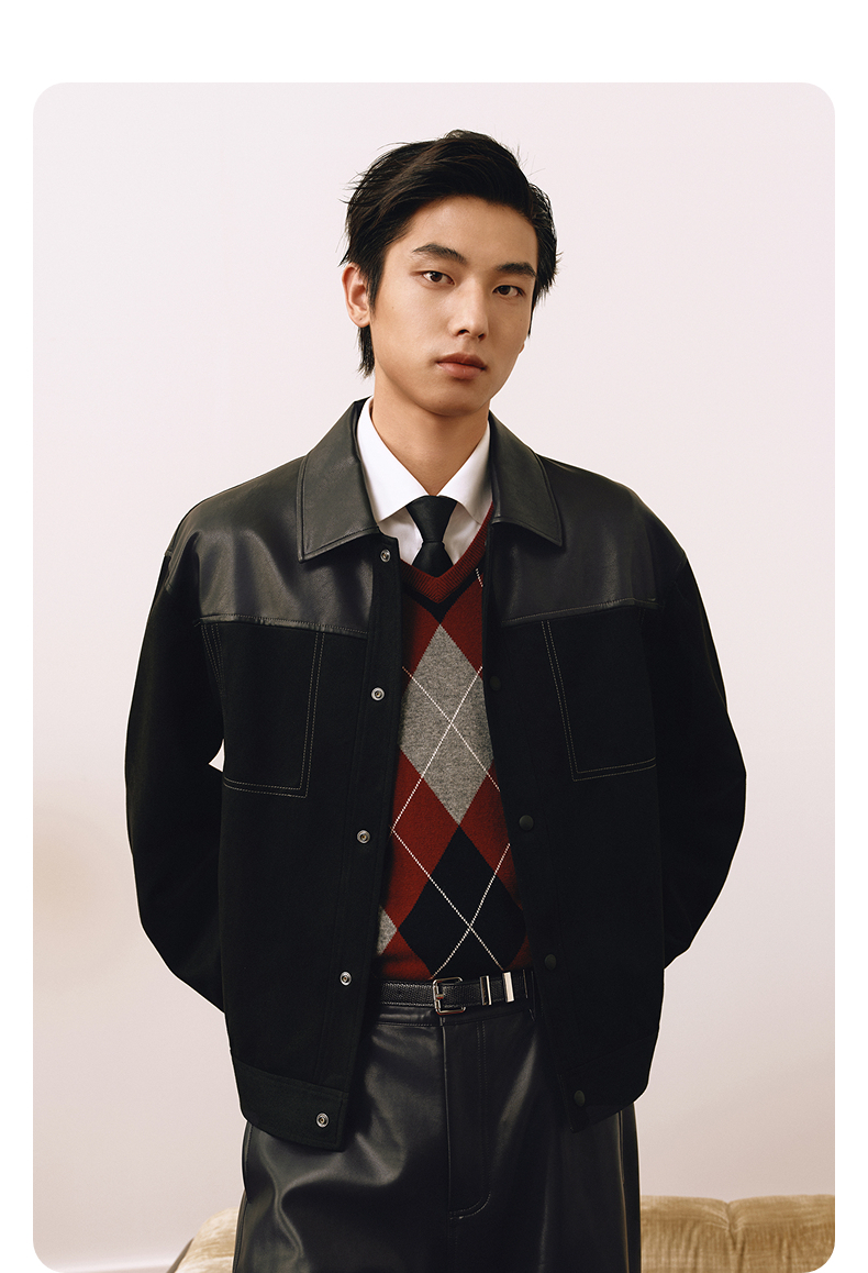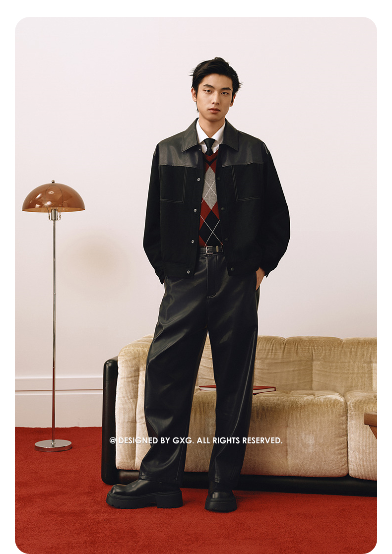 GXG男装 仿麂皮拼接PU撞色拼接明线简约通勤夹克 25年春热卖