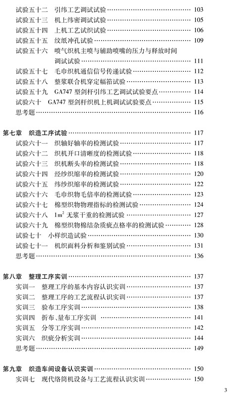 本书分为两部分,第一部分为机织试验,系统介绍了织造各工序在工艺、设备、操作、质量控制、管理等方面的试验。第二部分为机织实训,重点介绍了较为典型国产和引进设备的结构、关键部件、工艺流程、安装与调试、机上工艺参数调试、故障检修、操作要点等,并介绍了织物整理操作要点(如验布、折布定等、织疵分析等)。