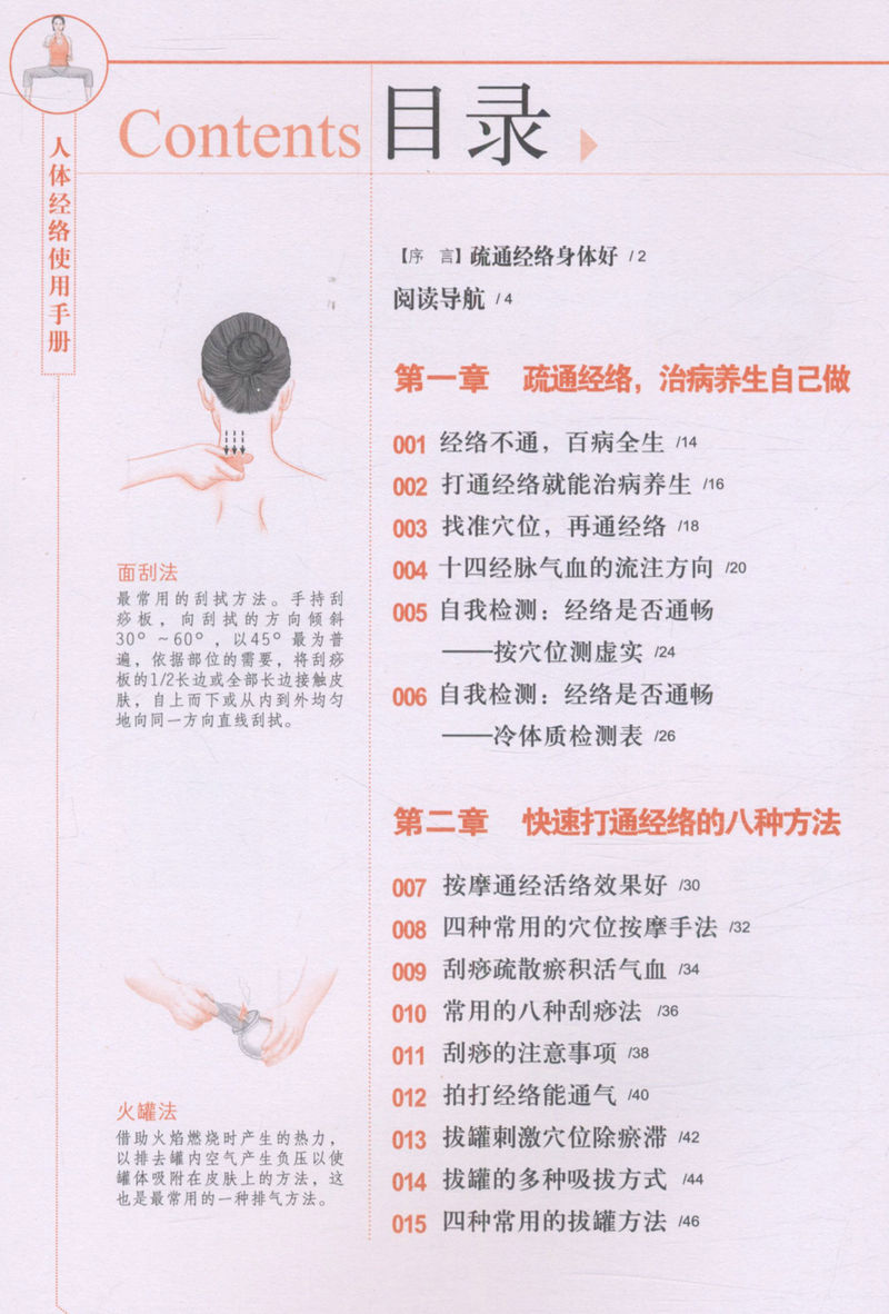 人体中的经络联系了人体中脏器与脏器,使人体成为一个有机的整体。经络出现问题人体就会生病。这本《人体经络使用手册》就人体14条经络进行介绍,正对每条经脉的点给出相应的疏通方法,这些方法括:按摩、拍打、拔罐、艾灸、刮痧、瑜伽、气功、食疗。本书采用图解形式,不仅将每个经络穴位展示出来,还提供相应的取穴技巧,方便读者疏通经脉。