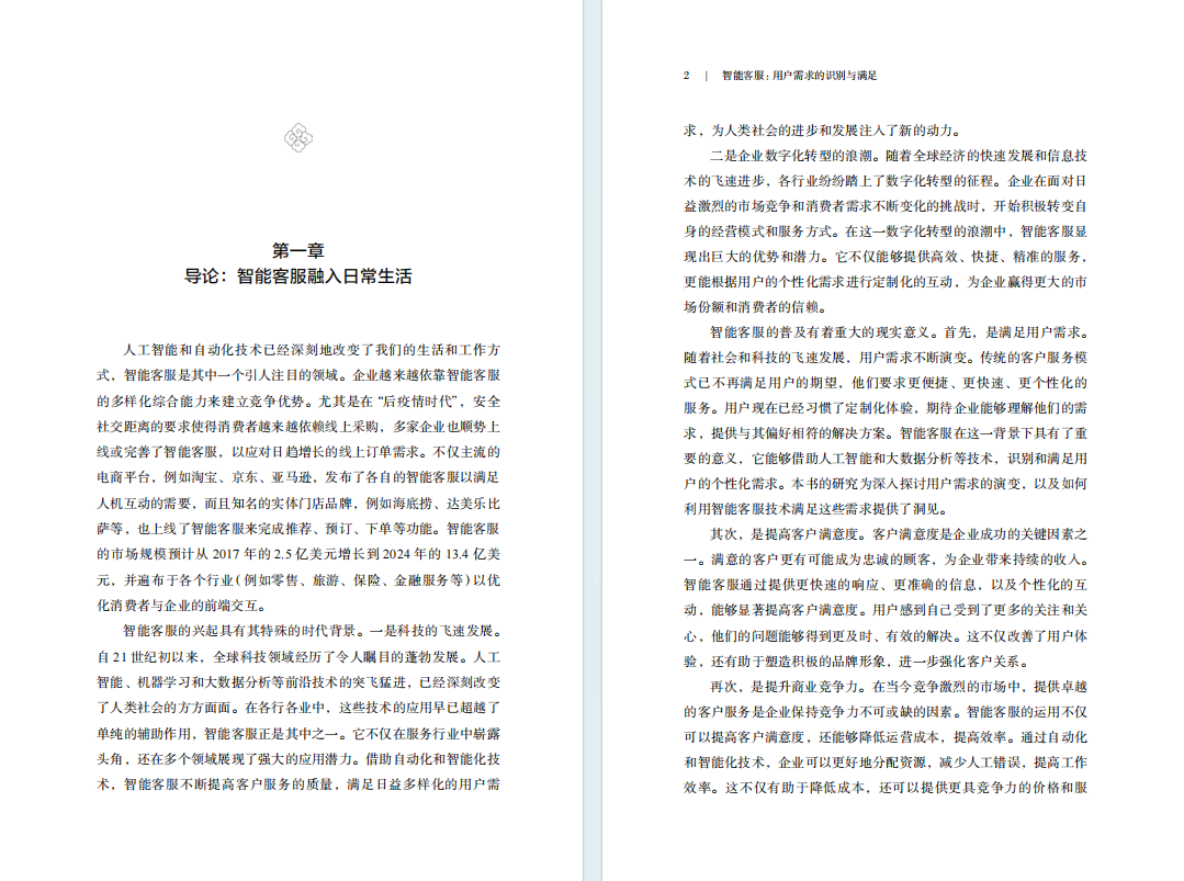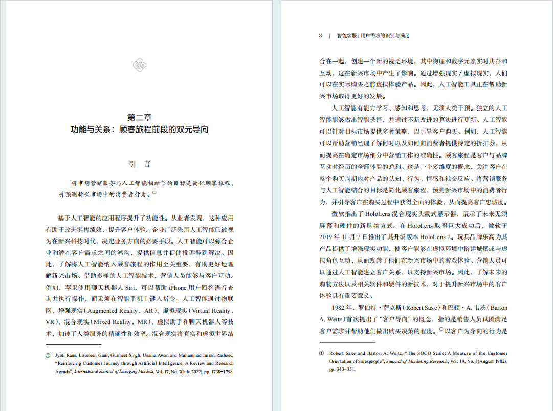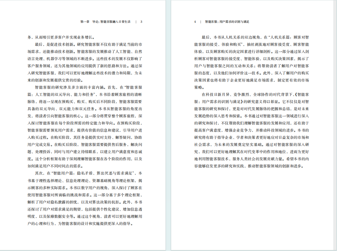 本书在“智能客服篇”,沿顾客旅程的脉络,呈现在预购买、购买、购买后三个阶段,智能客服需要具备的双元导向、能力和任务;强调智能客服的双元特性在提升服务效率的同时,也增强了用户体验的人性化。在“智能用户篇”,基于理性选择理论、信息处理理论、资源基础视角等理论框架,解析用户对隐私保护的担忧和对算法决策的抗拒,讨论顾客在使用智能客服时面临的挑战与需求。在“人机关系篇”,则对顾客接受度、智能体验以及购买的决定因素进行剖析,揭示用户与智能客服之间的互动和关系。本书不仅在理论层面丰富了相关研究领域的知识和案例,更为现实中智能客服的开发、利用与维护指明方向。