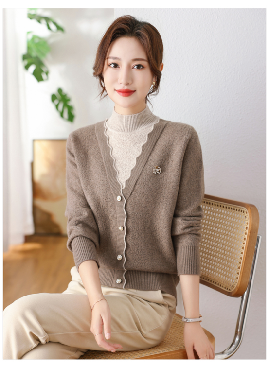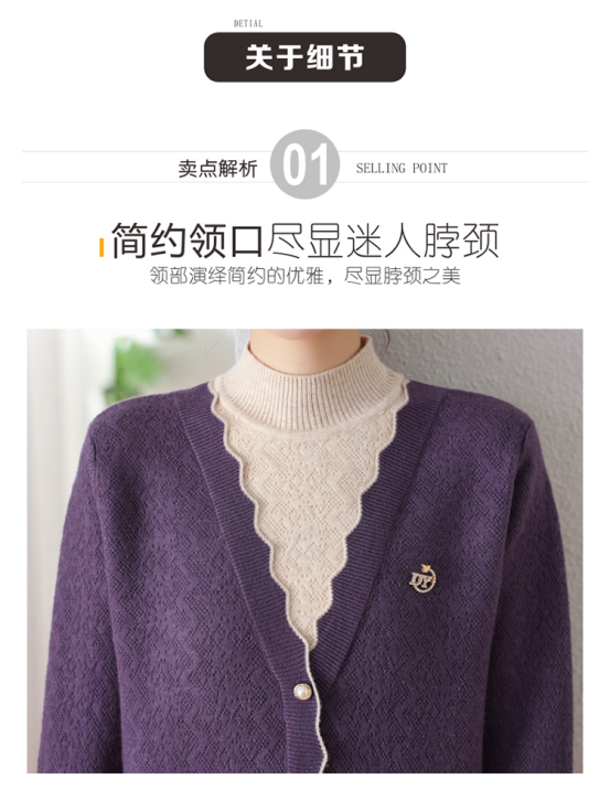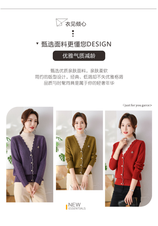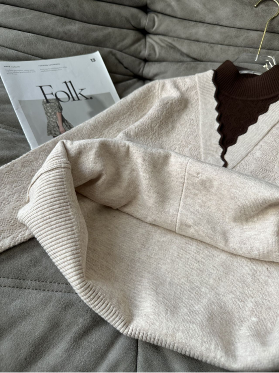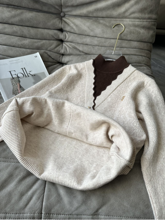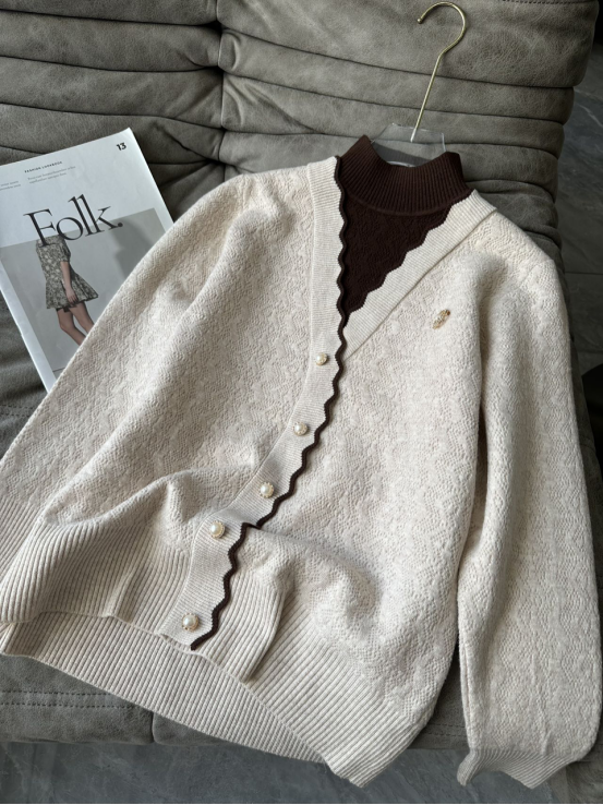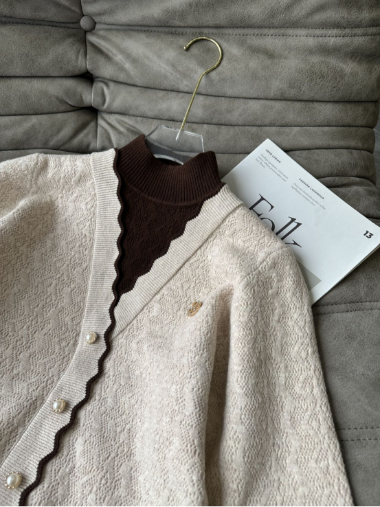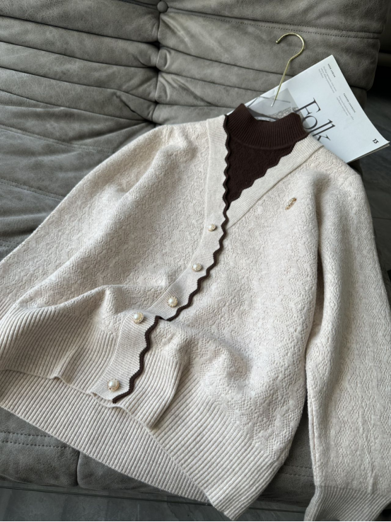 假两件的设计通过巧妙的针织手法和色彩搭配 营造出一种两件衣服叠穿的视觉效果 不仅增加了层次感,还为穿着者节省了搭配的时间和精力 两者相互映衬,仿佛是精心搭配的两件单品 使假两件的感觉更加逼真,为整体造型带来丰富性和趣味性