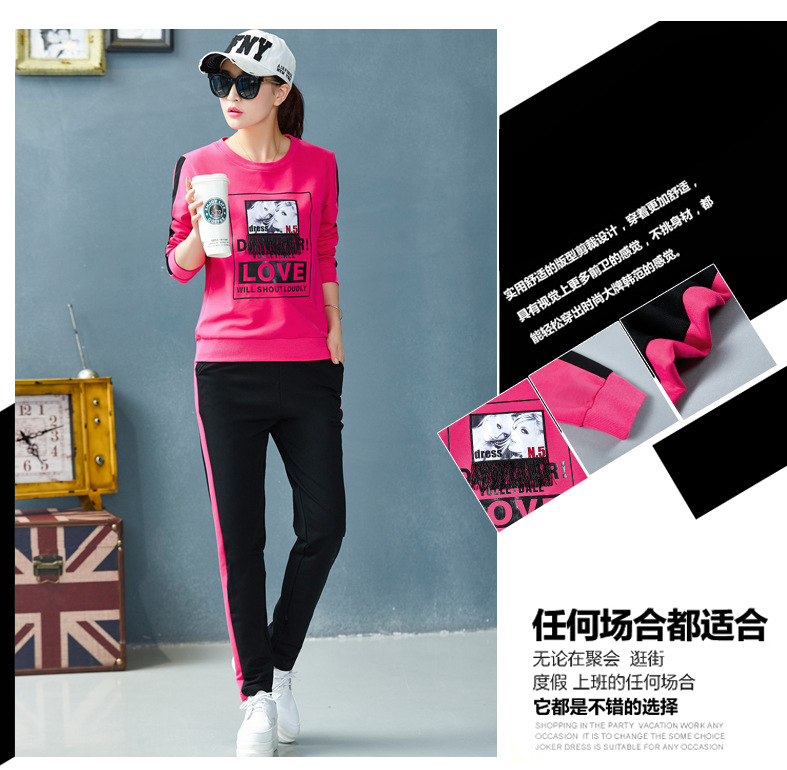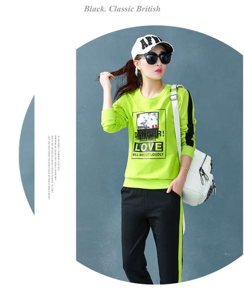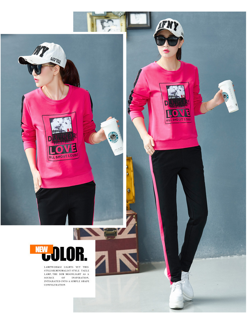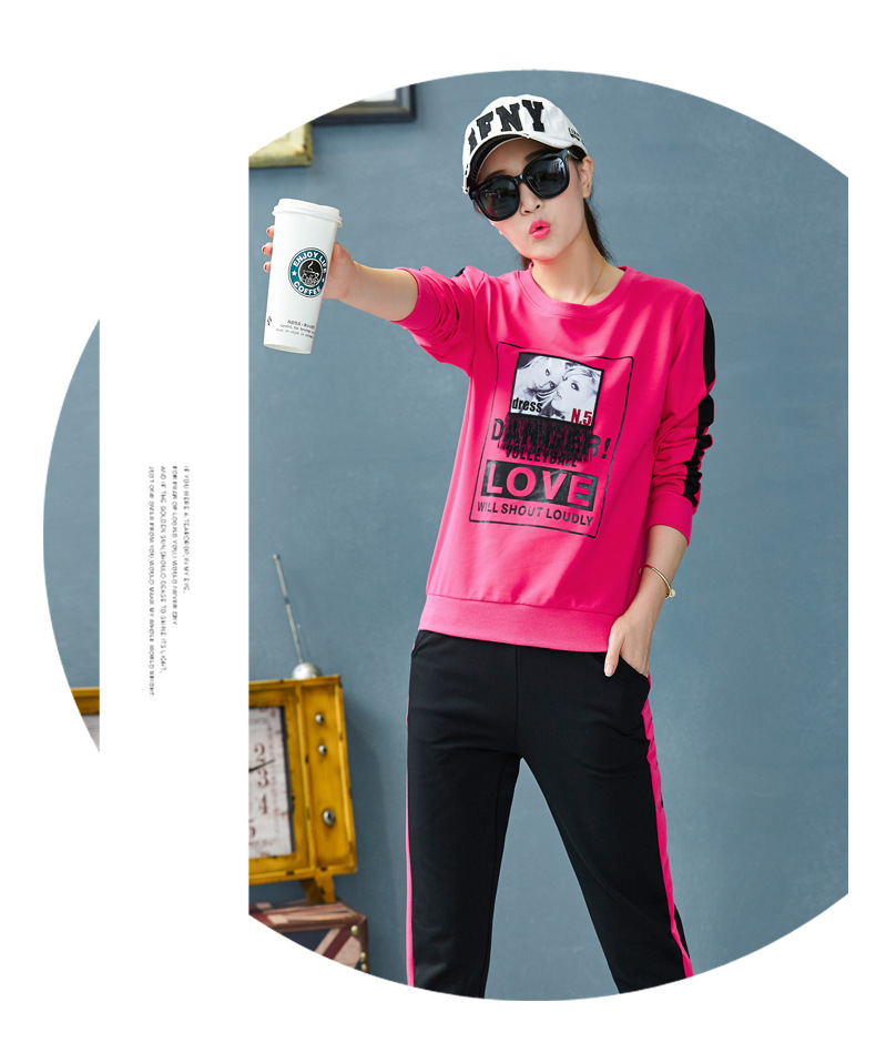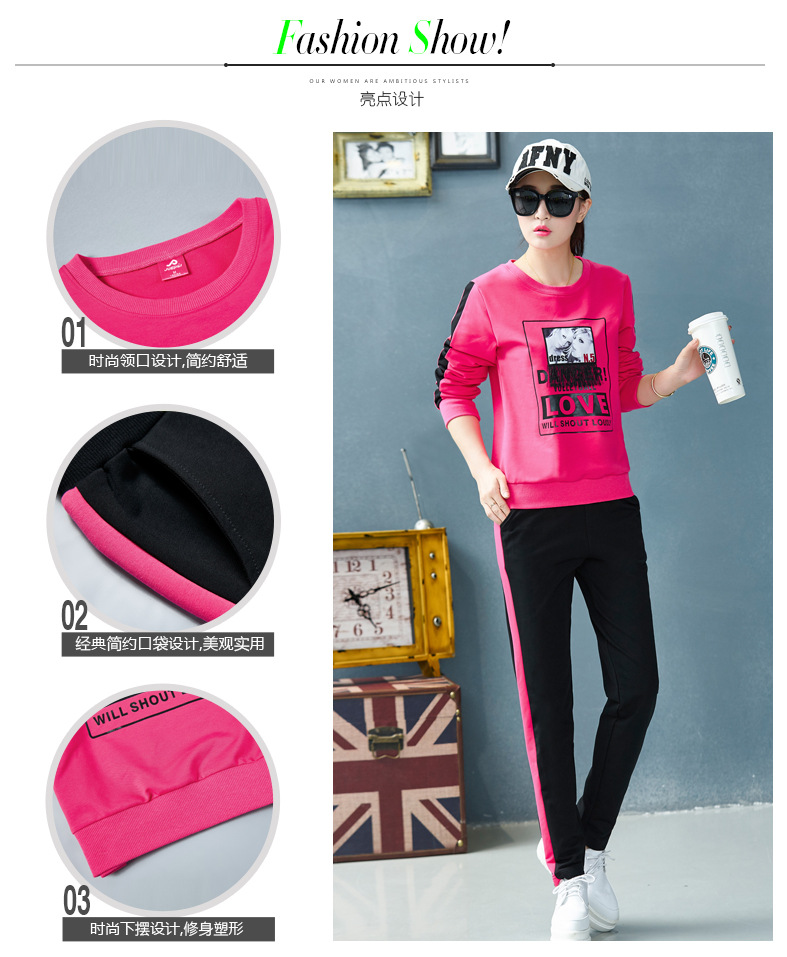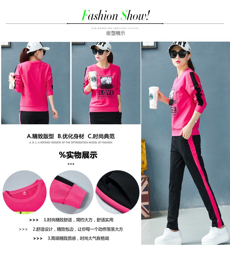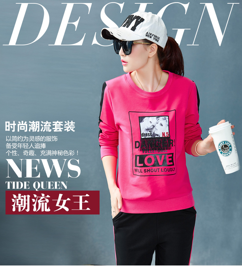 【套装女】宝多芬秋季靓丽女运动服棉质套头运动套装时尚印花条纹女休闲套装