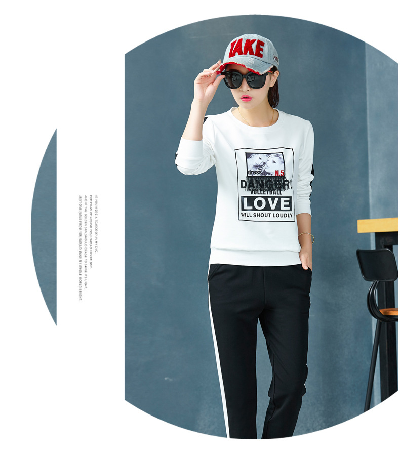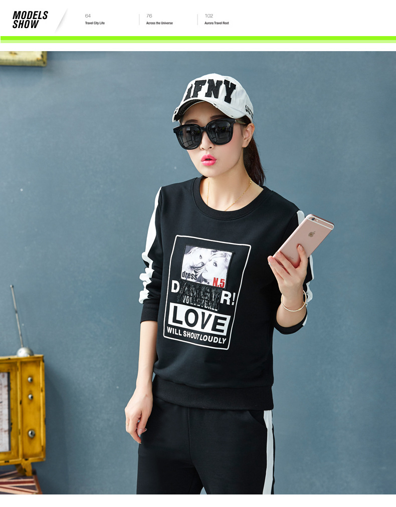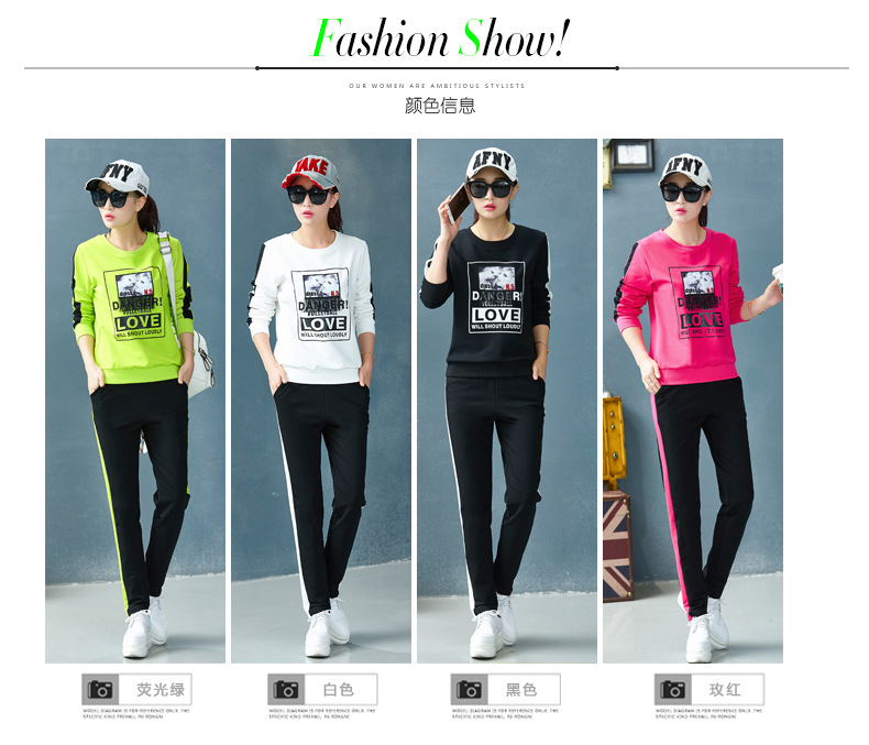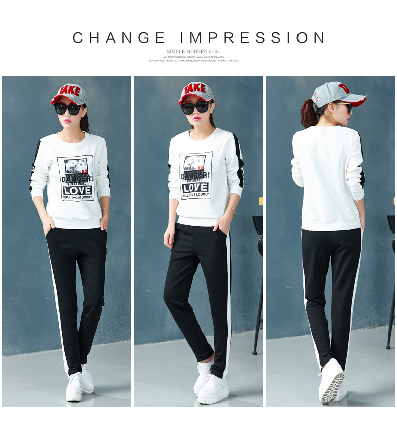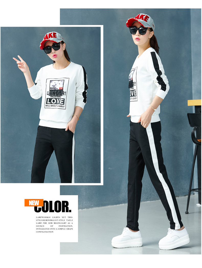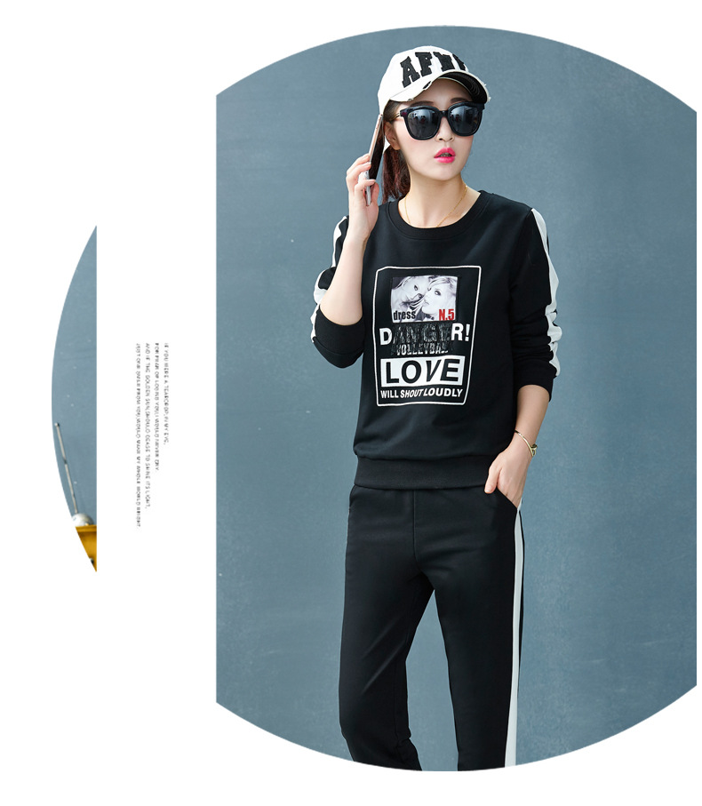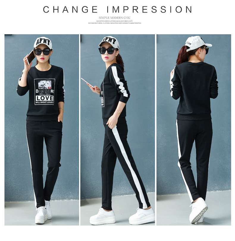 【套装女】宝多芬秋季靓丽女运动服棉质套头运动套装时尚印花条纹女休闲套装