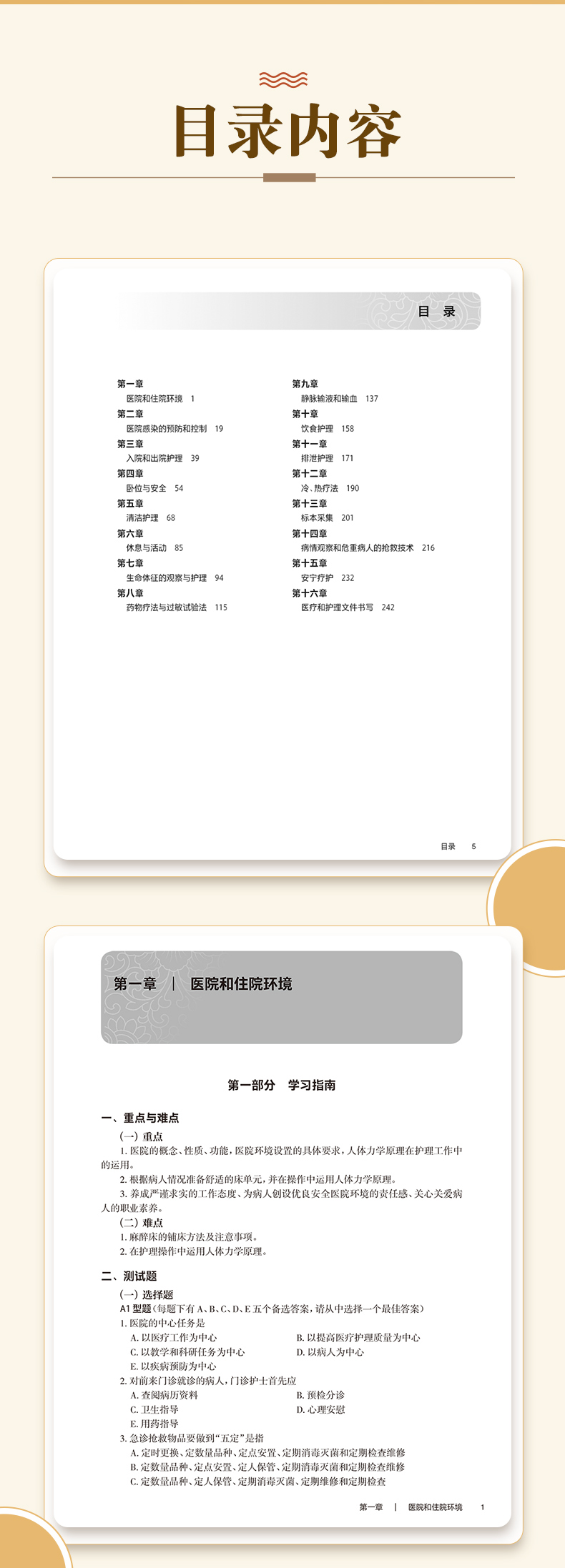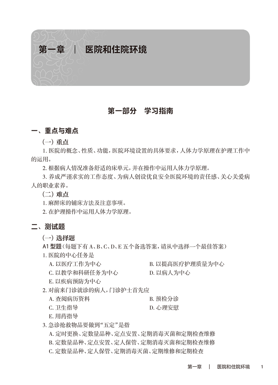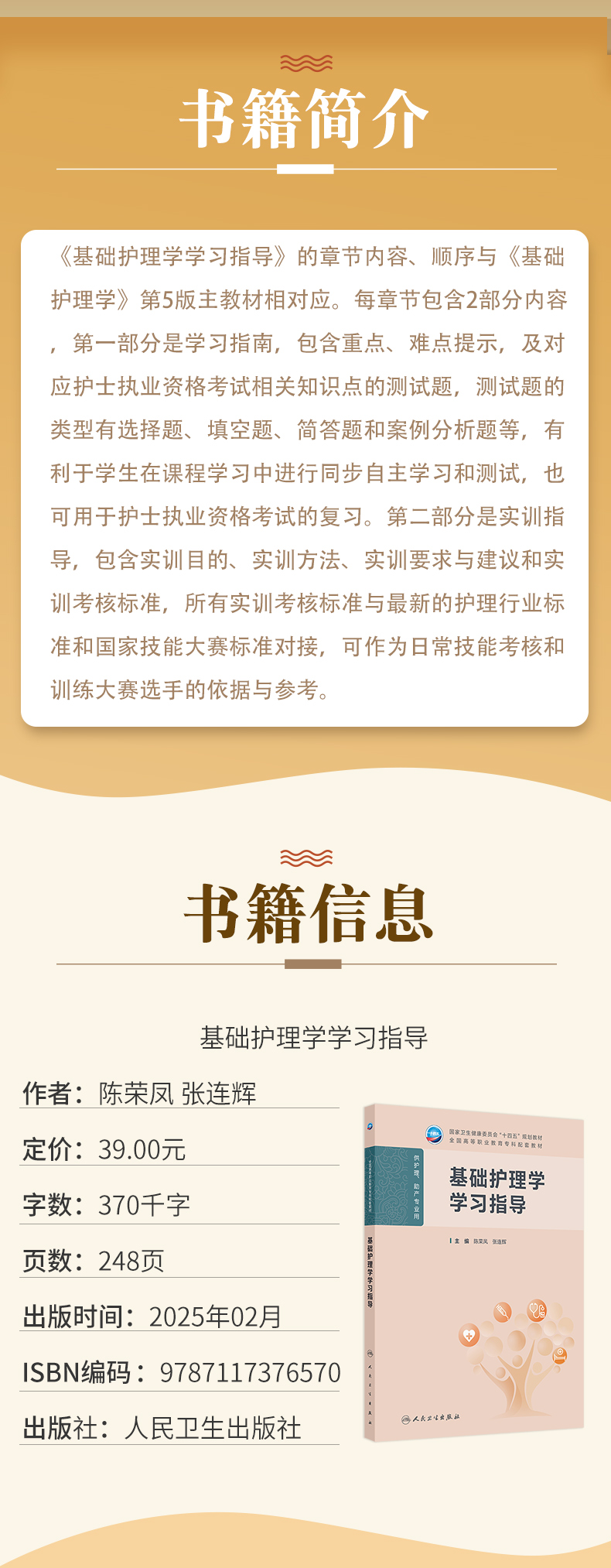 《基础护理学学习指导》的章节内容、顺序与《基础护理学》第5版主教材相对应。每章节包含2部分内容,第一部分是学习指南,包含重点、难点提示,及对应护士执业资格考试相关知识点的测试题,测试题的类型有选择题、填空题、简答题和案例分析题等,有利于学生在课程学习中进行同步自主学习和测试,也可用于护士执业资格考试的复习。第二部分是实训指导,包含实训目的、实训方法、实训要求与建议和实训考核标准,所有实训考核标准与最新的护理行业标准和国家技能大赛标准对接,可作为日常技能考核和训练大赛选手的依据与参考。