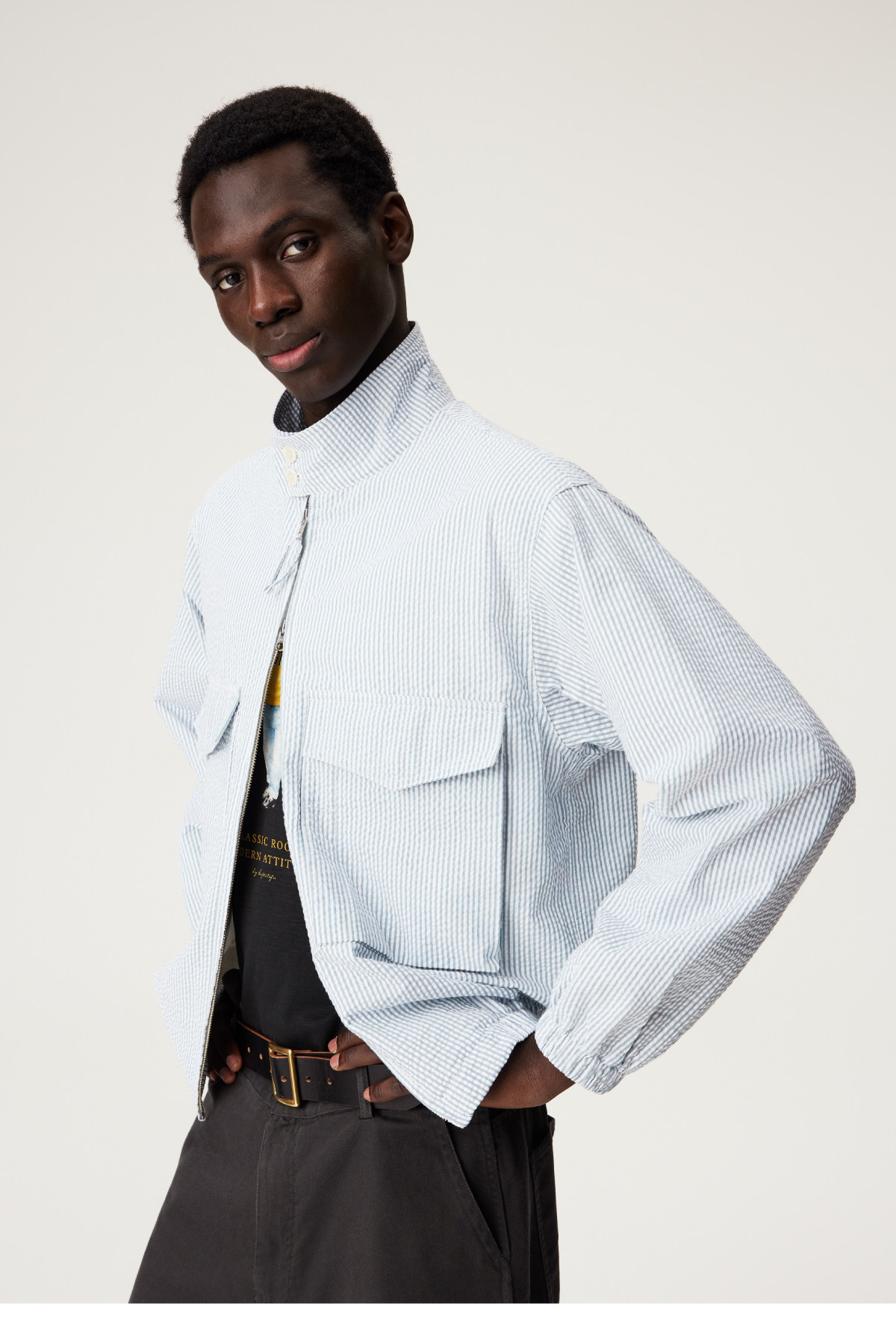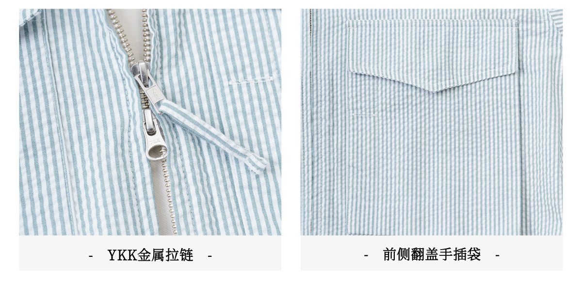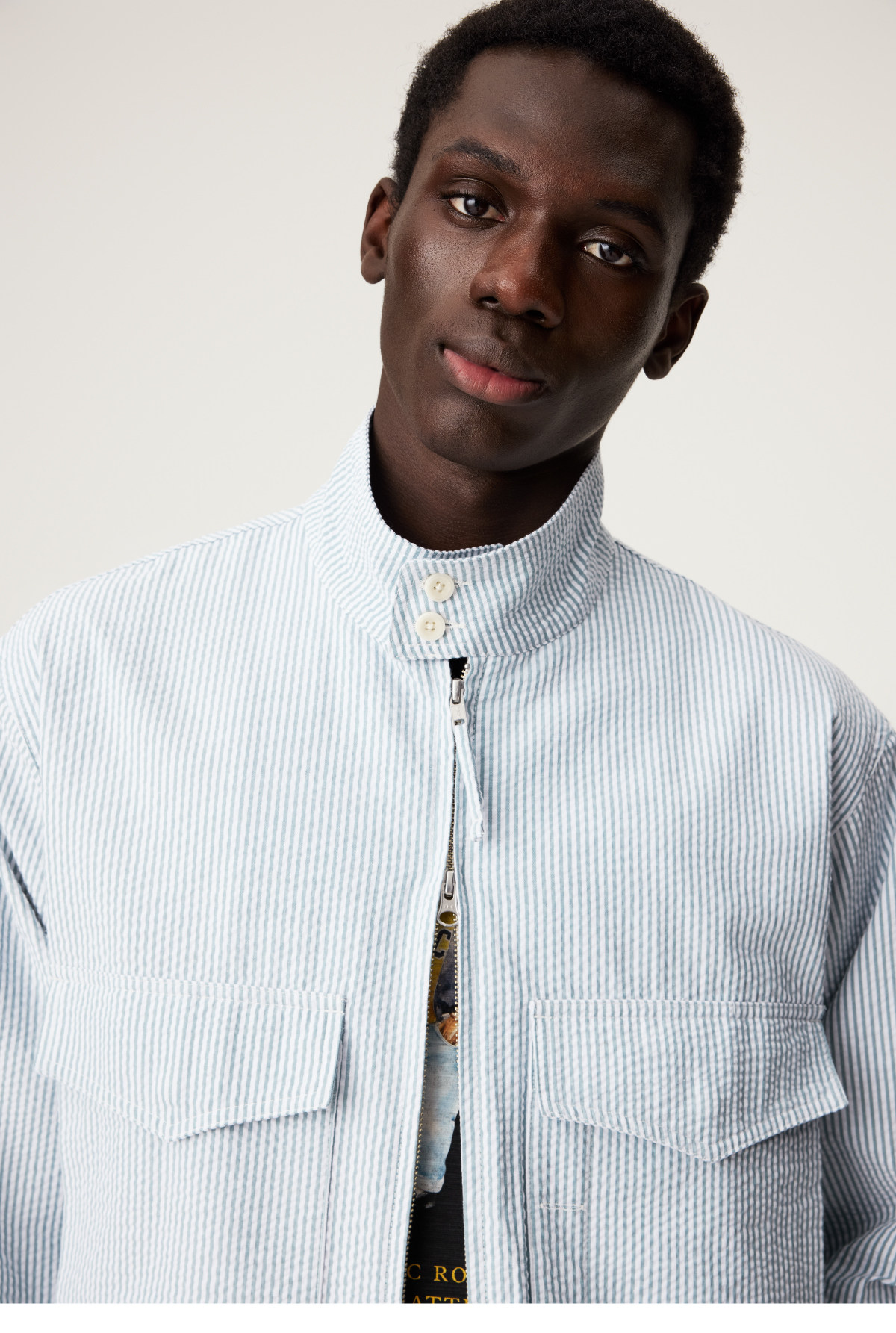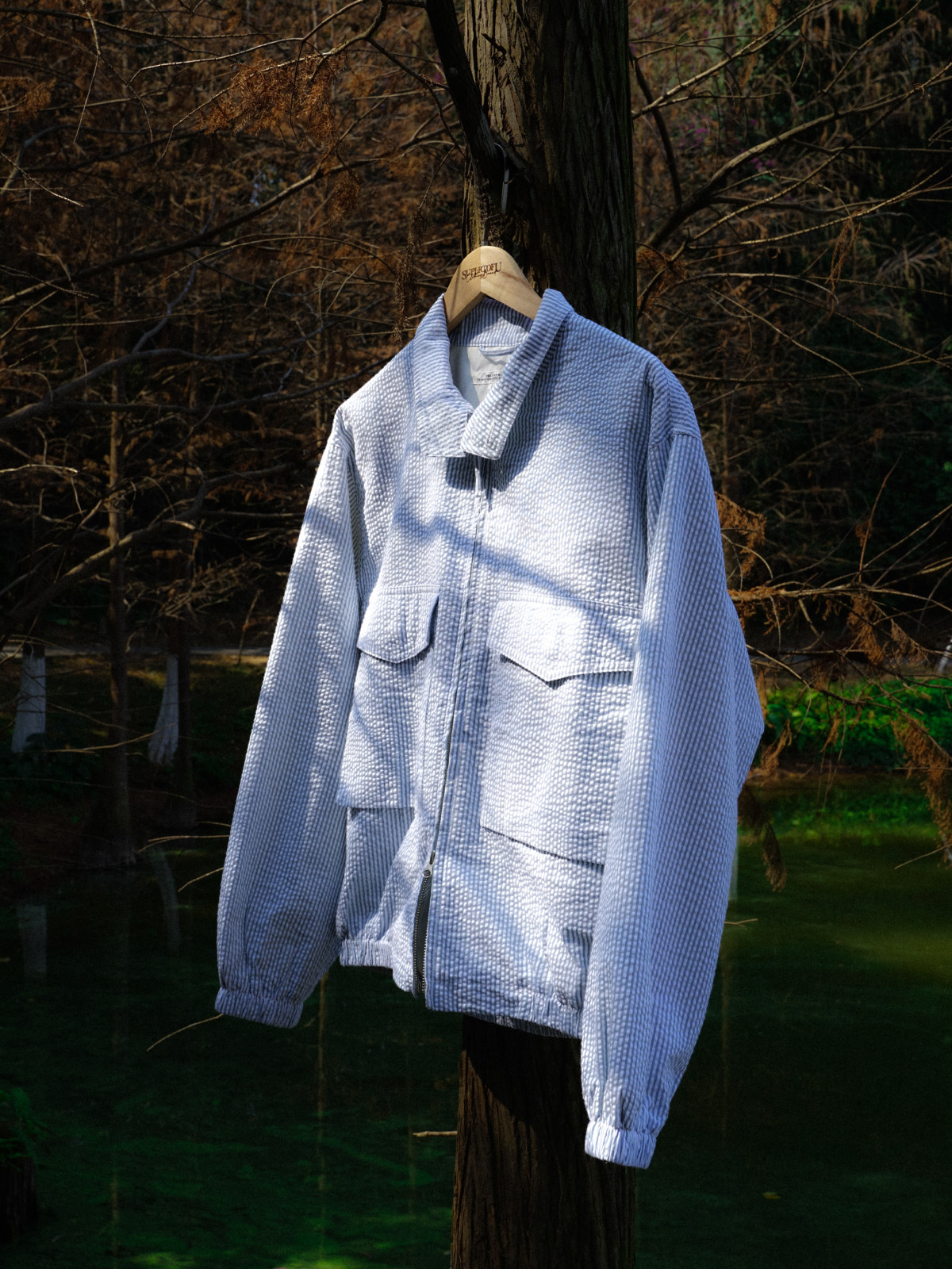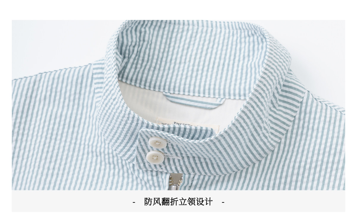 SUPERTOFU(SPTF)/CMKS-SS26-J298/泡泡纱肌理感 立领双口袋 绿色条纹 拉链衬衫外套