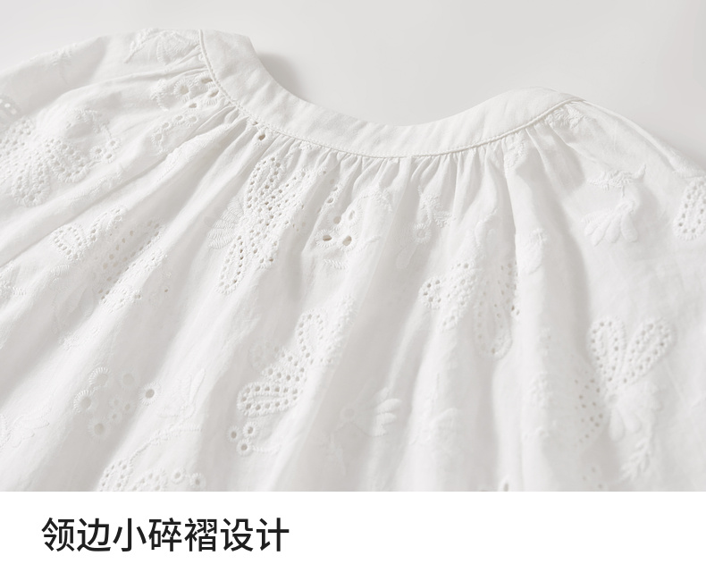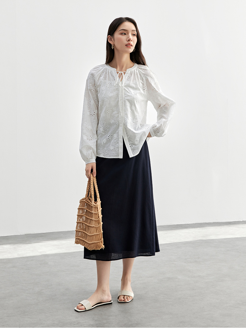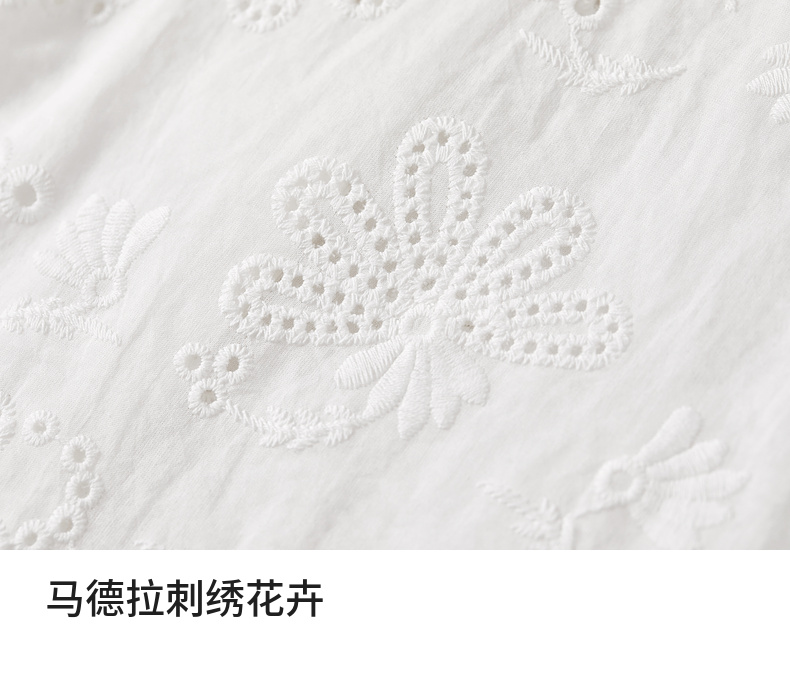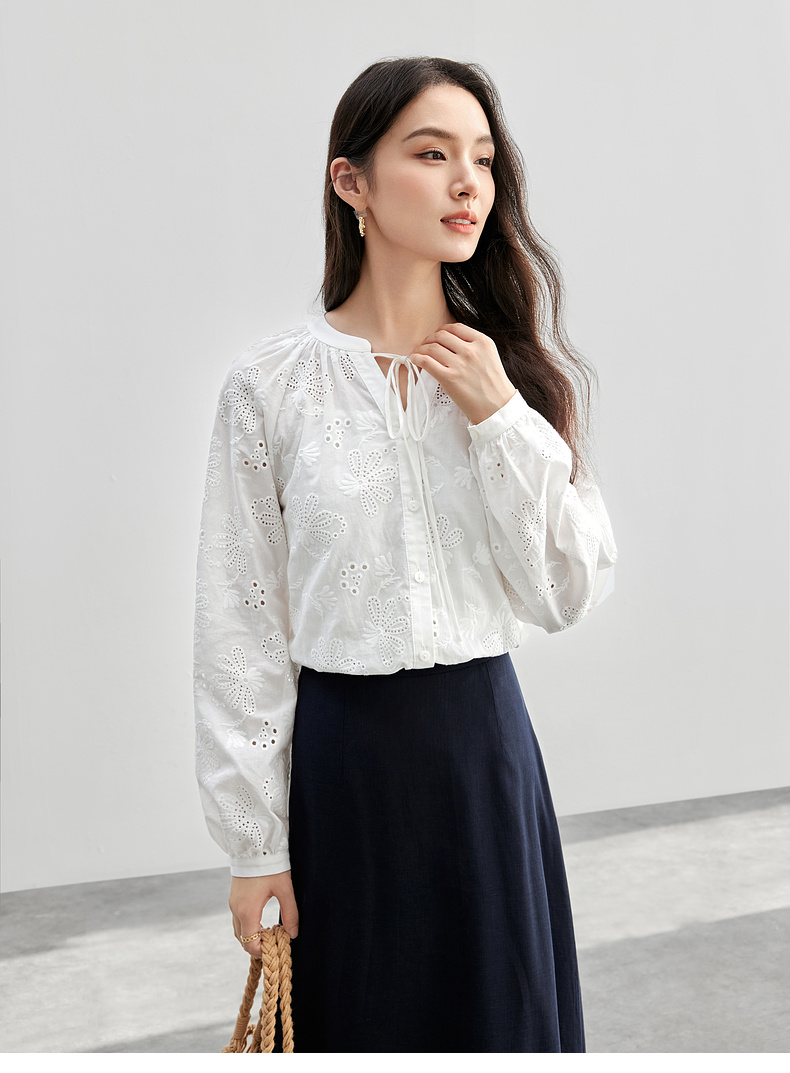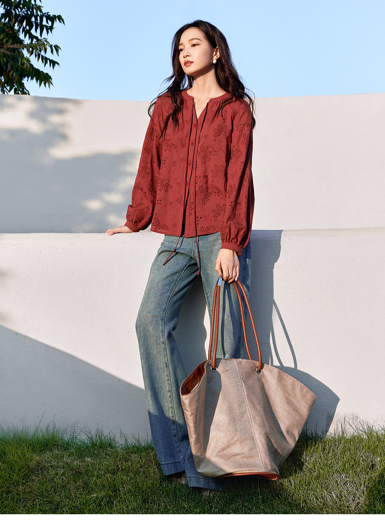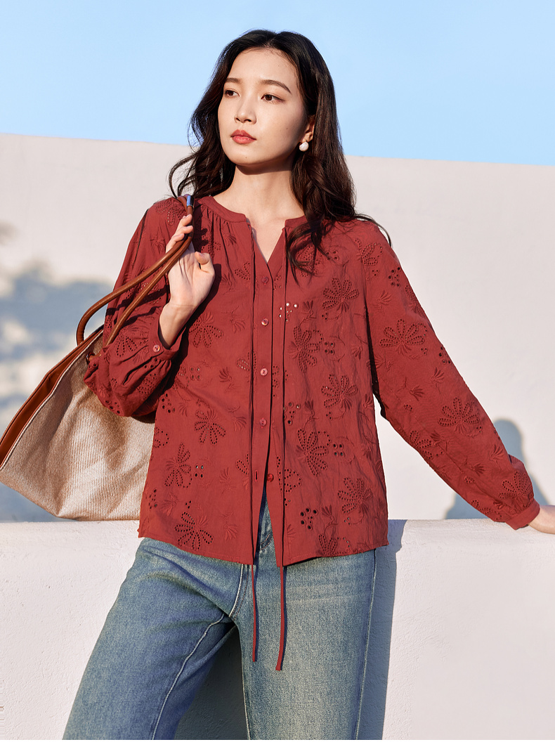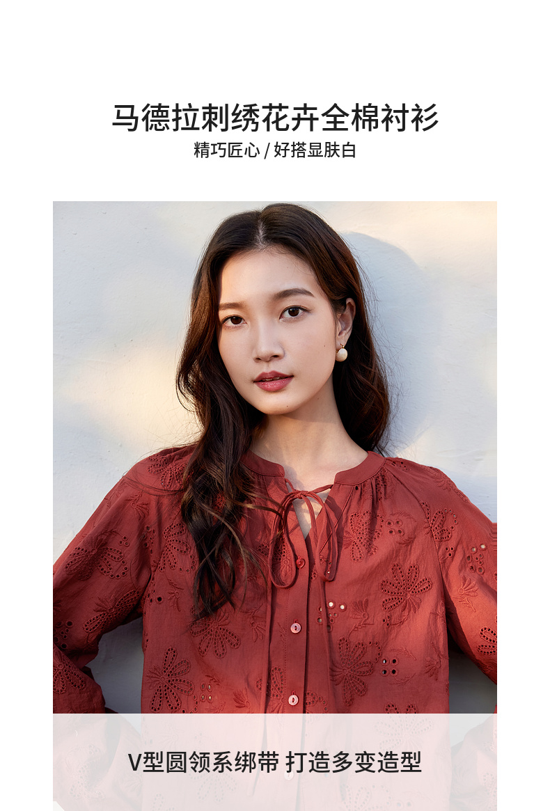 【尚都比拉】【马德拉刺绣系列】安可拉红优雅度假民族风V型圆领系绑带棉衬衫-151C58156