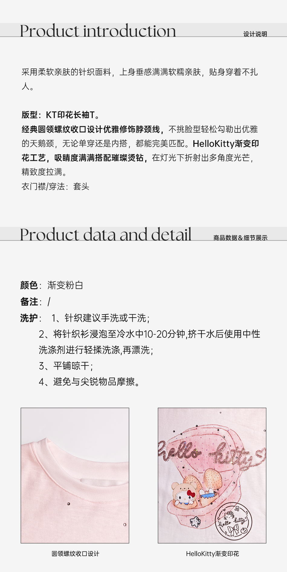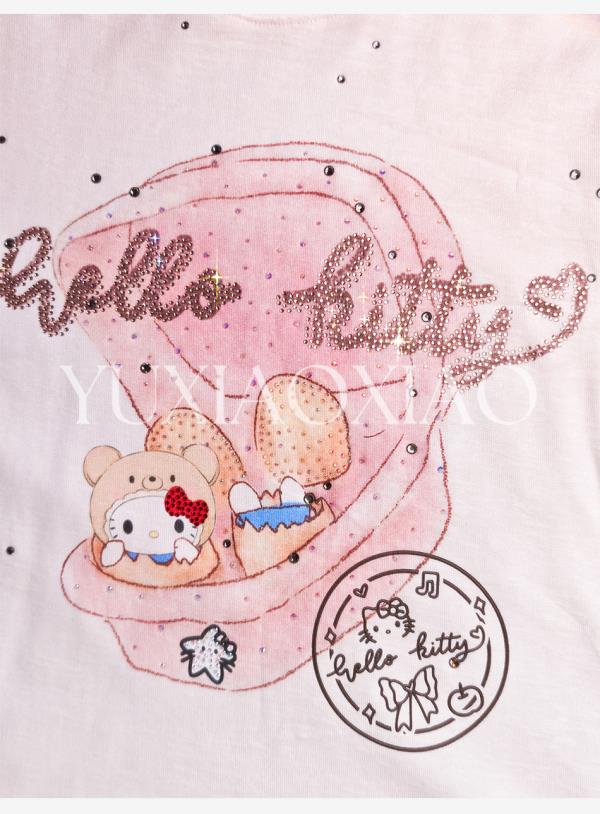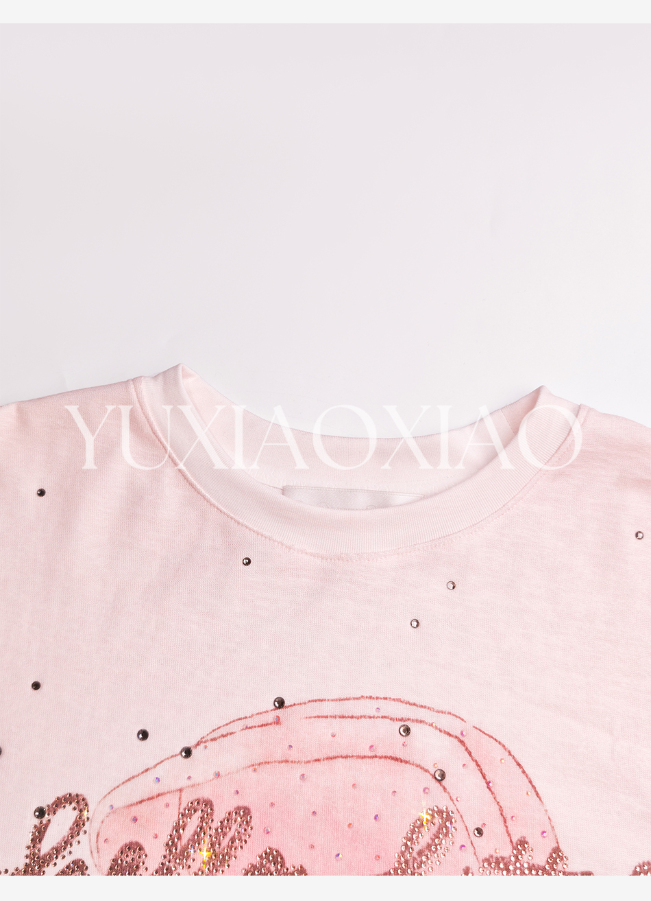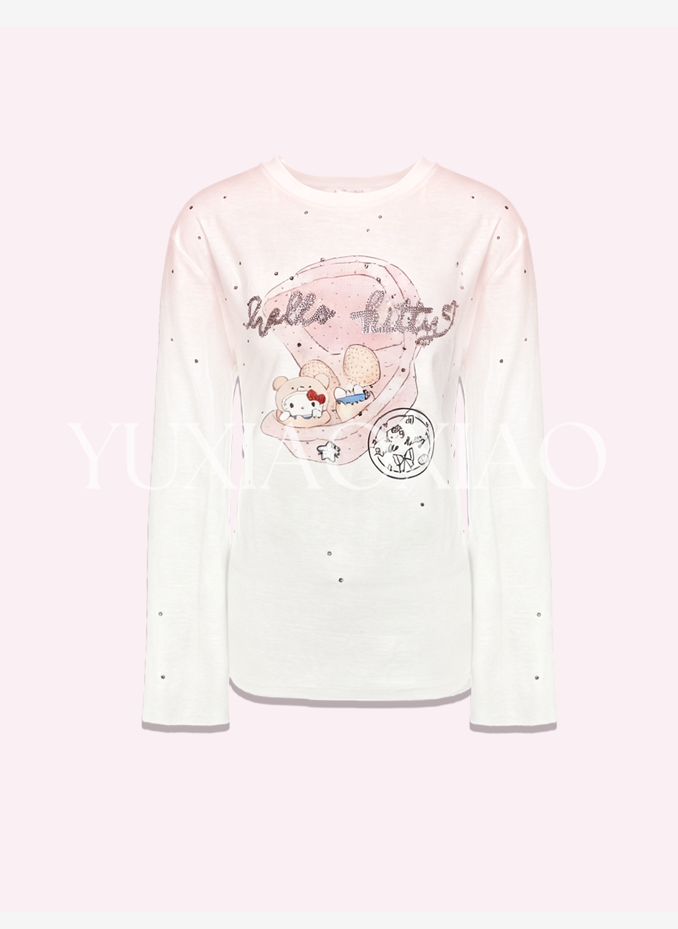 余潇潇【猫咪许愿池】时尚卡通印花渐变烫钻百搭宽松圆领长袖T恤