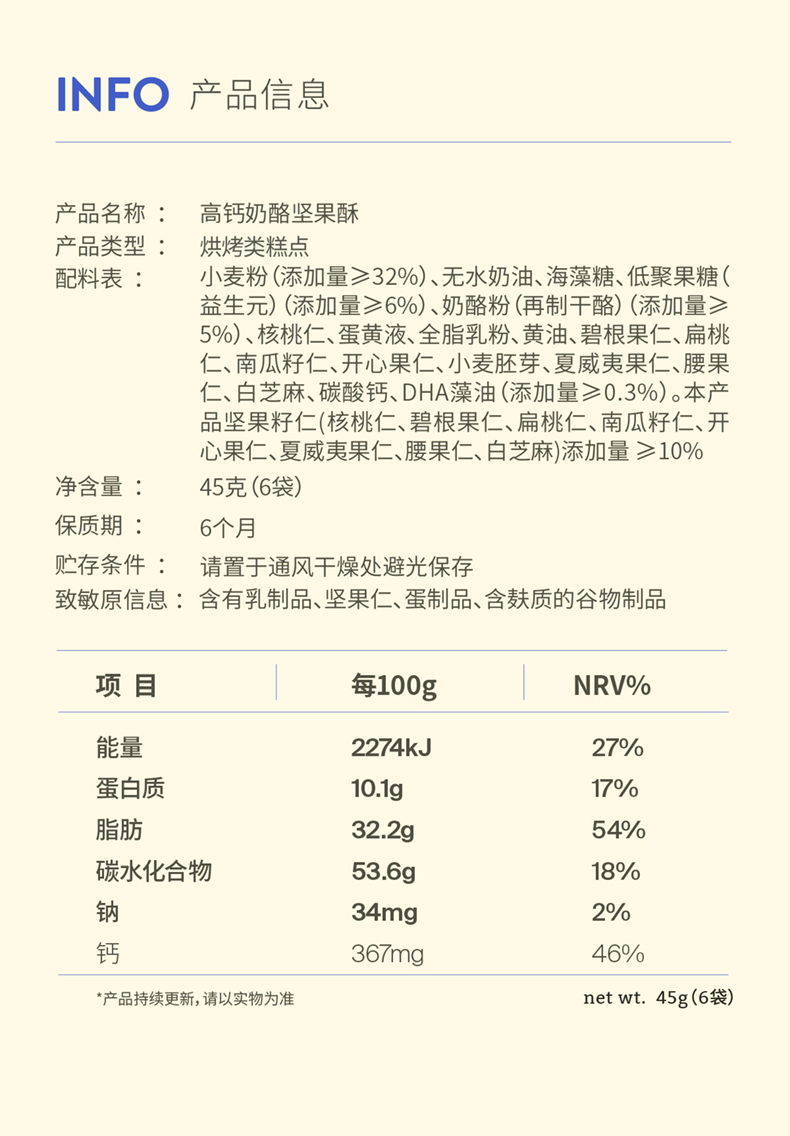 【奶酪博士】高钙奶酪坚果酥 8种坚果籽仁添加DHA澡油益生元 45g/袋(6小袋)*3袋