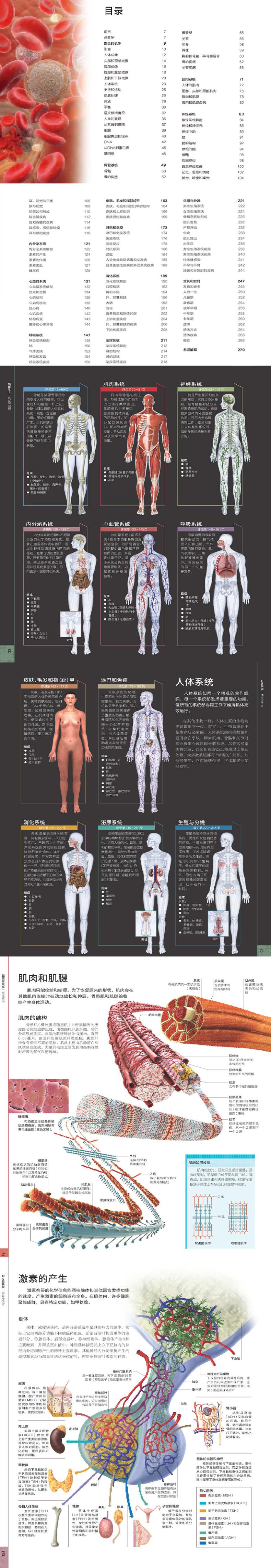 整合的机体,解释了人体各个部分如何在不同大小和层次上协同工作,以产生一个有生命的机体。它还包含了对人体主要系统的概述,通过对整个人体3D医学扫描而变得生动。接下来的章节逐个功能、逐个系统地介绍人体功能。人体11个主要系统依次覆盖,每个部分以影响该系统的常见伤害、疾病和失调来结束。关于生长和发育,详细介绍了人体在人的生命周期过程中是如何变化的。