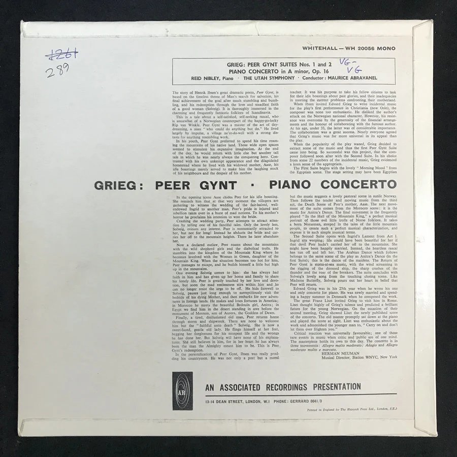 LP黑胶唱片 格里格《培尔·金特组曲》《A小调钢琴协奏曲Op.16》 美国犹他交响乐团 莫里斯·阿布拉瓦内尔指挥厂牌:Whitehall Records