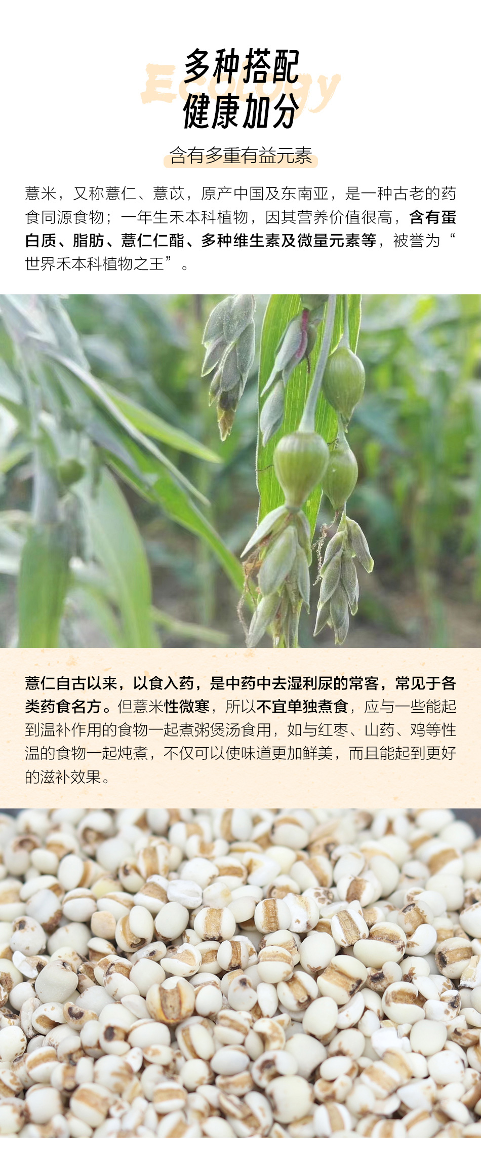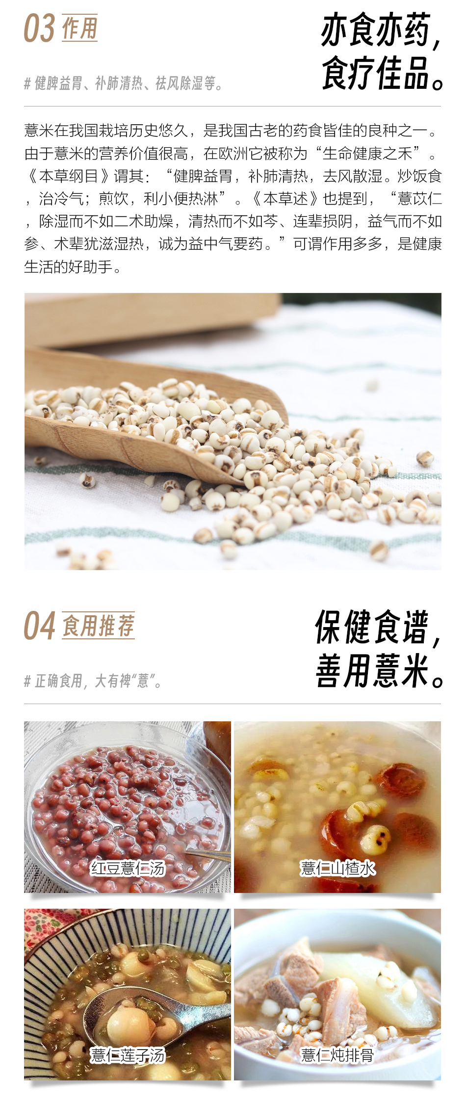 【注意事项】: 1、薏米开封后,高温高湿的情况下不耐储存。可以用不粘锅稍微炒一炒,在装密封罐,保存的可以久一些哦。 2、受天气或库存等原因影响快递可能偶有耽误,急单请发货前咨询客服,不接受没有提前沟通的拒收。 3、已发货后不接受没有沟通的退款申请。