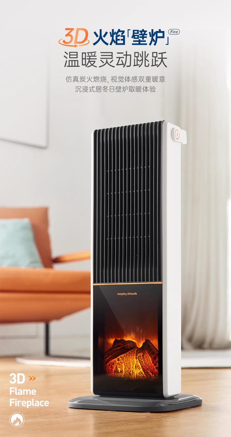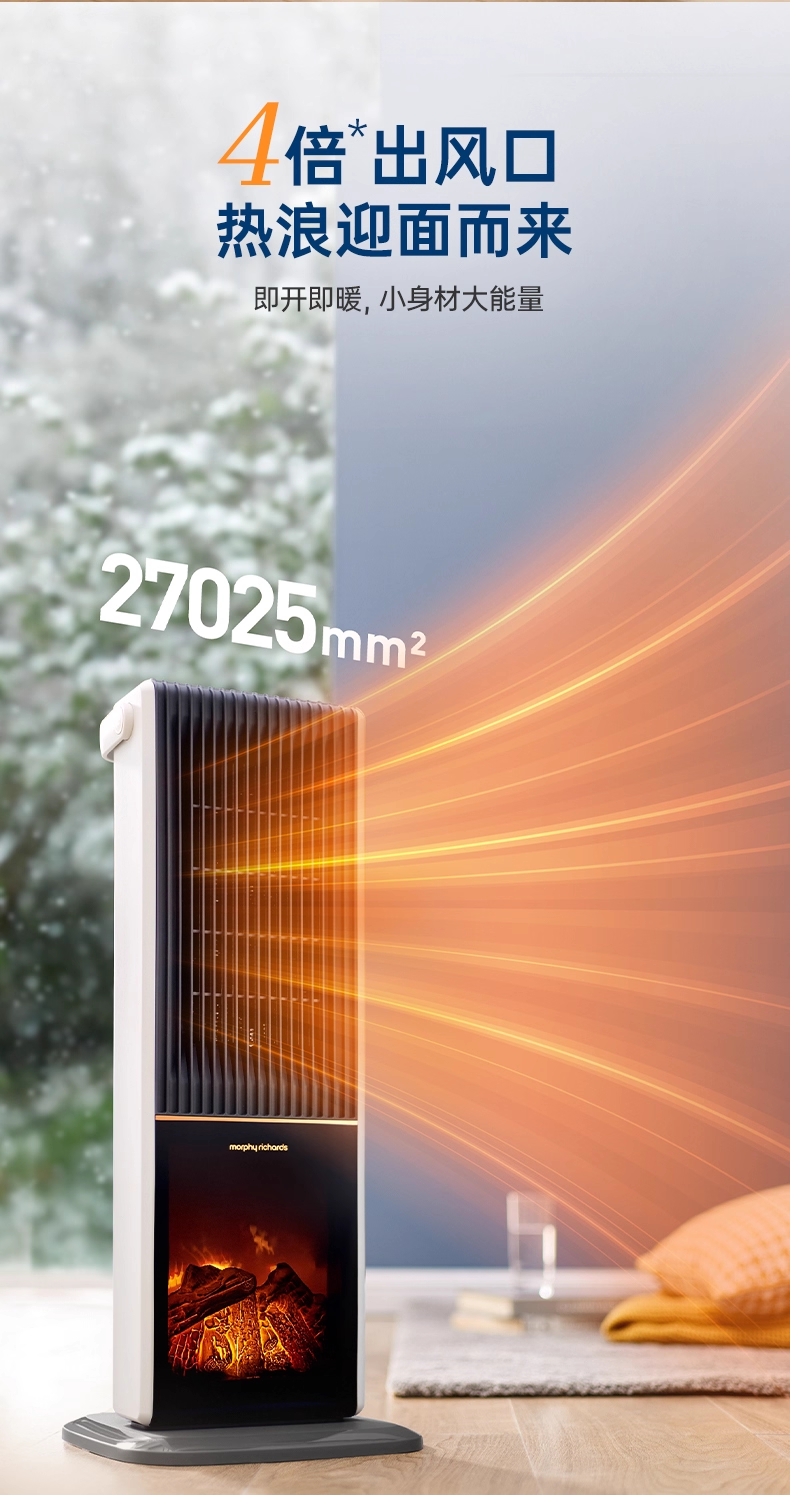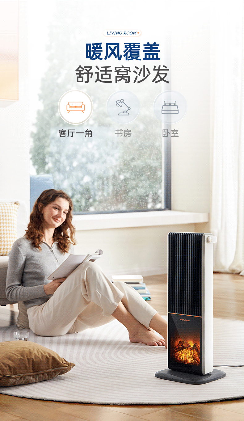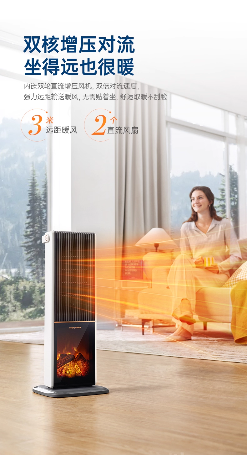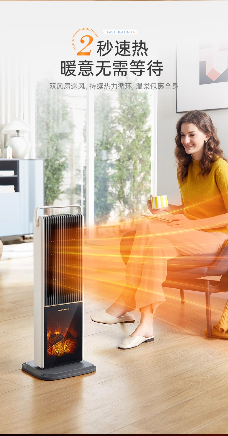 【看得见的温暖】 摩飞立式取暖器MR2029 纤薄机身 3D仿真炭火 石墨烯科技2秒速热 直流变频 节能省电 4倍大出风口 双核风轮 12H自动关机 配遥控器