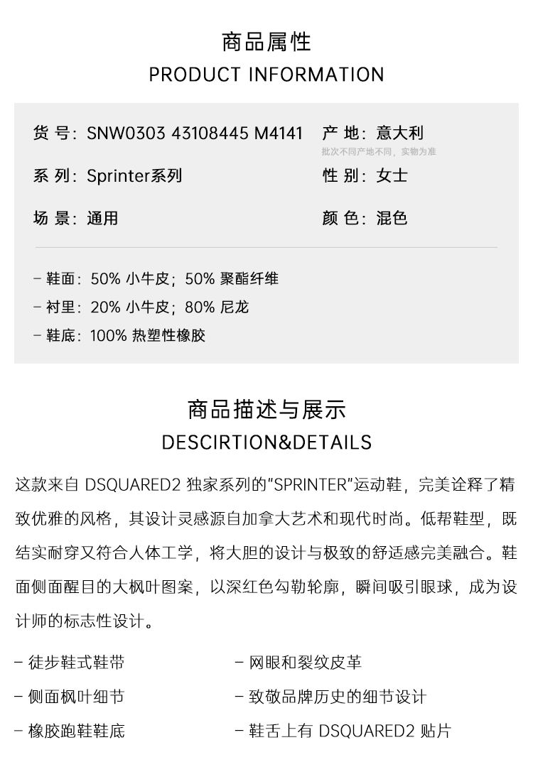 DSQUARED2 女士 Sprinter 侧枫叶图案运动鞋 混色 SNW0303 43108445 M4141