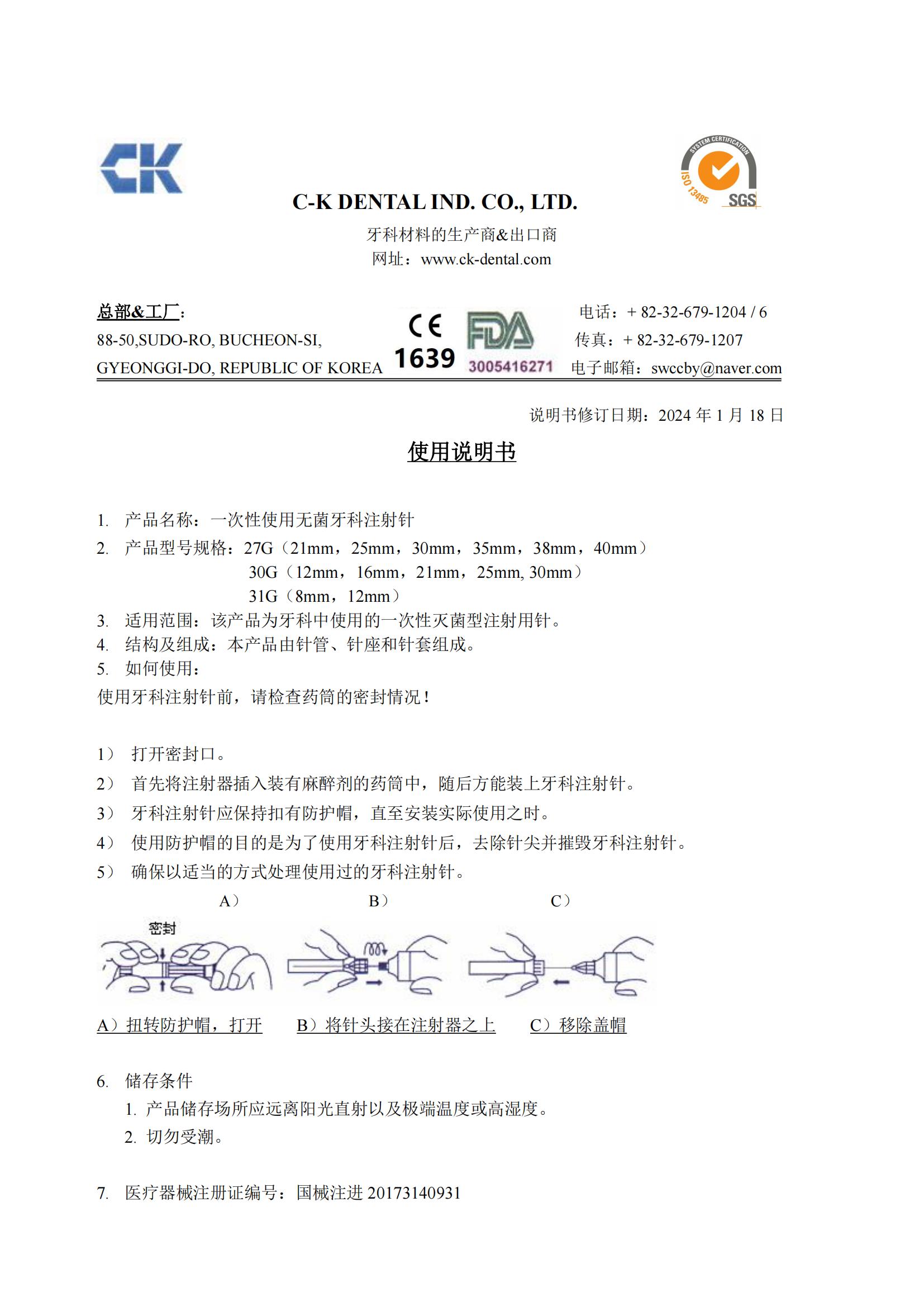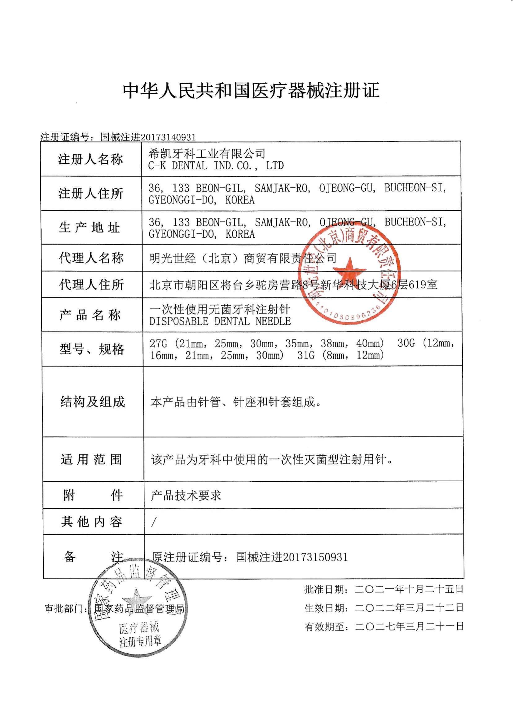 一次性使用无菌牙科注射针DISPOSABLE DENTAL NEEDLE(韩国C-K 一次性使用无菌牙科注射针 碧兰麻针头 100支)