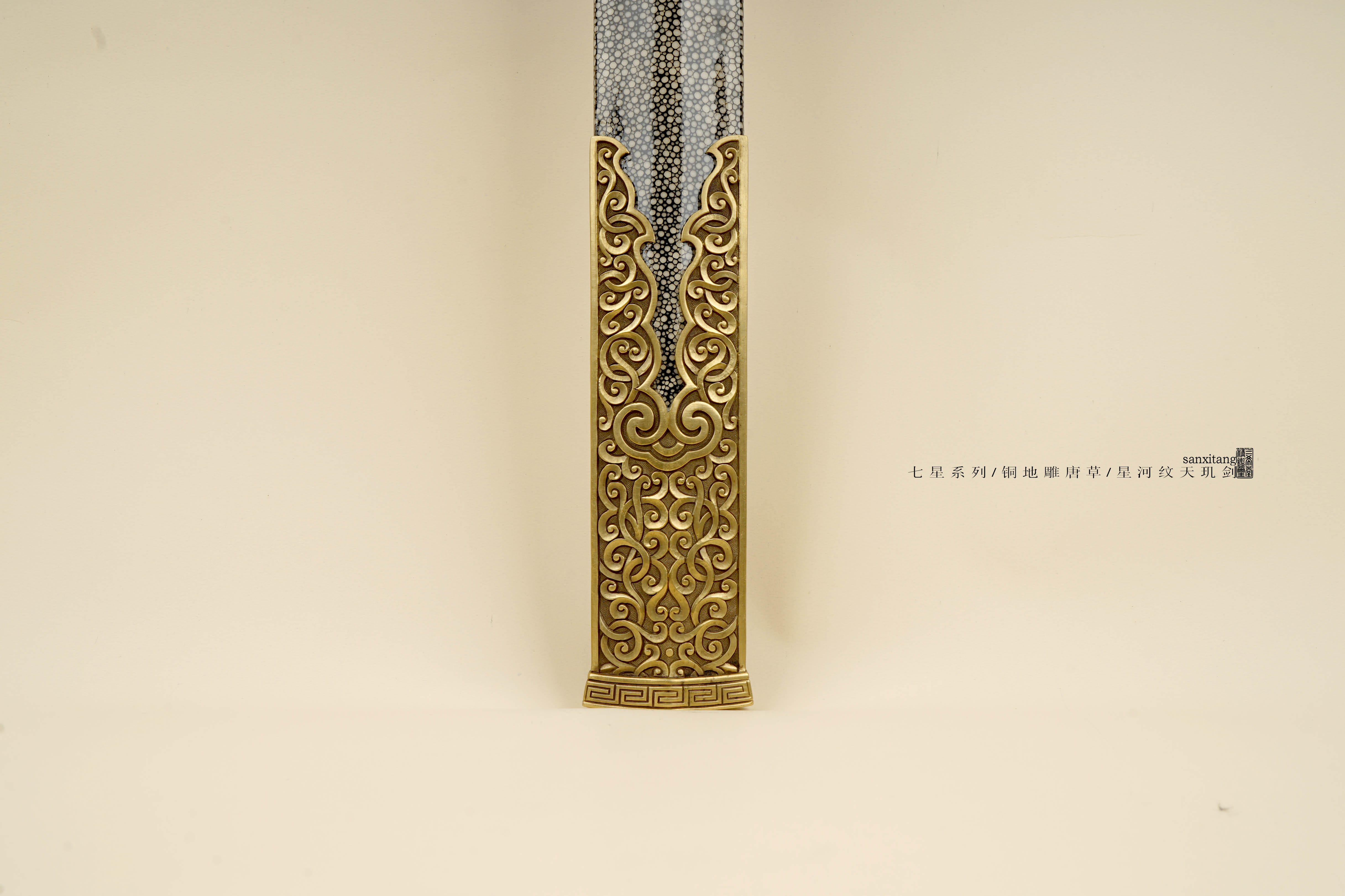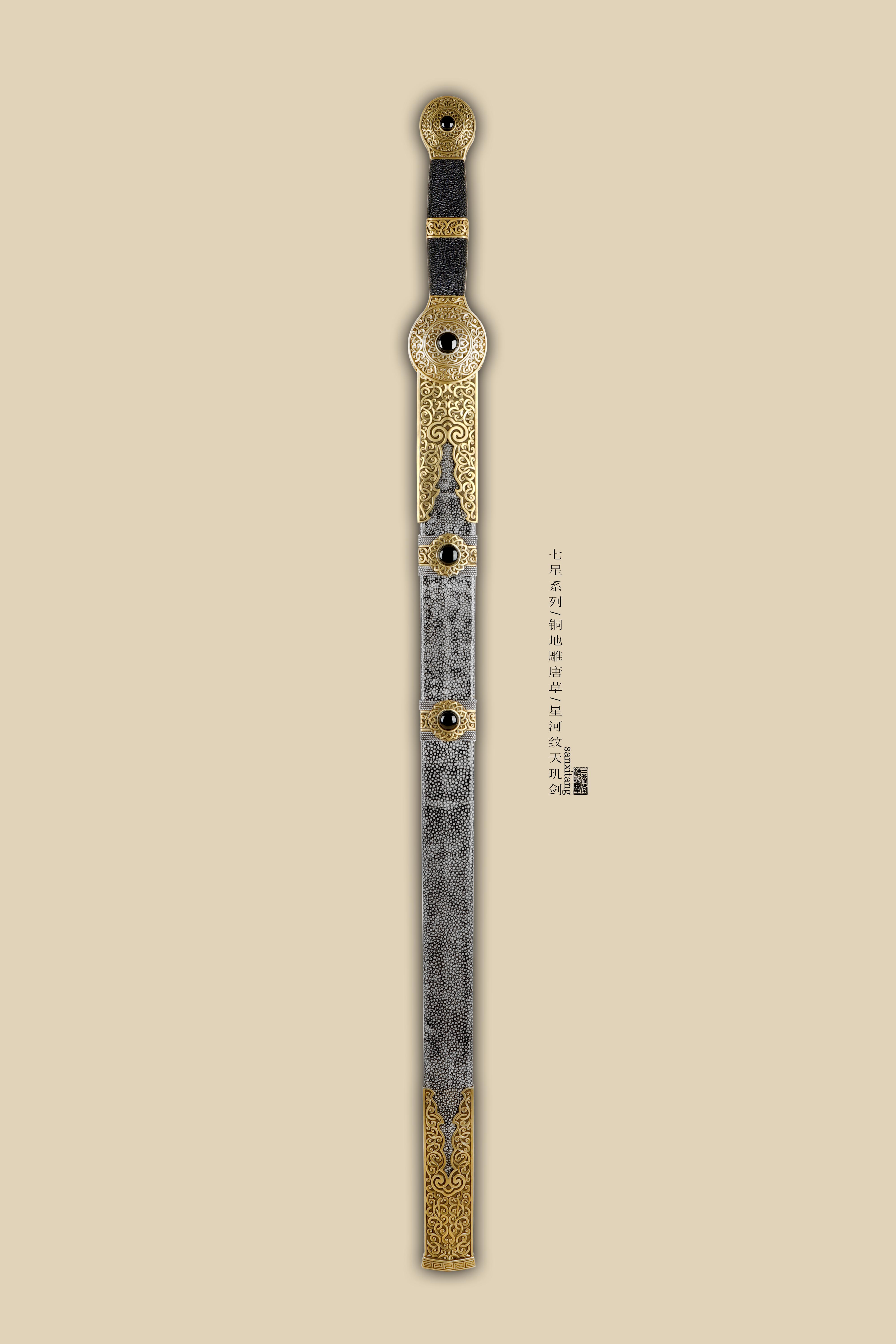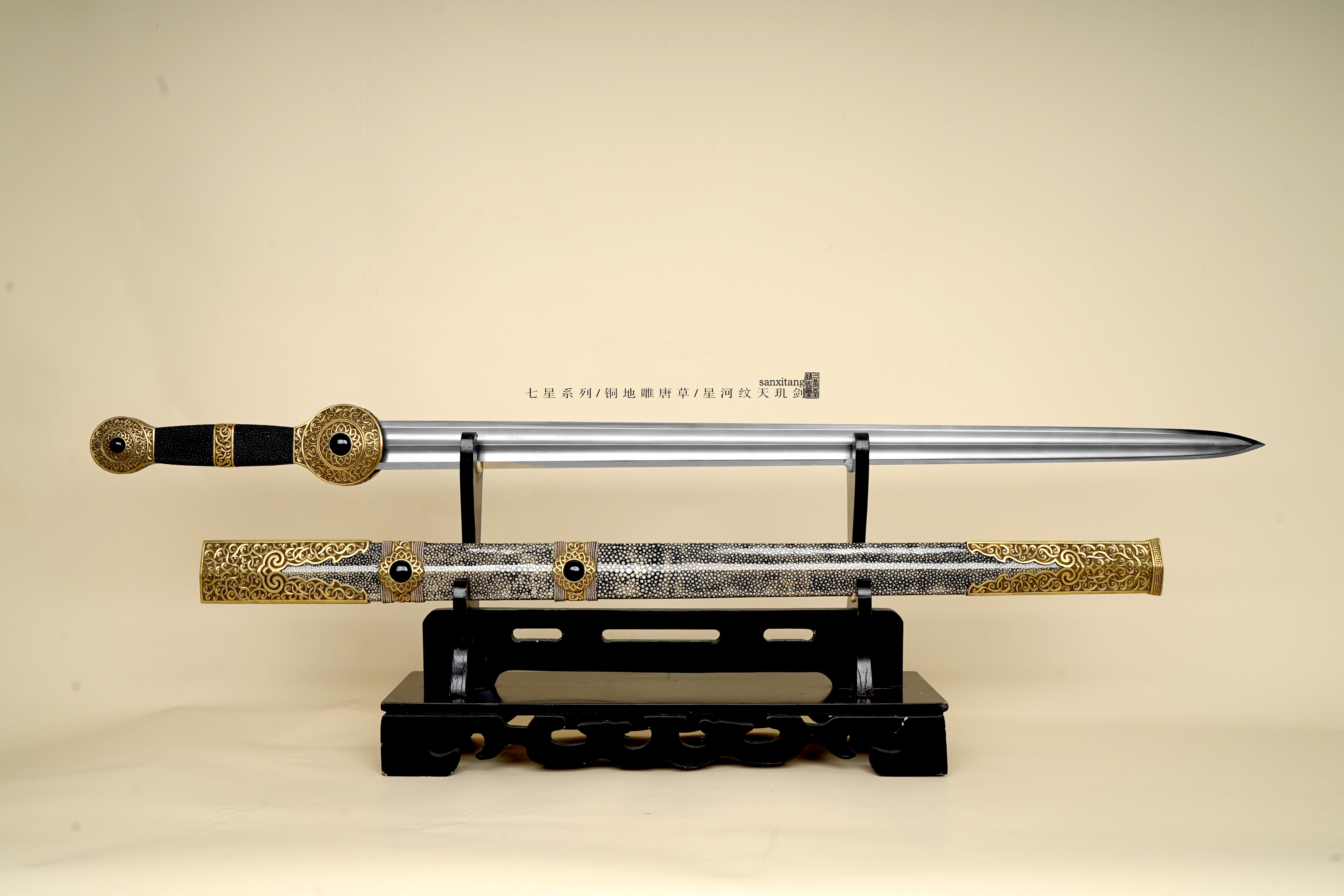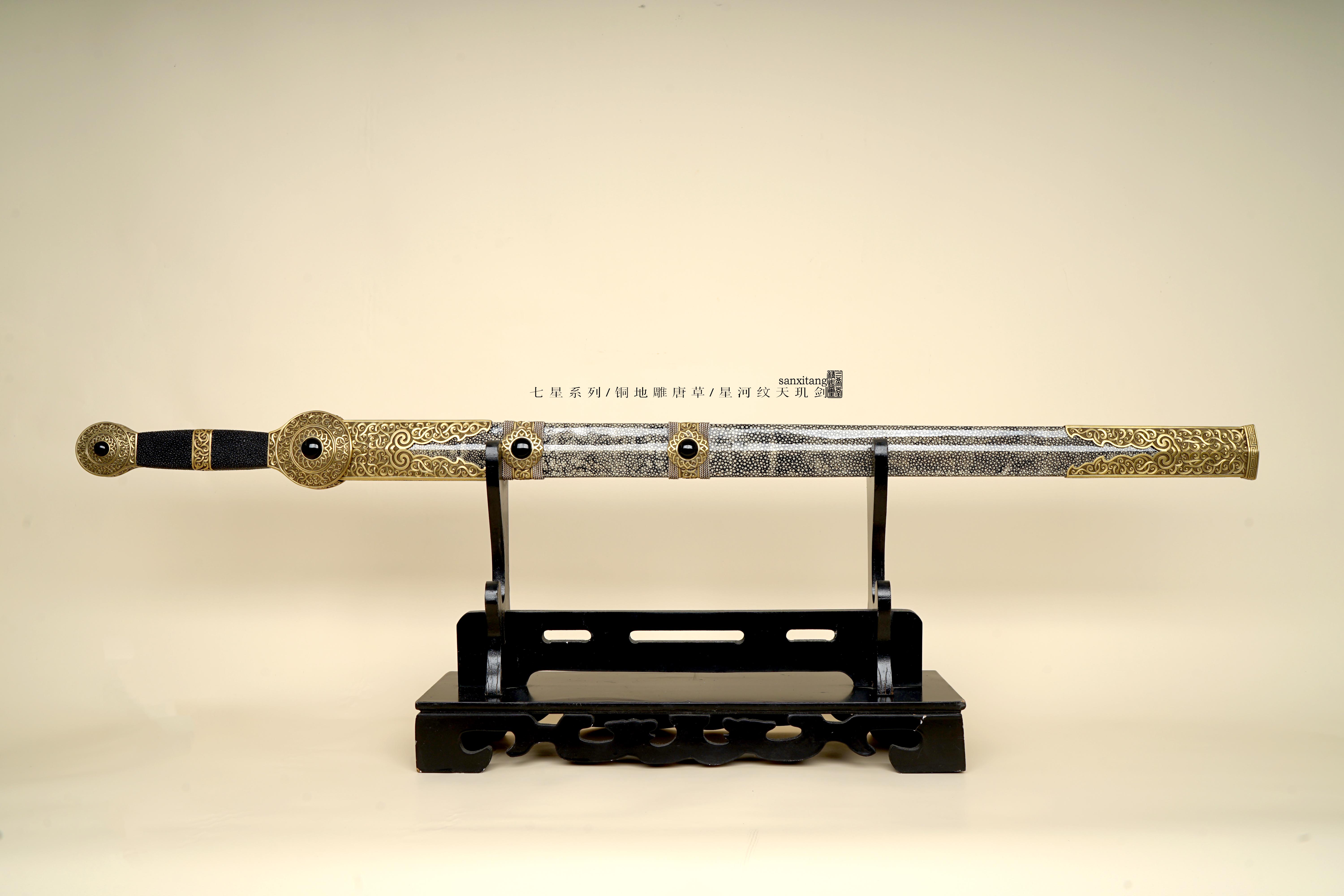 新出的星河纹版本天玑剑 全长105 全铜金具手工雕刻 这个雕刻的难度比普通的大一些 图案的层次 线条都把握的蛮不错的 雕出来的感觉相当生动 这只剑的纹路非常复杂雕刻难度可想而知 刃是我们自己锻的钢 扭转锻炼24000层星河纹 星星一上一下排布 和宇宙中繁星点点一样漂亮 开双槽手工研磨表面非常干净 两边研白更显档次 柄和鞘的型制有改变 柄做成了槌型方块 全包裹非常好的鱼皮 每张鱼皮只有肚子上一块是这样子带白点的 整体配起来还算可以 收藏送礼非常不错!