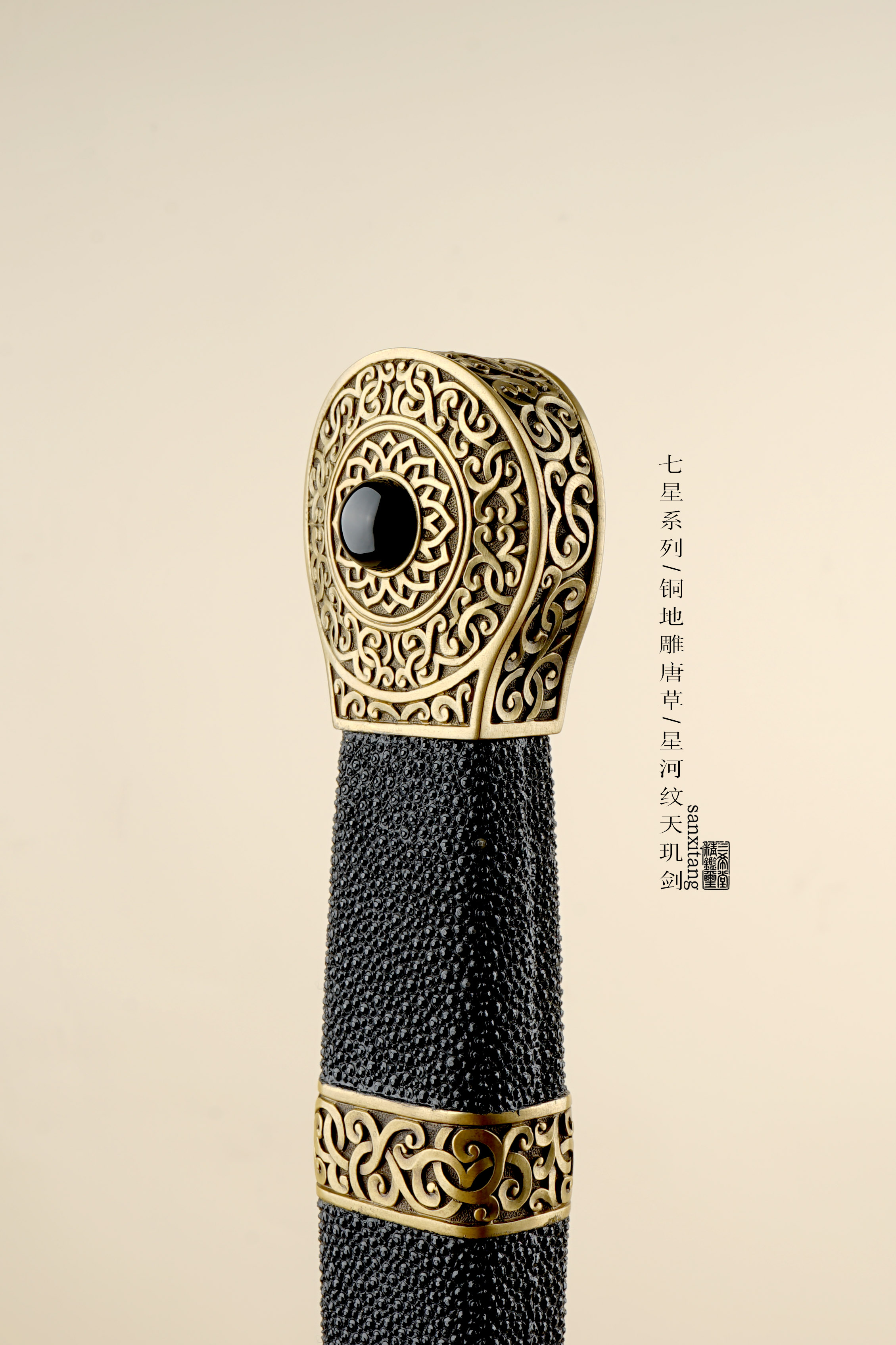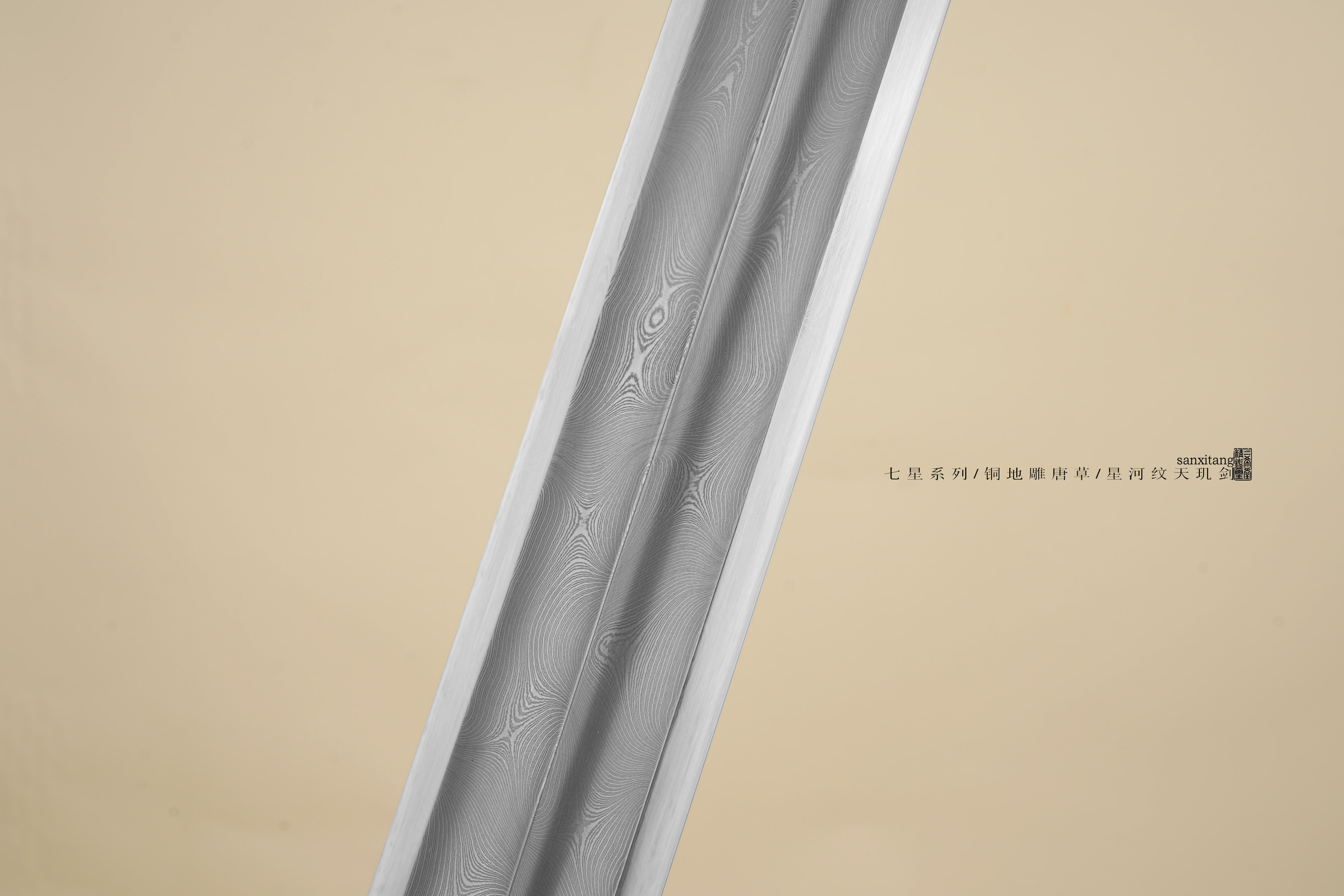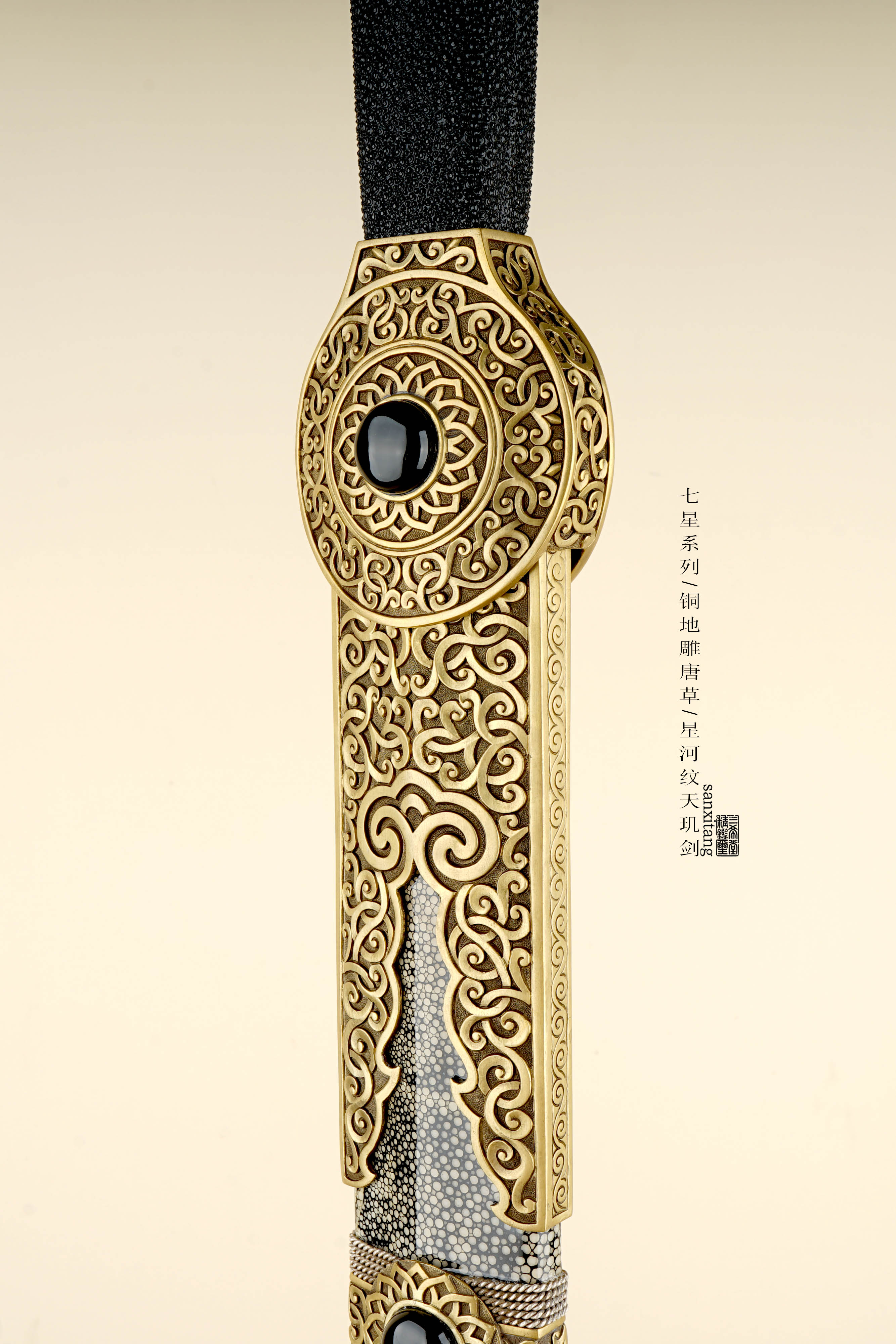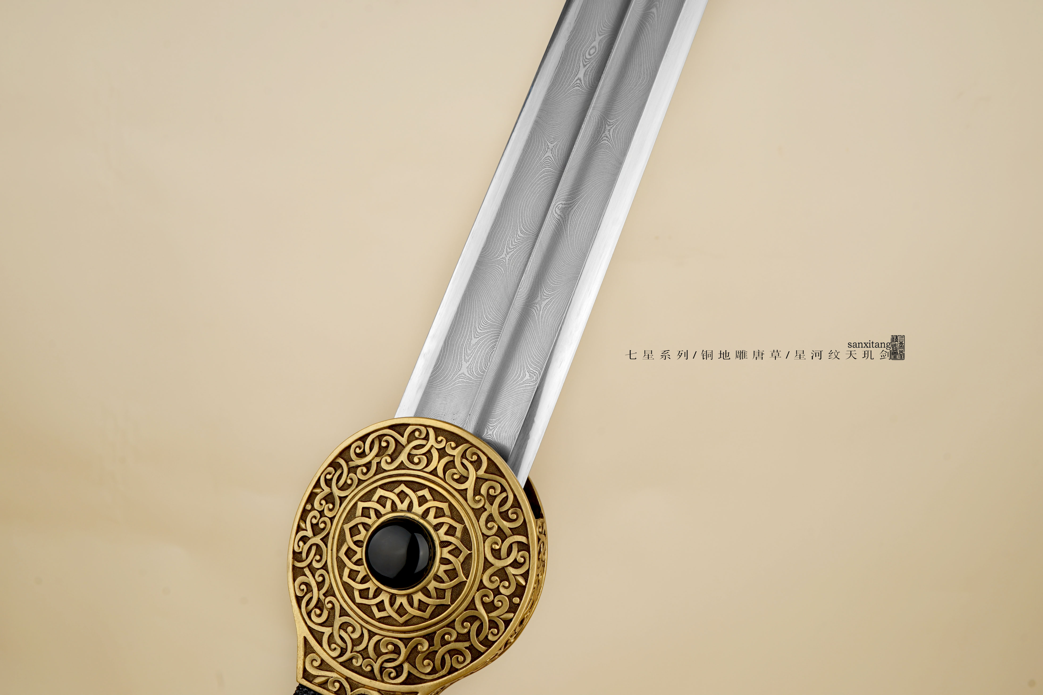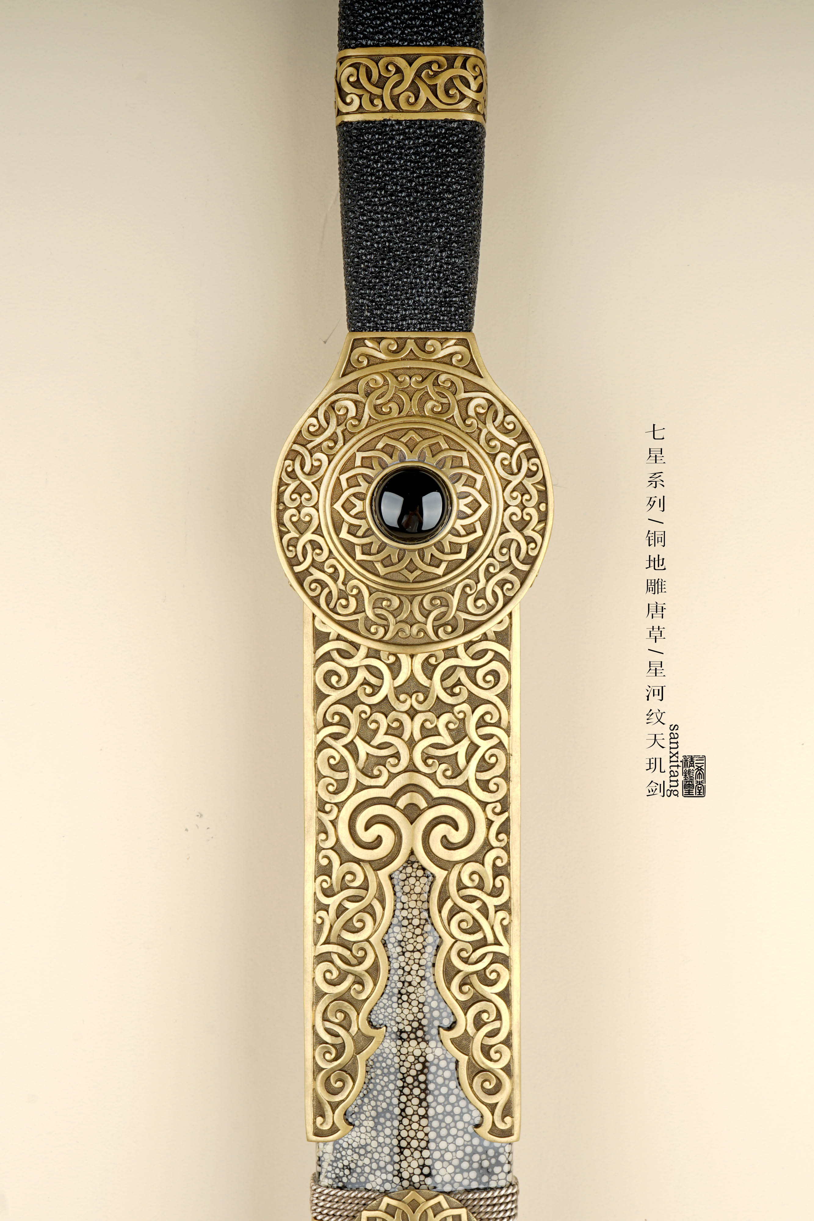 新出的星河纹版本天玑剑 全长105 全铜金具手工雕刻 这个雕刻的难度比普通的大一些 图案的层次 线条都把握的蛮不错的 雕出来的感觉相当生动 这只剑的纹路非常复杂雕刻难度可想而知 刃是我们自己锻的钢 扭转锻炼24000层星河纹 星星一上一下排布 和宇宙中繁星点点一样漂亮 开双槽手工研磨表面非常干净 两边研白更显档次 柄和鞘的型制有改变 柄做成了槌型方块 全包裹非常好的鱼皮 每张鱼皮只有肚子上一块是这样子带白点的 整体配起来还算可以 收藏送礼非常不错!