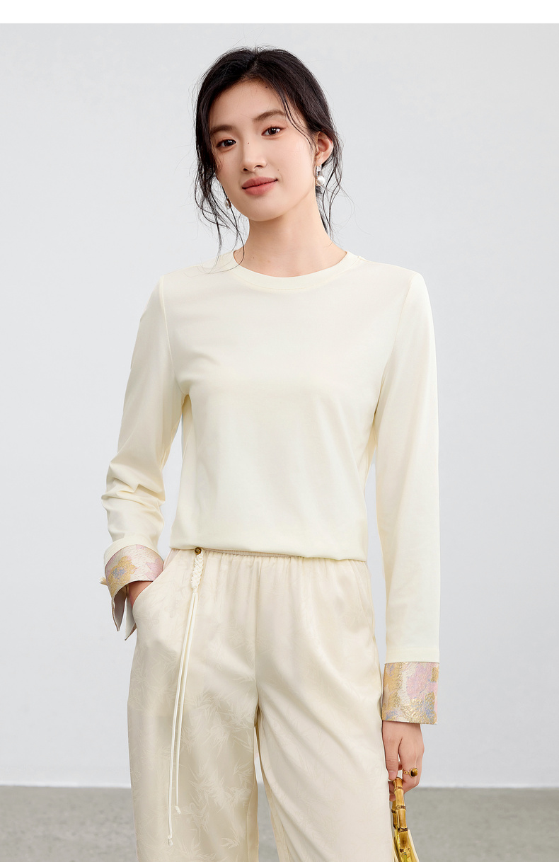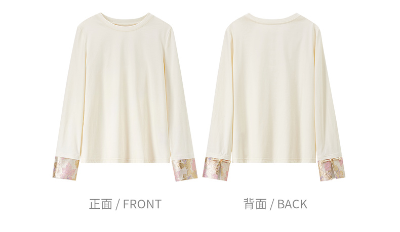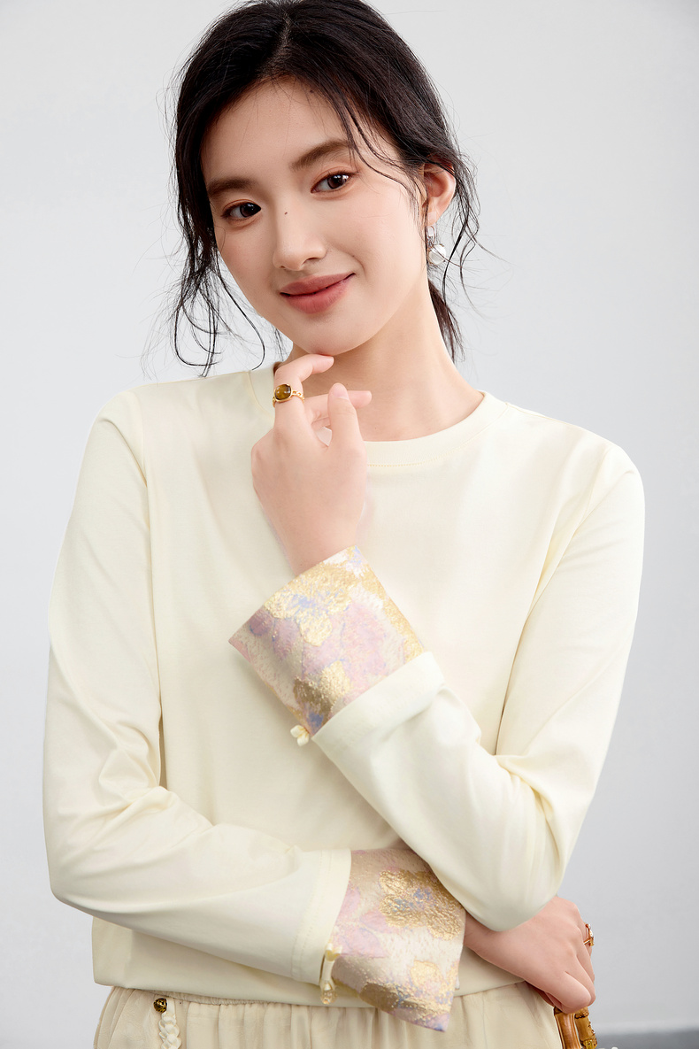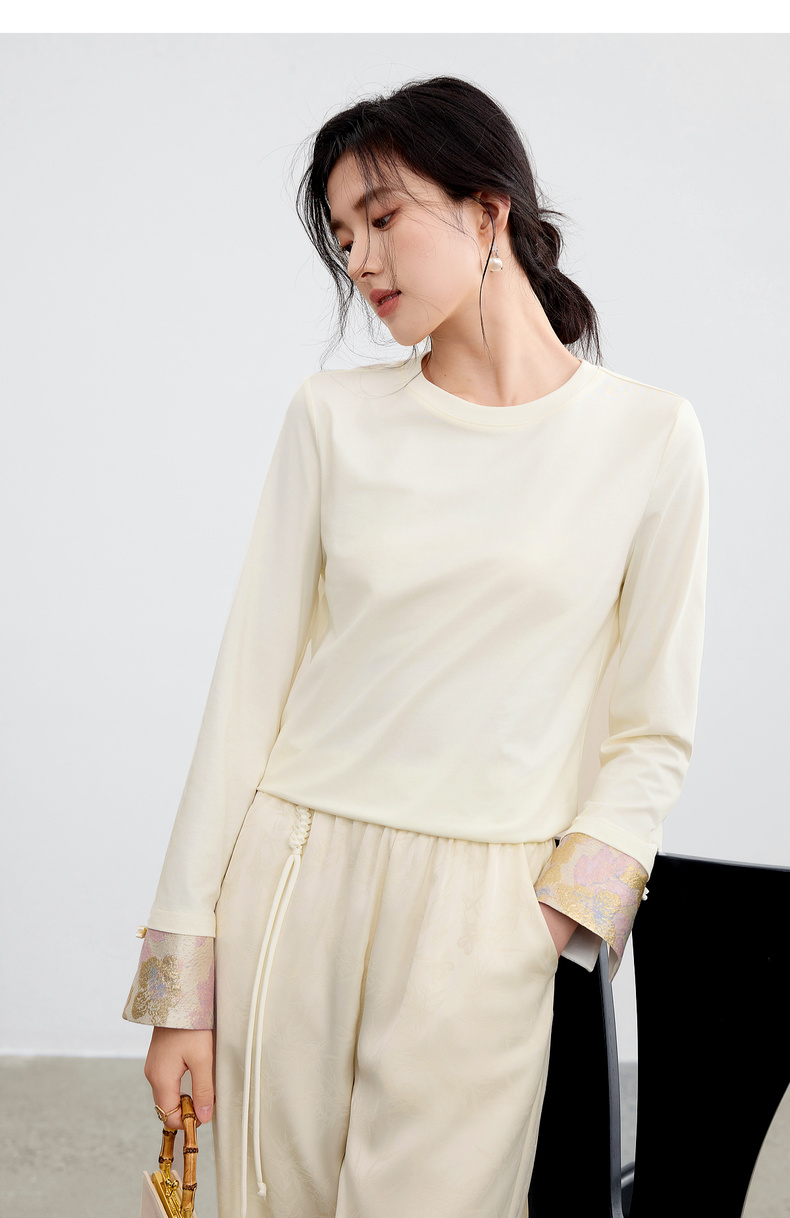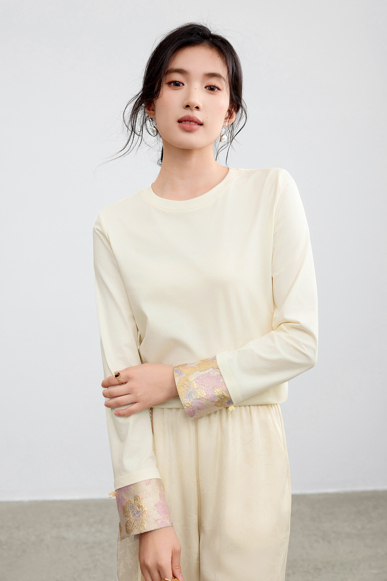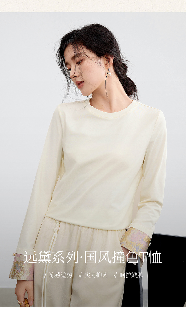 【内购】【唐宋远黛系列】吸湿速干凉感抑菌国风圆领拼接提花织锦长袖T恤-153TM3149