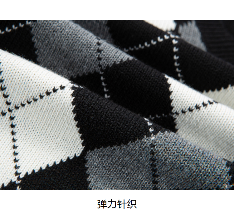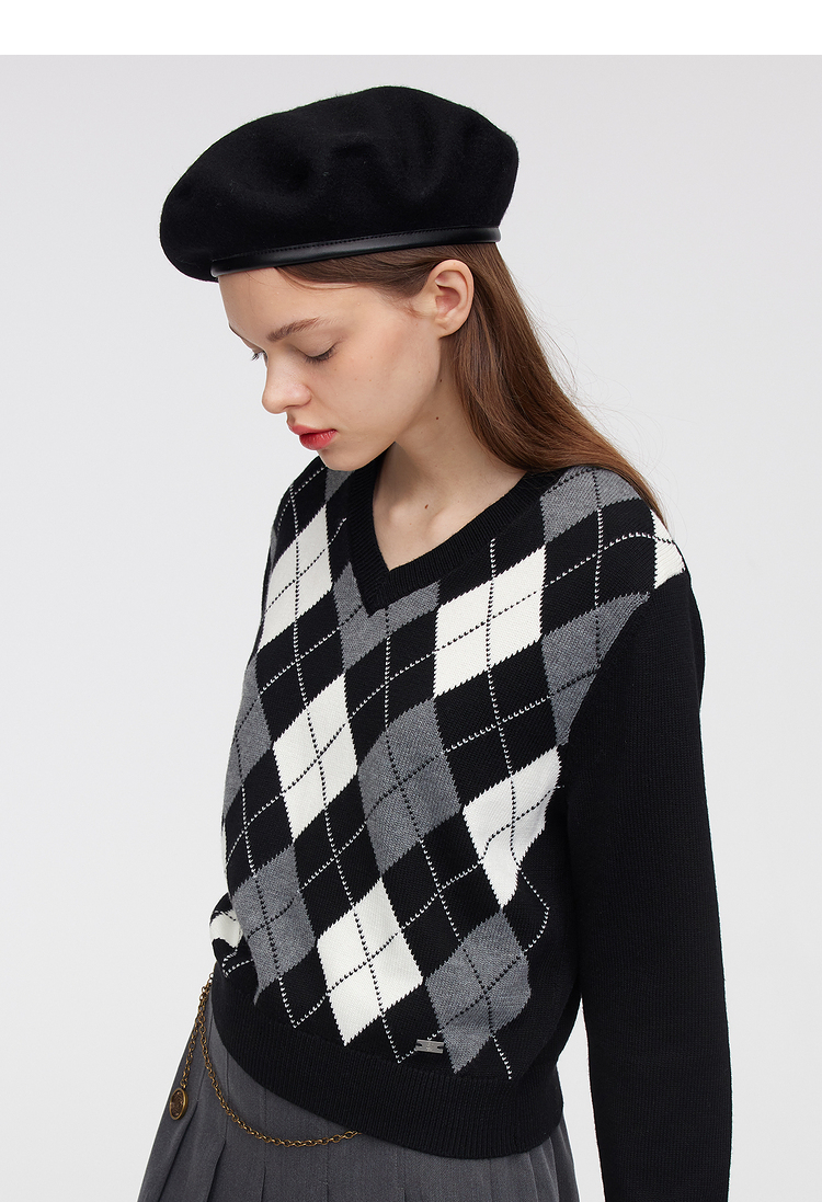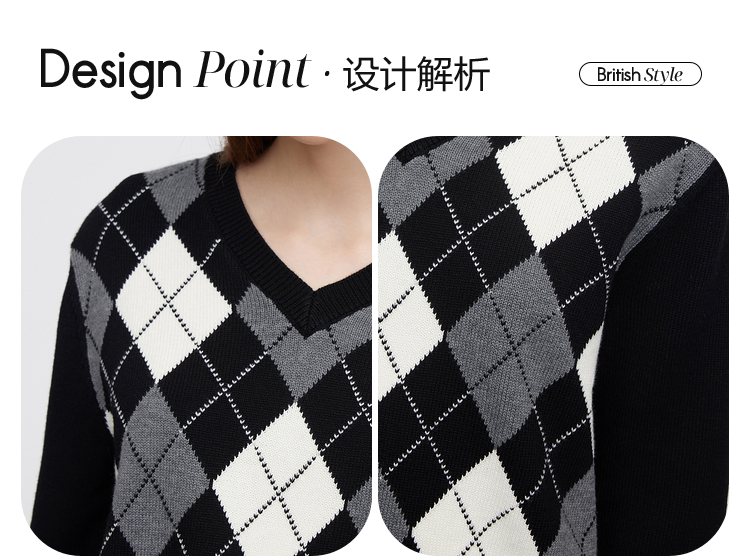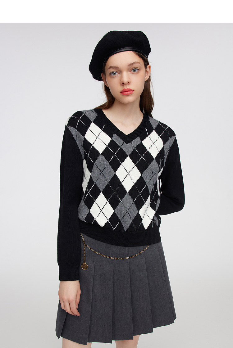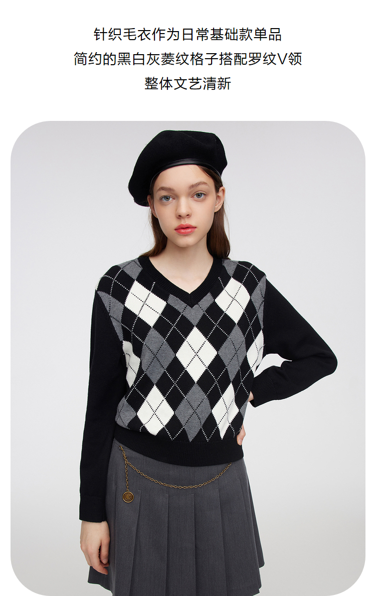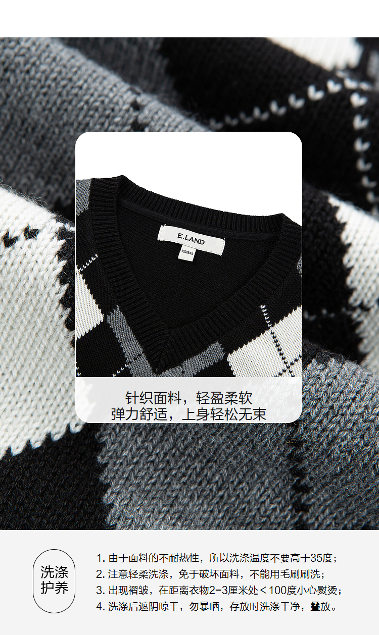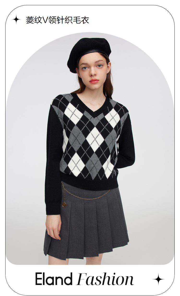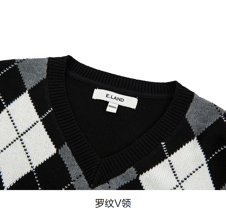 ELAND衣恋简约黑白菱纹V菱针织毛衣EEKWC12H3B