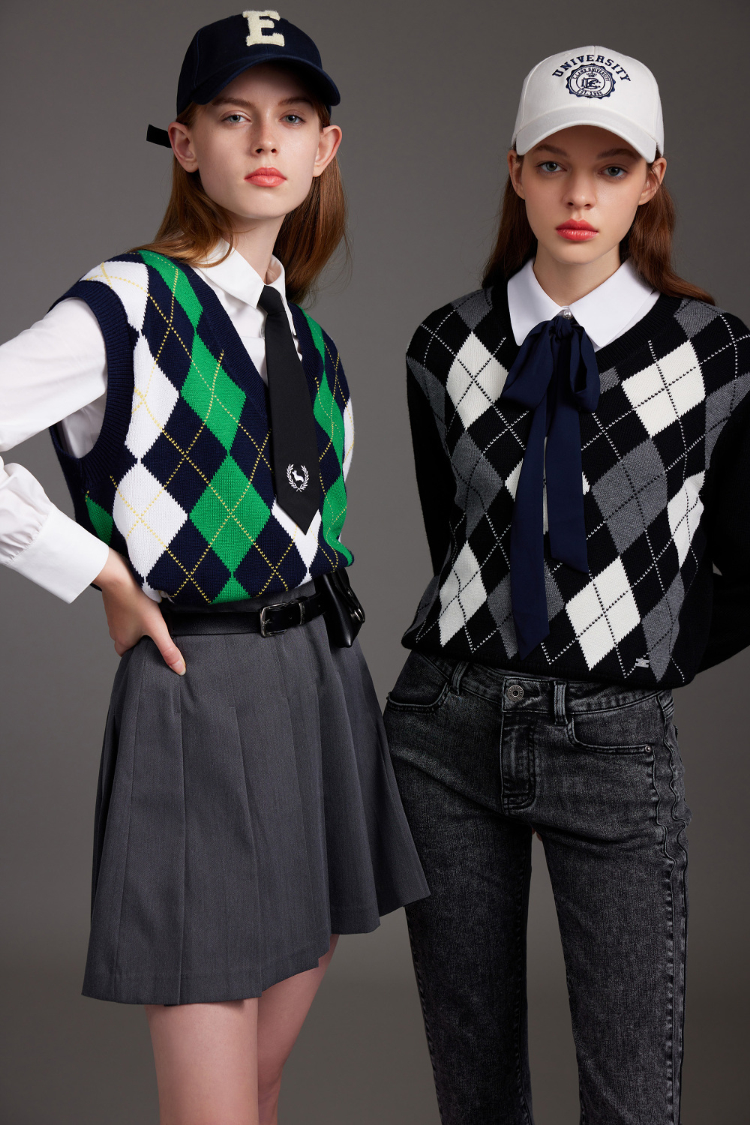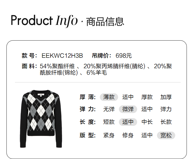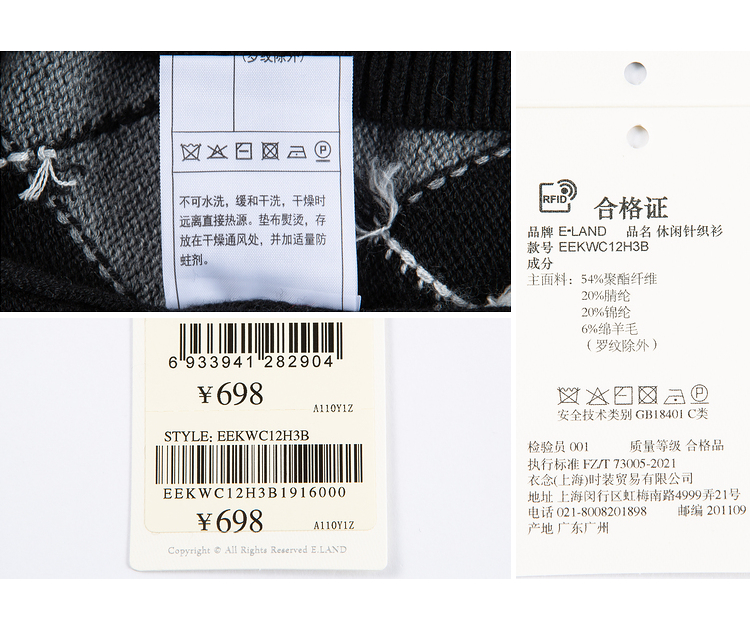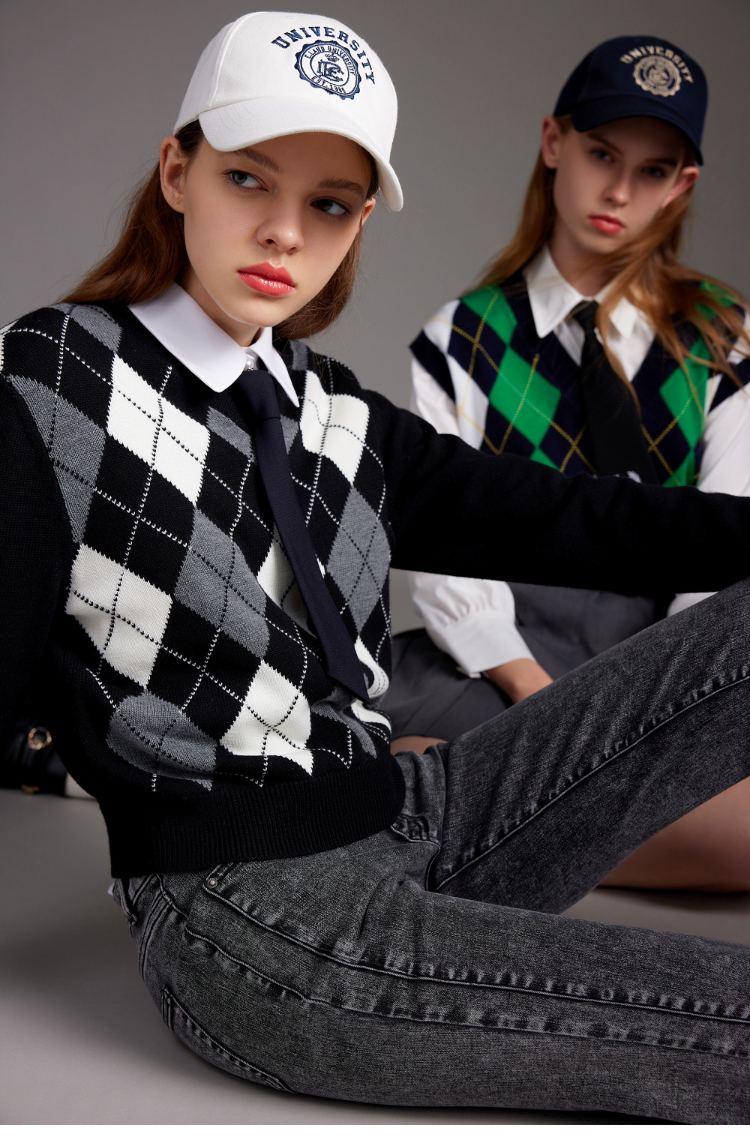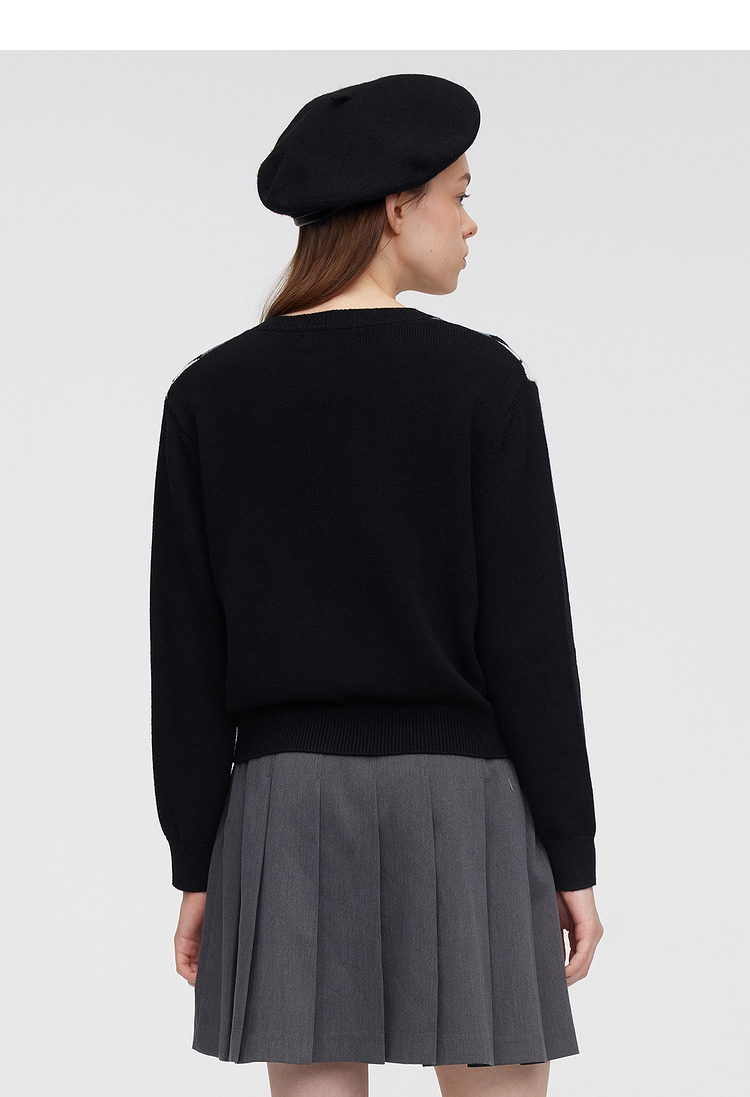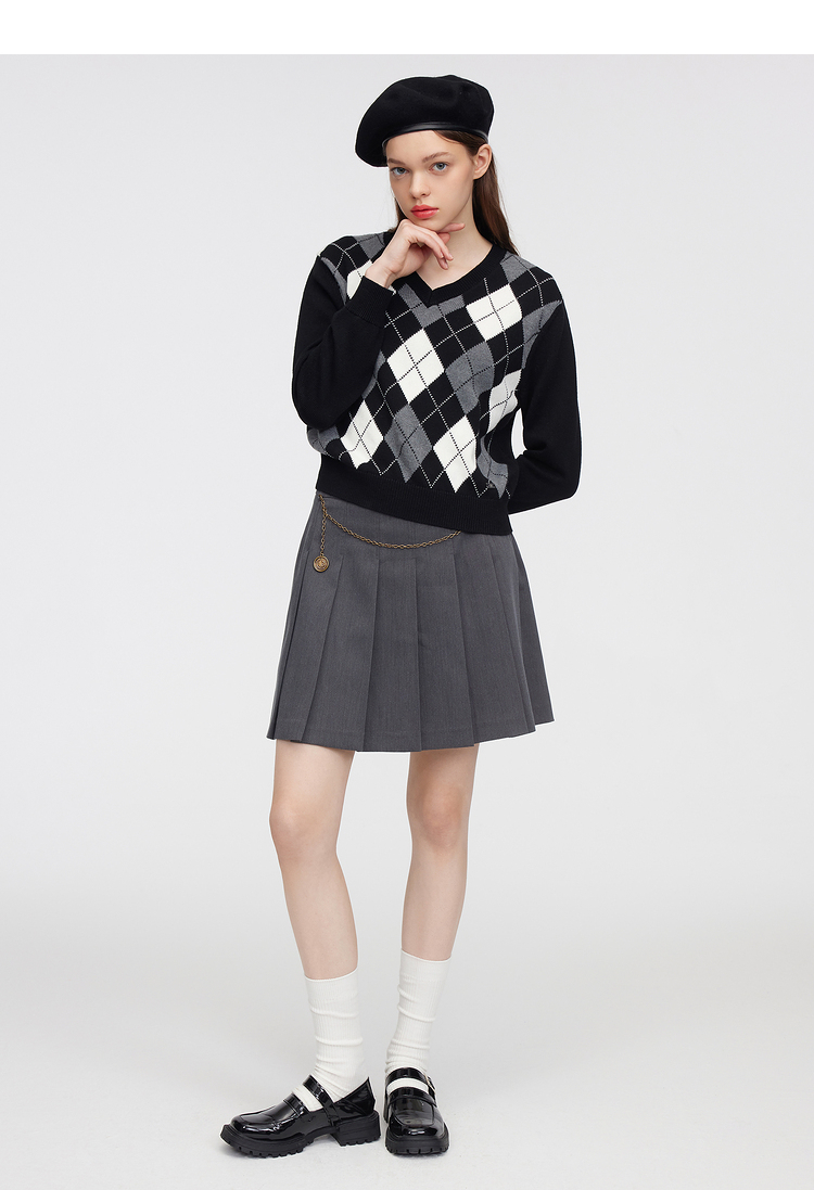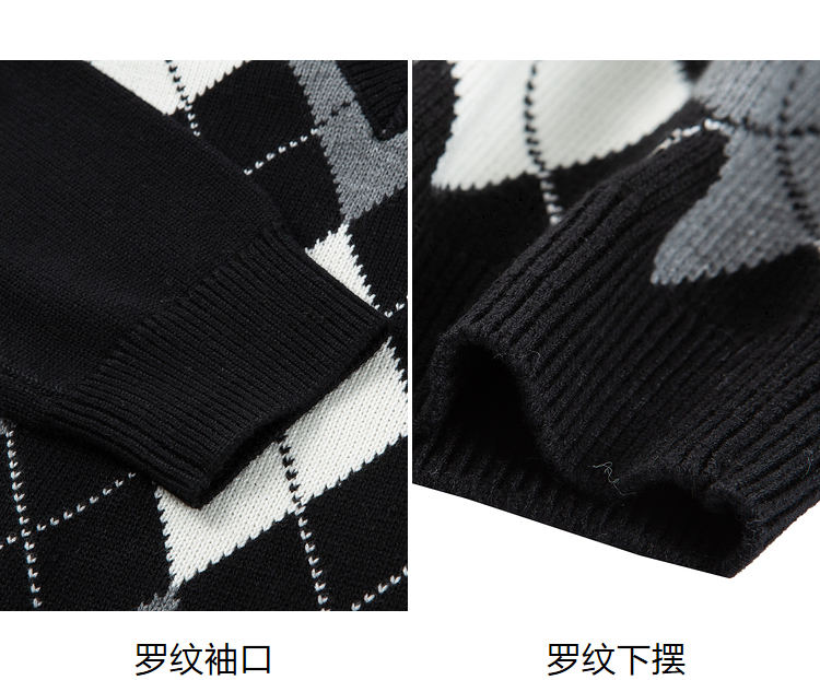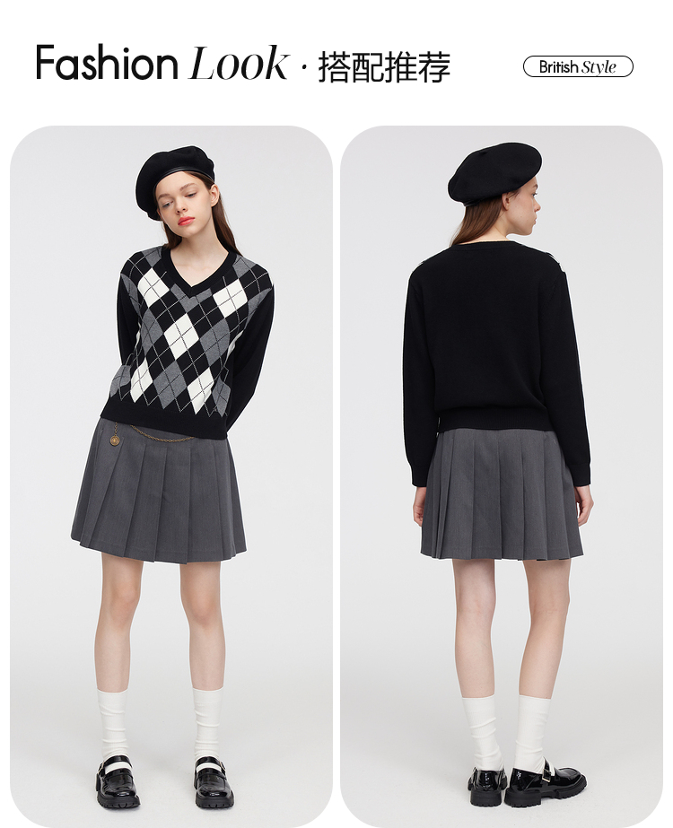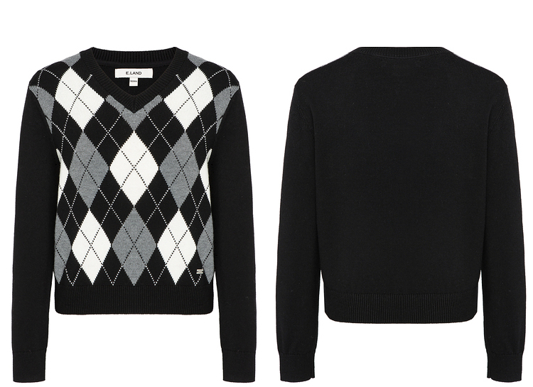 ELAND衣恋简约黑白菱纹V菱针织毛衣EEKWC12H3B