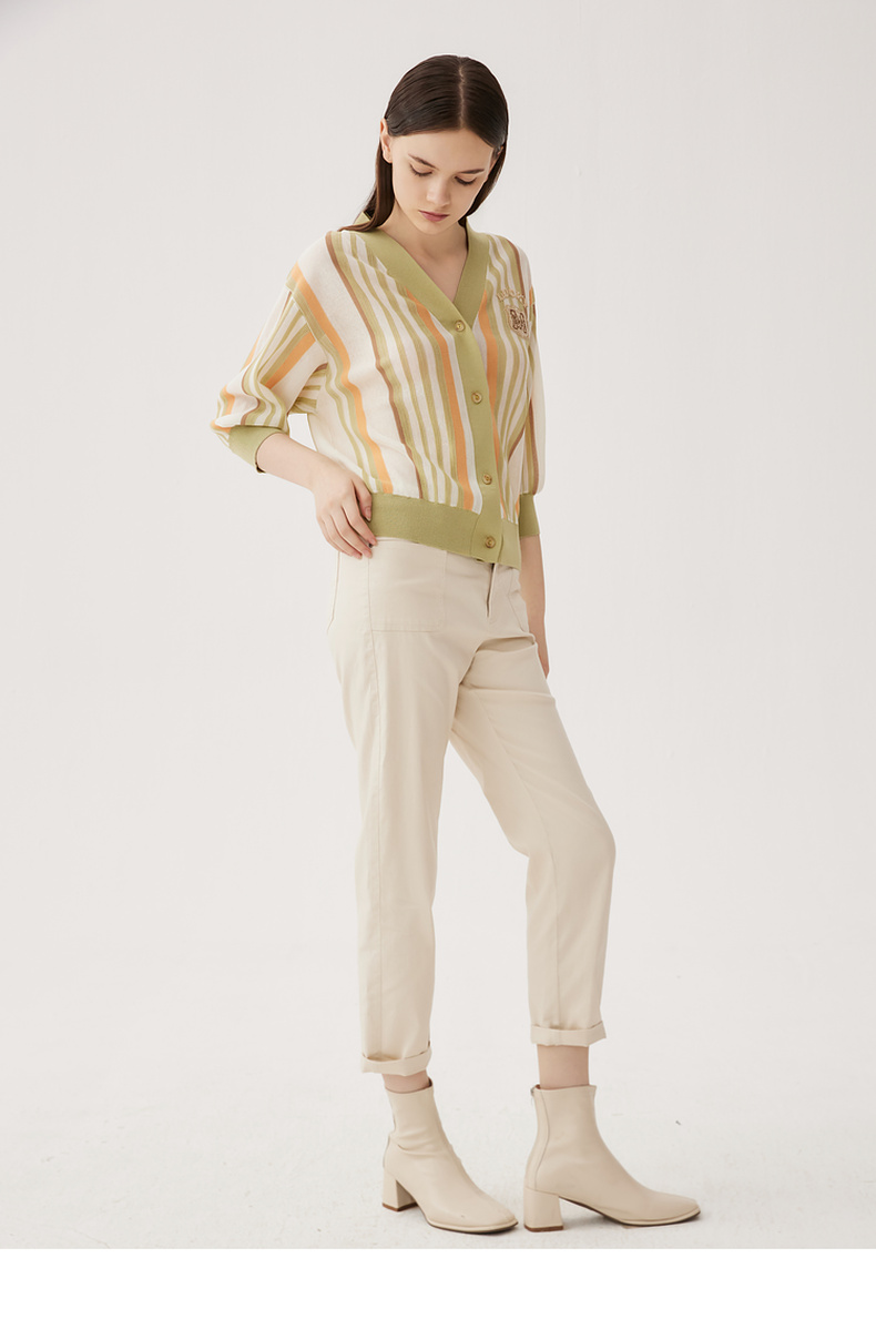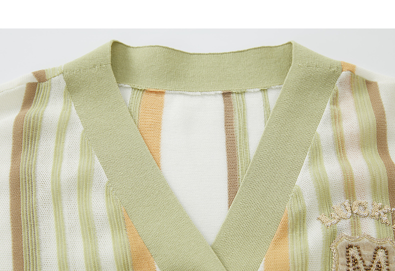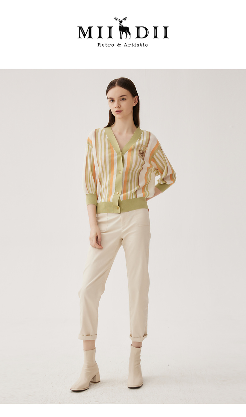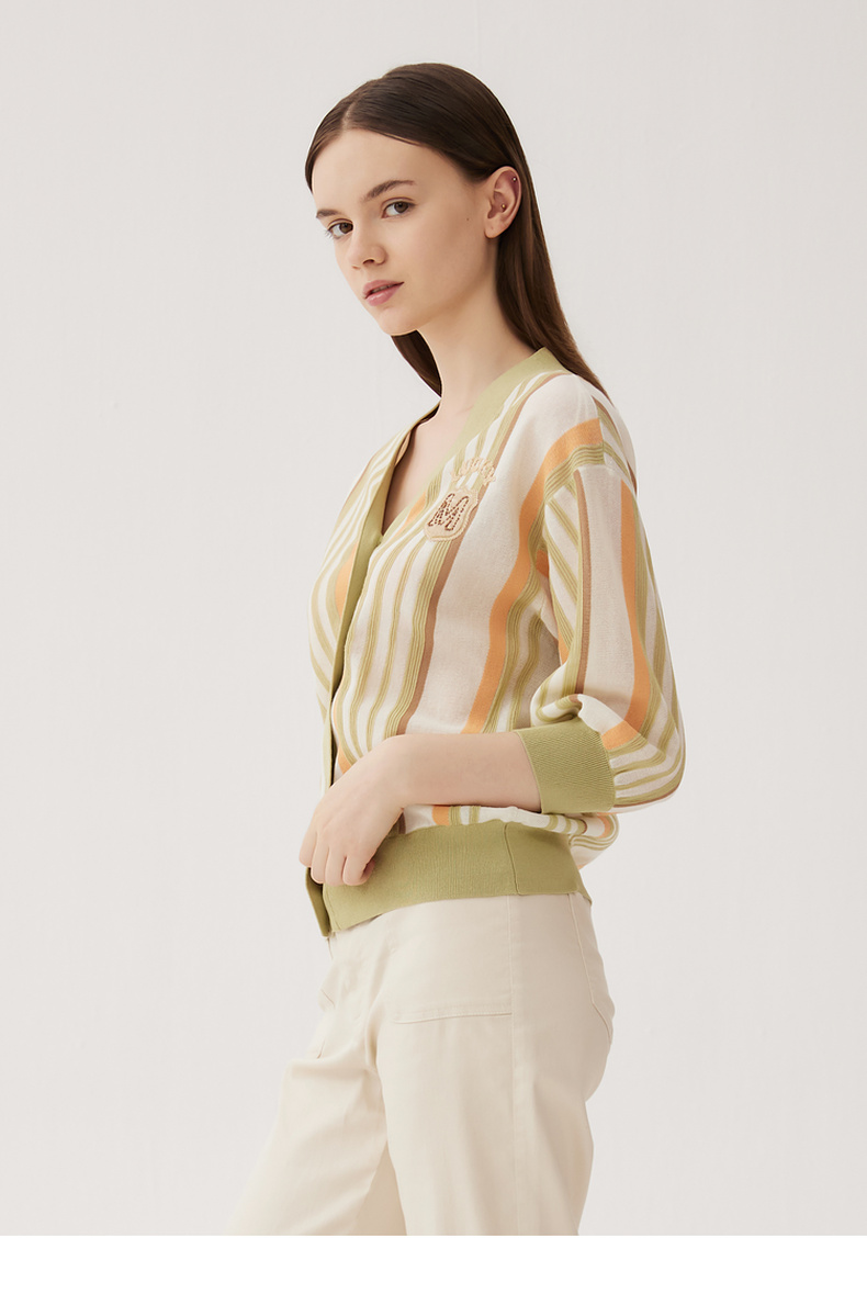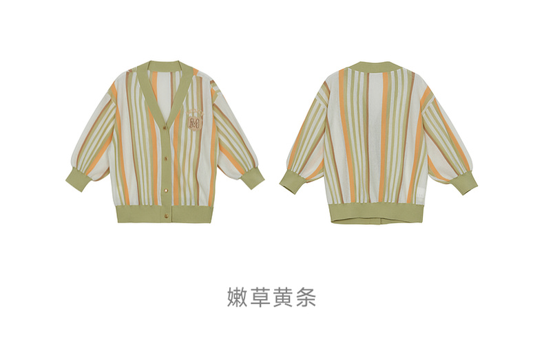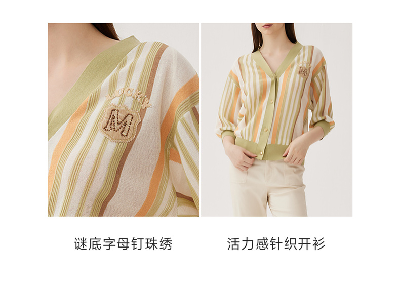 谜底针织开衫分袖女2024秋季新品文艺风彩条V领短款毛衫243MZ1261